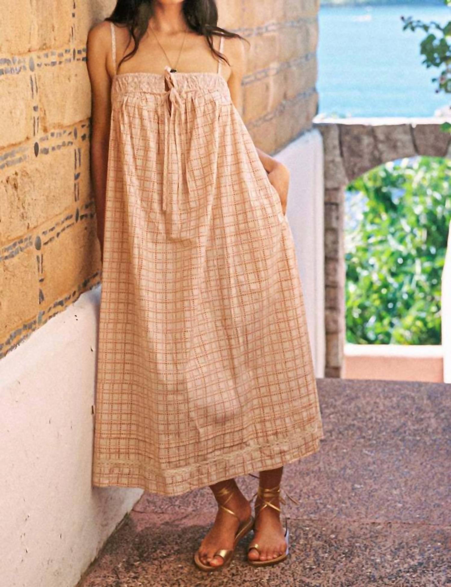 A maxi dress that is just as cute as it is comfortable. Meet the Agostina Dress by CIAO LUCIA, a must-have for your spring vacation wardrobe. This plaid & check dress is designed with spaghetti straps and is crafted from breathable cotton, ideal for warm weather. The shift dress features a square neckline and an adjustable tie closure that adds a charming touch. Conveniently equipped with pockets, it is easy to maintain with machine wash and line dry care instructions.