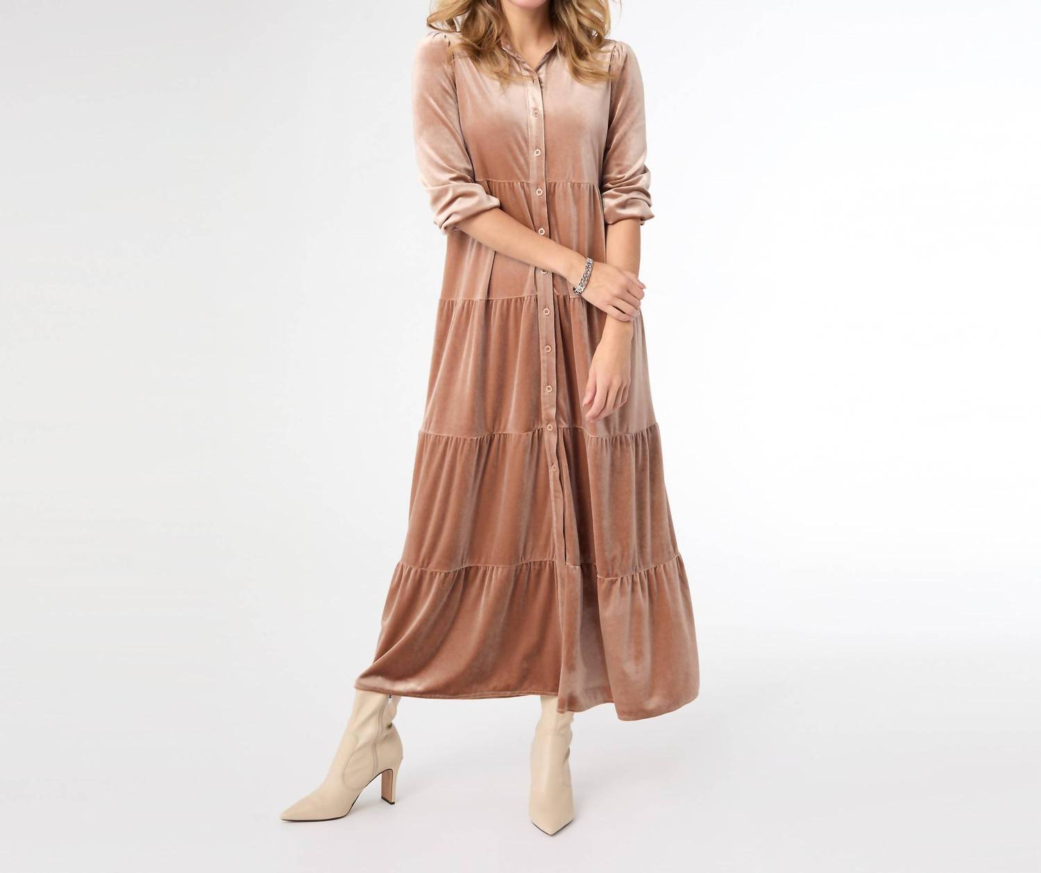 A maxi dress that is just as cute as it is comfortable. Introducing the Romance Imagined Velour Dress by COCO + CARMEN, a sophisticated addition to your wardrobe in an enchanting Apricot Buff hue. This long-sleeve maxi dress features a relaxed fit with a soft, stretchy drape that elegantly flows into an A-line silhouette. Crafted from a luxurious viscose blend, it's made in China, highlighting a beautiful cowlneck and adorned with a button closure. Ideal for a dinner party or holiday gathering, care is easy with machine wash instructions, and the elegant design ensures you transition seamlessly from day to night, wearing size S/M for a height of 5'10", 32" bust, 25" waist, and 35" hips.