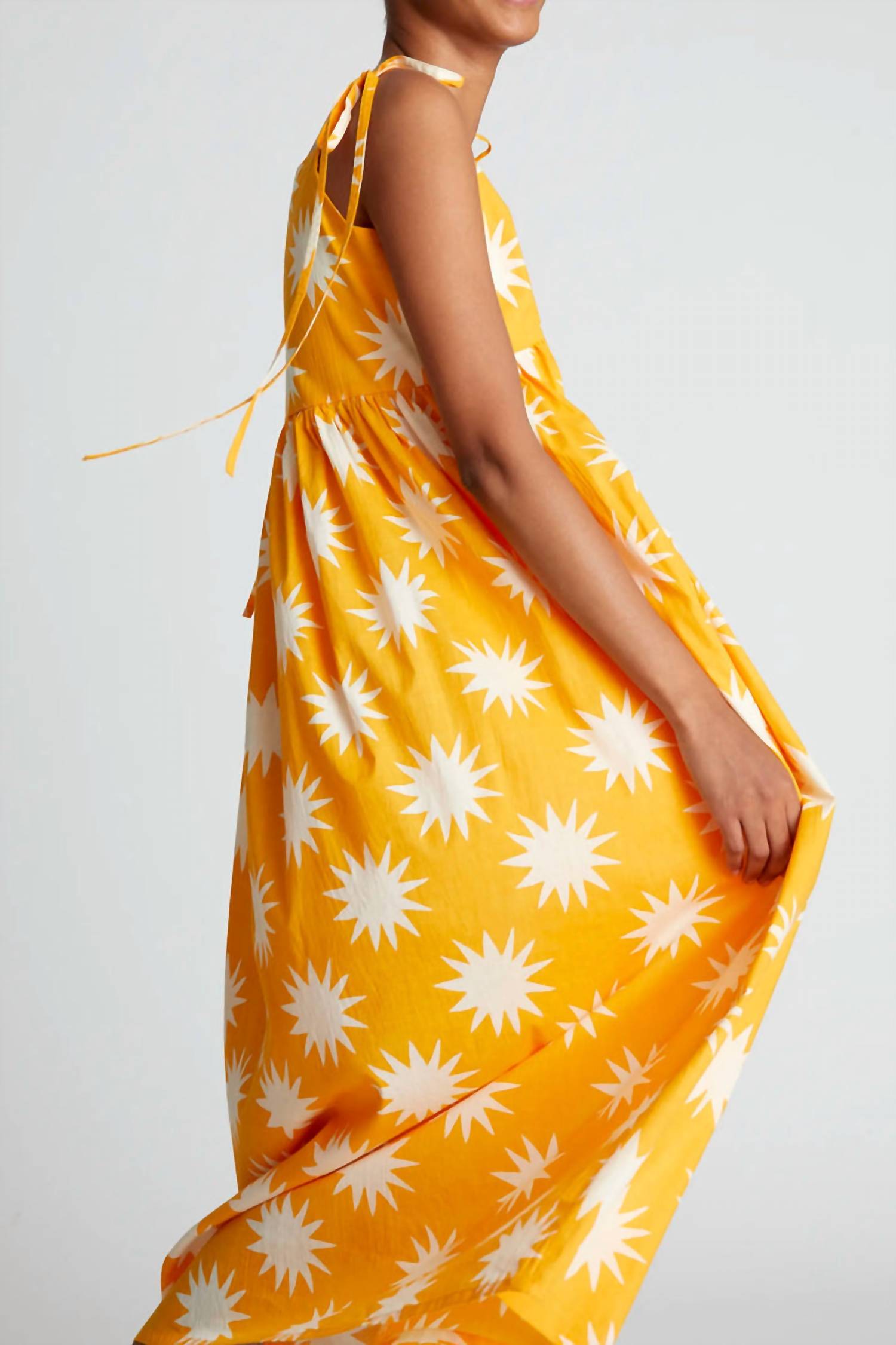 Who doesn't love a good maxi dress? This one you'll be reaching for season after season. Introducing the Strappy Maxi Dress by Compania Fantastica in Big Sun Yellow, a perfect choice for vibrant summer outings. This sleeveless dress, crafted from comfortable cotton, showcases a striking big sun print that embodies a boho chic vibe. It features a square neckline and adjustable tie straps for a personalized fit, with a pull-on closure for easy wear. The relaxed shift silhouette at a maxi length ensures effortless movement, ideal for vacation escapes. Care: Machine wash.