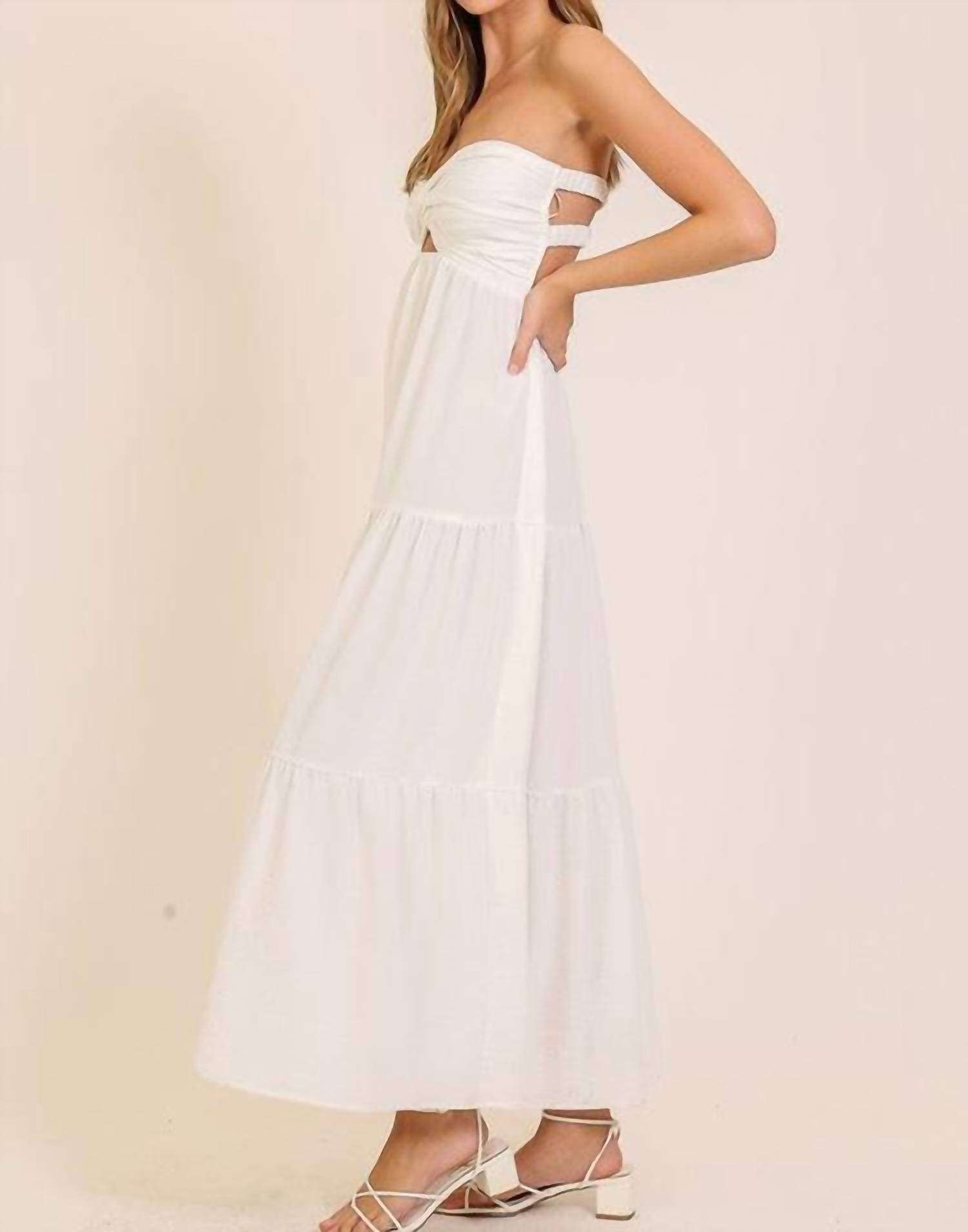 Who doesn't love a good maxi dress? This one you'll be reaching for season after season. Embrace effortless elegance with the Sunset Layers Maxi Dress by Cotton Candy LA. This strapless beauty in ivory features a flowy, tiered design, ideal for making a statement on any beach day. Crafted from 100% Cotton, its pull-on closure and smocked bodice ensure a secure fit, while cascading layers add movement and sophistication. Care for this boho chic dress by hand washing separately in cold water, line drying, and ironing with warm heat.