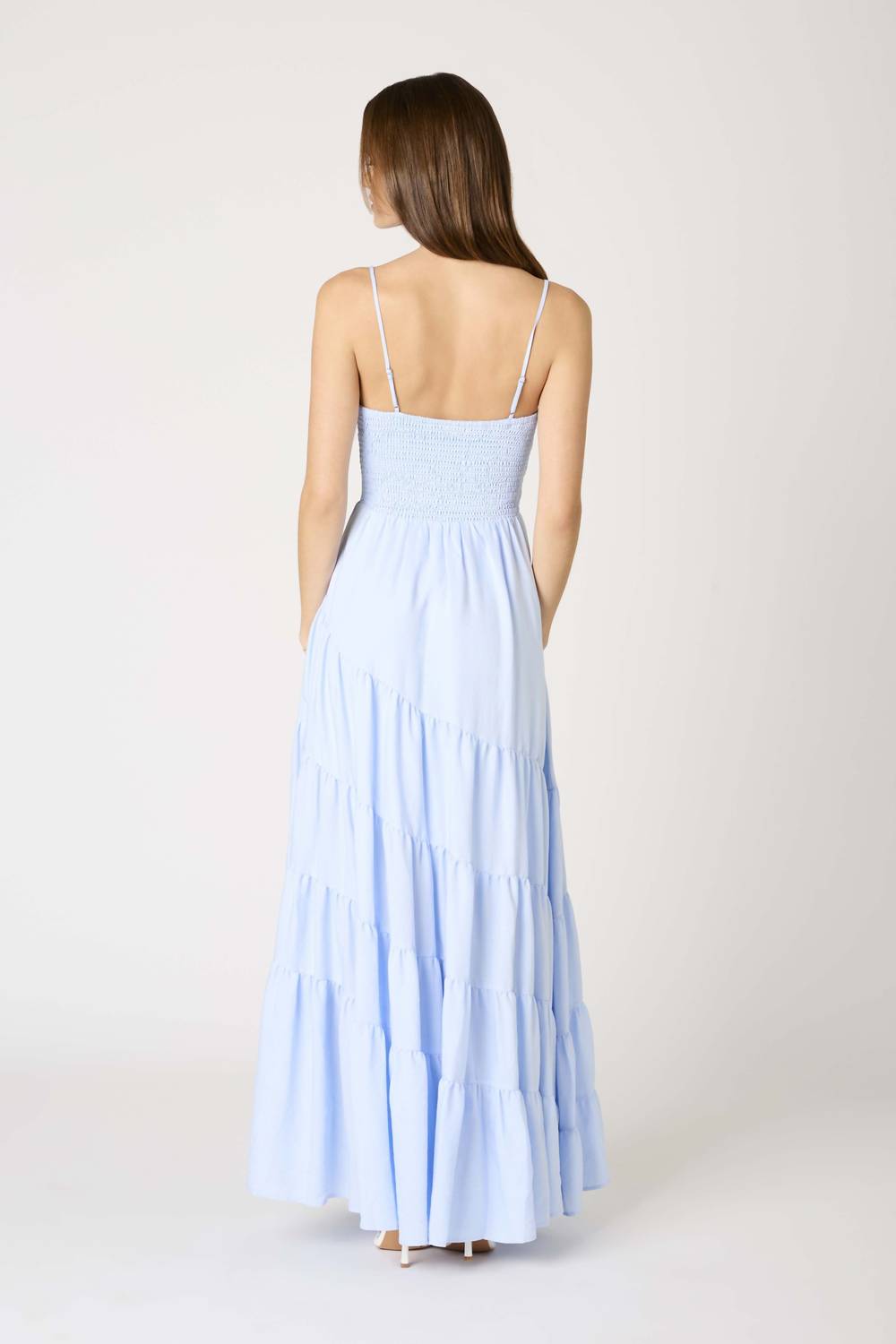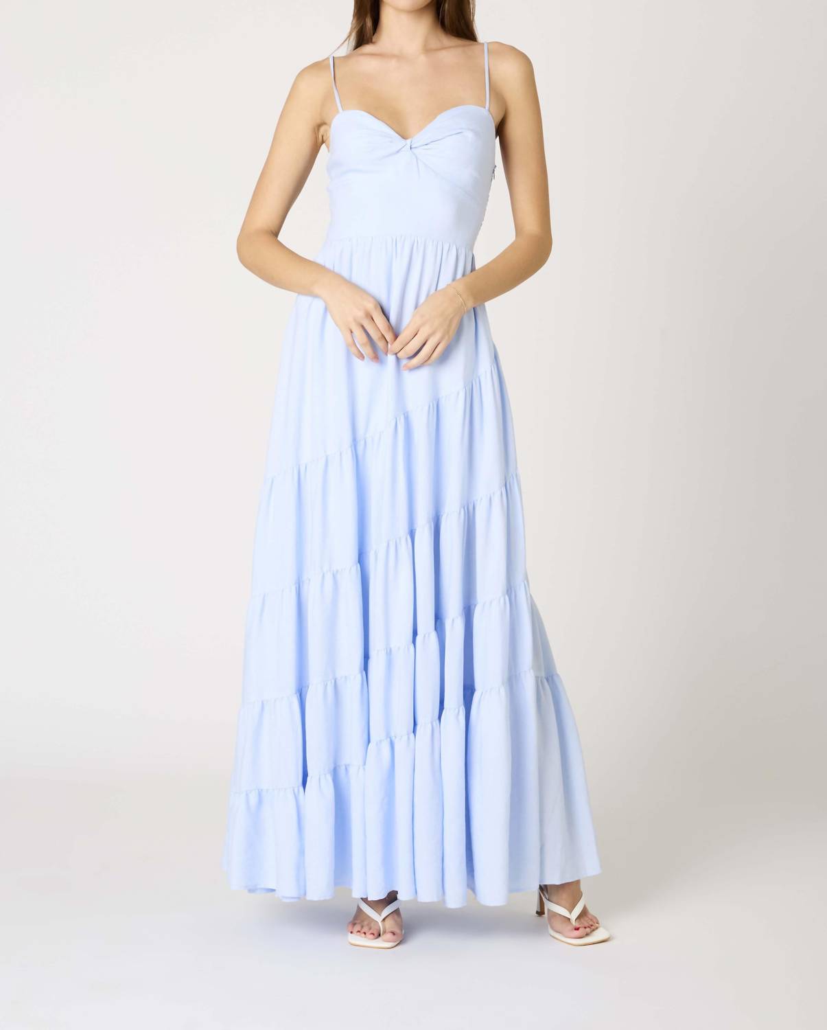 Style this maxi with your favorite statement necklace and sandals for the perfect look. Introducing the Tiered Maxi Dress by Cotton Candy LA, perfectly capturing minimalist style in a delightful chambray hue. This A-line silhouette features spaghetti straps and a twist bodice, complemented by a smocked back for an easy fit and adjustable tie closure. Ideal for summer occasions such as prom, this dress offers a sophisticated sweetheart neckline. Elevate your wardrobe with this solid-patterned, prom-ready statement piece.