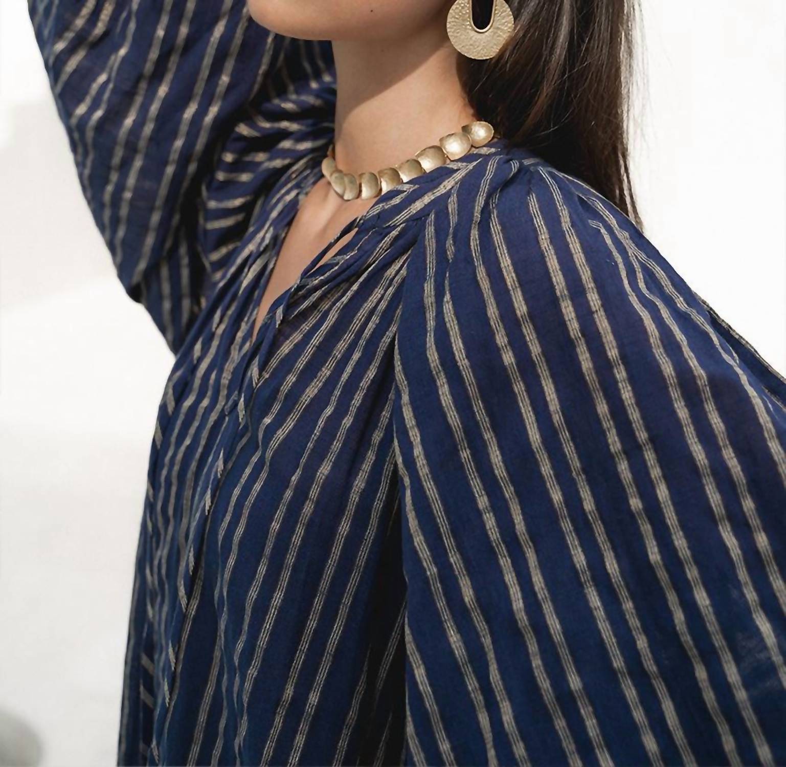 A maxi dress that is just as cute as it is comfortable. Embrace timeless elegance with the Poet Maxi Dress by Daughters of India in a captivating sapphire hue. This oversized, shift silhouette maxi dress is adorned with romantic three-quarter billowy sleeves and a classic poet-style collar. Crafted from 100% handloom cotton, it features sparkling gold lurex stripes and functional hip pockets, complemented by a thigh-high split and a pull-on closure. Ethically handmade in India, it demands gentle, cold water hand washing and drying in the shade to preserve its exquisite quality.