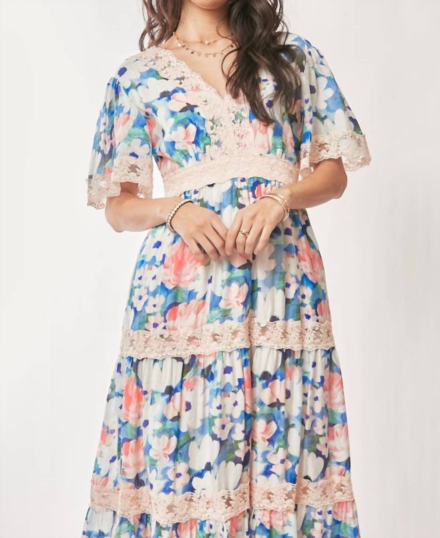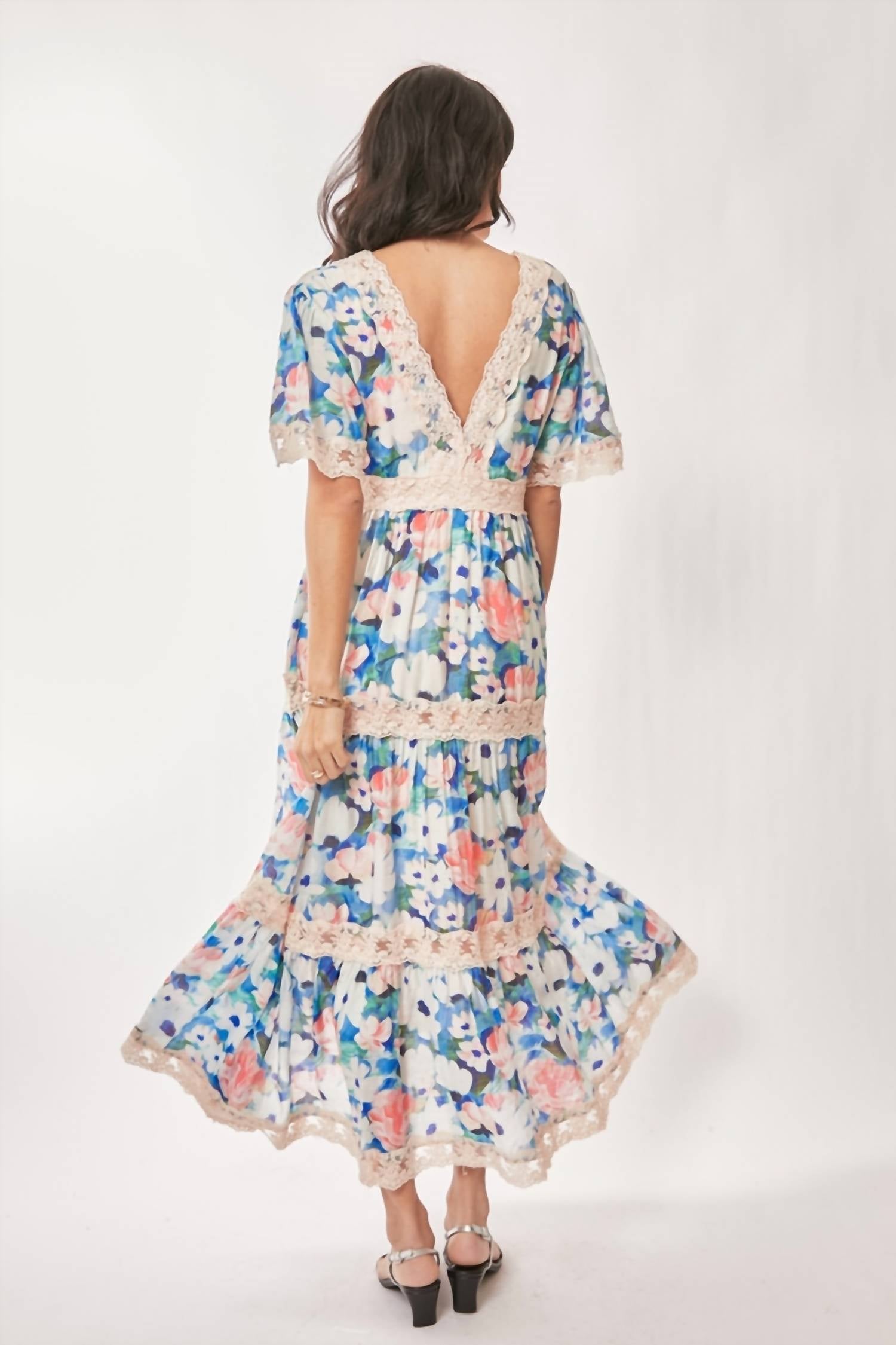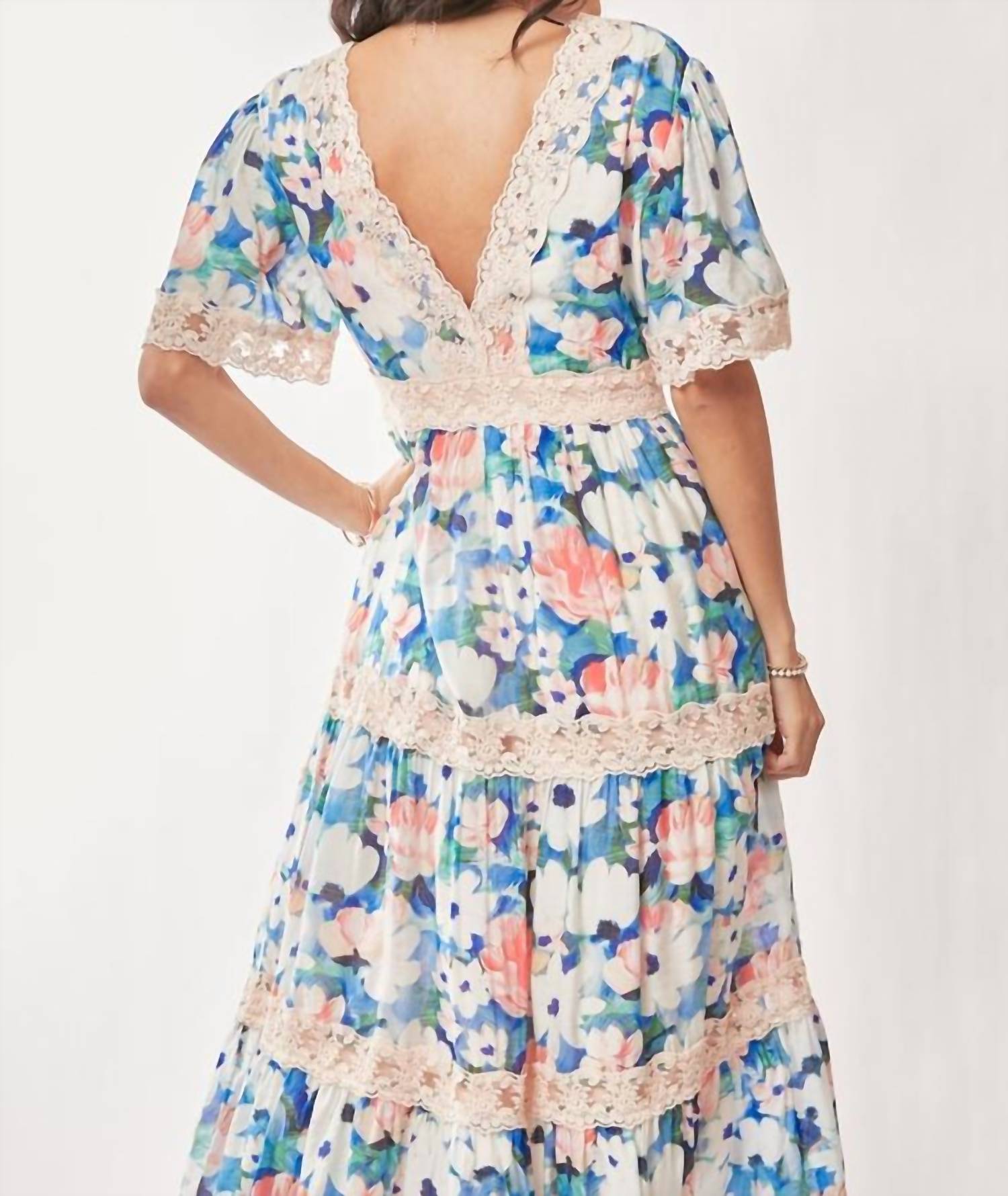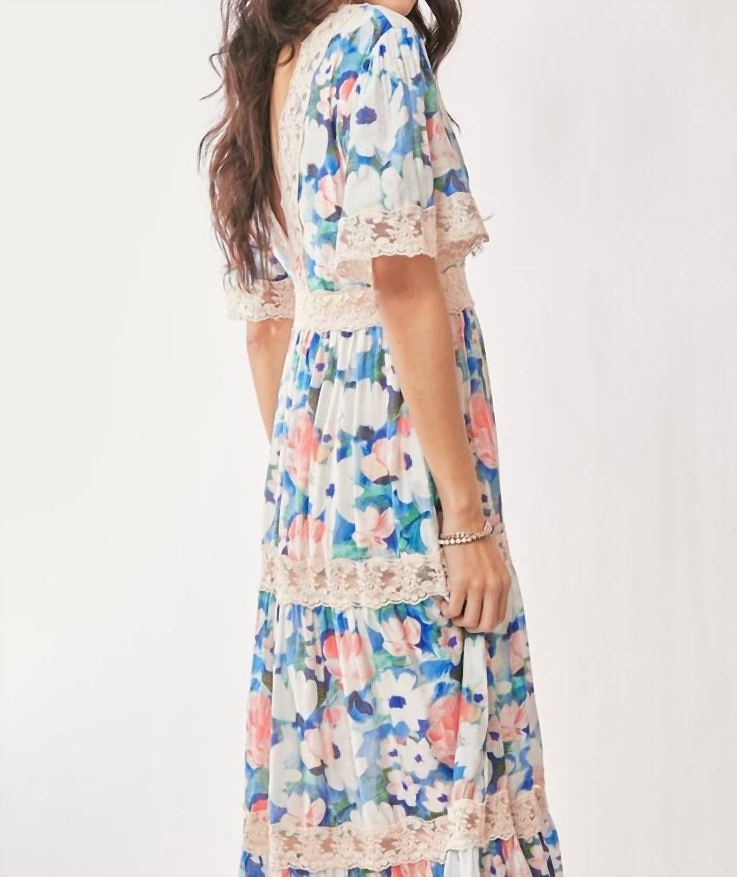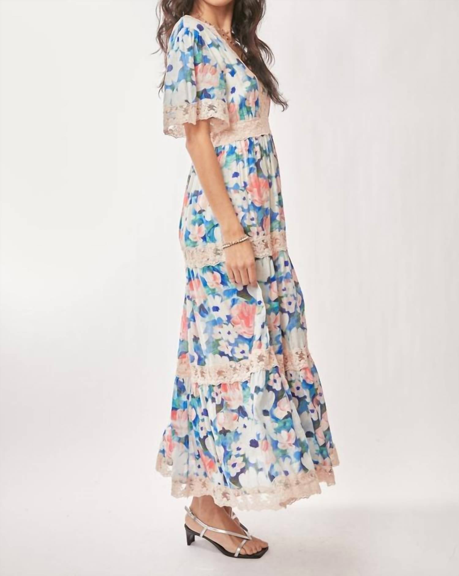 A maxi dress that is just as cute as it is comfortable. The Floral V-neck Maxi Dress by DAVI & DANI is a perfect choice for a summer escape, embodying 90s Fashion with its fit and flare silhouette. This blue maxi dress features short flutter sleeves and a charming water painting floral print, complemented by a delicate lace trim. It is crafted from a blend of 70% rayon and 30% to 100% polyester, offering a comfortable fit in hot weather. Originating from China, the dress is designed with a V-neck and a side zipper closure for easy wear.
