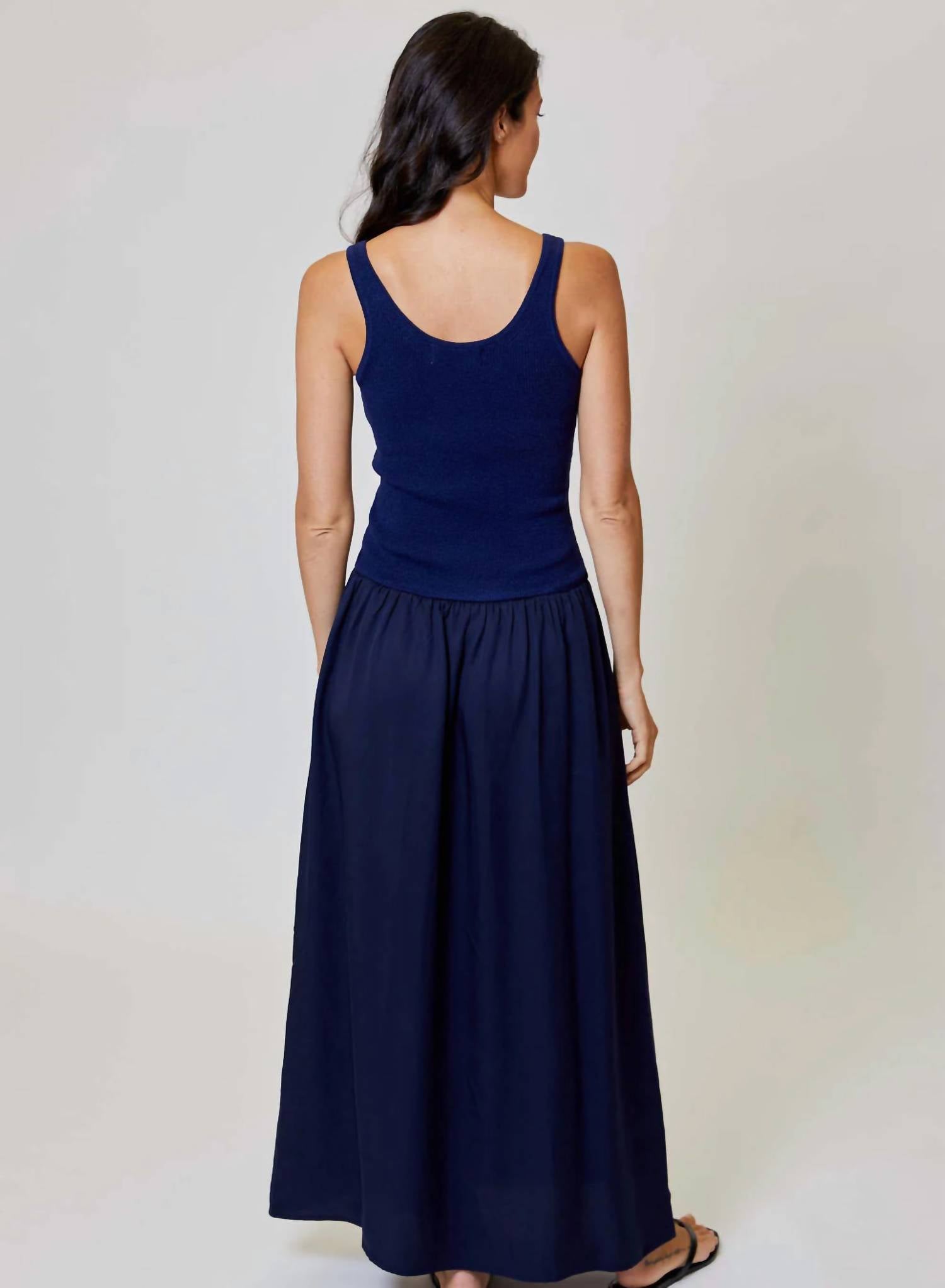Who doesn't love a good maxi dress? This one you'll be reaching for season after season. Meet the Porto Maxi Dress by dh NEW YORK, a stunning sleeveless piece in solid navy, perfect for summer style. This fit and flare dress features a drop-waist design with Sweater Top: 30% Linen, 70% | Jutecell Skirt: 100% Tencel. Closure: Pull-on. Care: Hand wash and line dry for easy maintenance. Ideal for vacation and workwear, this dress offers a versatile scoop neckline look.