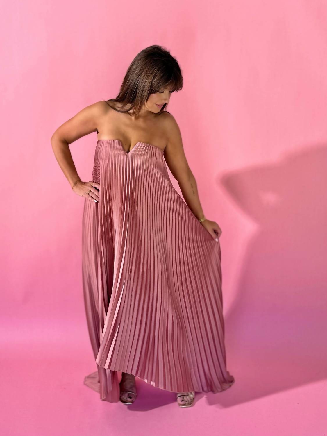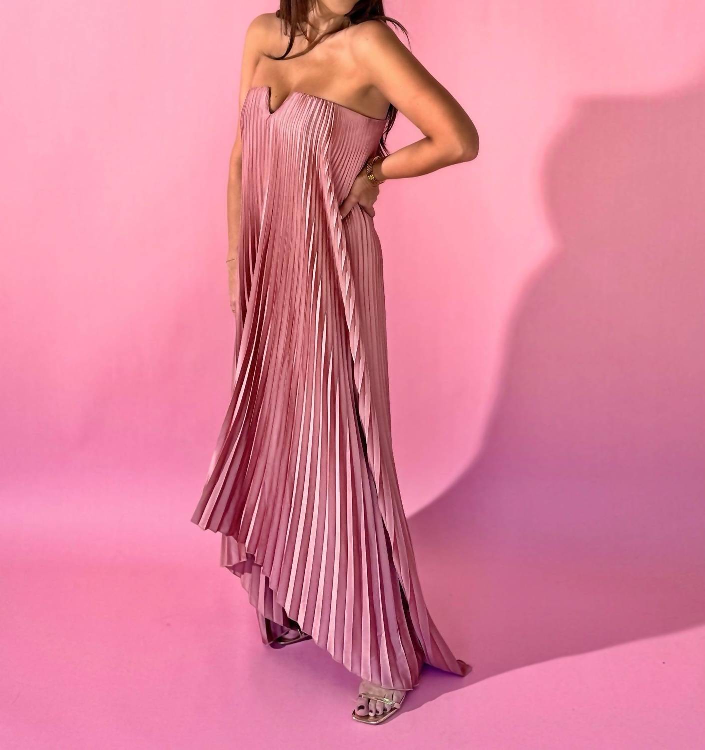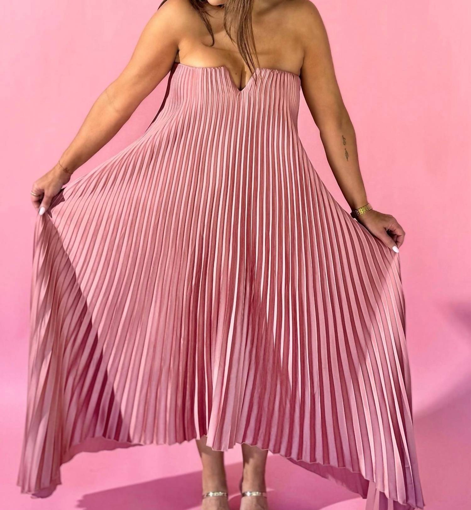 Who doesn't love a good maxi dress? This one you'll be reaching for season after season. Embrace elegance with the Exceptionally Elegant Pleated Maxi Dress by DRESS FORUM, a standout piece in a captivating pink hue. Designed with a strapless silhouette and v cut tube neck, it boasts inner soft boning on the front bodice and an elastic band on the back neckline to ensure a perfect fit. Composed of a luxurious blend of 97% polyester and 3% spandex for the shell, and 92% polyester and 8% spandex for the lining, this A-line maxi dress promises comfort until the final dance of the evening. Secured with a hidden back zip closure, it's a textured masterpiece that embodies quiet luxury, perfect for a spring evening event.
