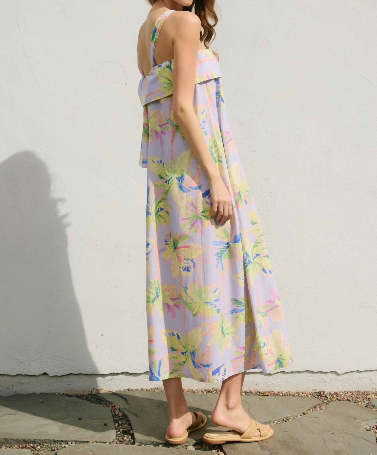 Who doesn't love a good maxi dress? This one you'll be reaching for season after season. Embrace effortless summer style with the Palm Tree Maxi Dress by DRESS FORUM in enchanting Baha Blues. This sleeveless, woven A-line dress is crafted from a soft cotton blend, combining 50% cotton and 50% rayon for breathable comfort. Perfect for a boho chic vacation look, it features a halter neckline and a convenient pull-on closure. Care instructions include hand washing to maintain its quality and vibrant pattern.