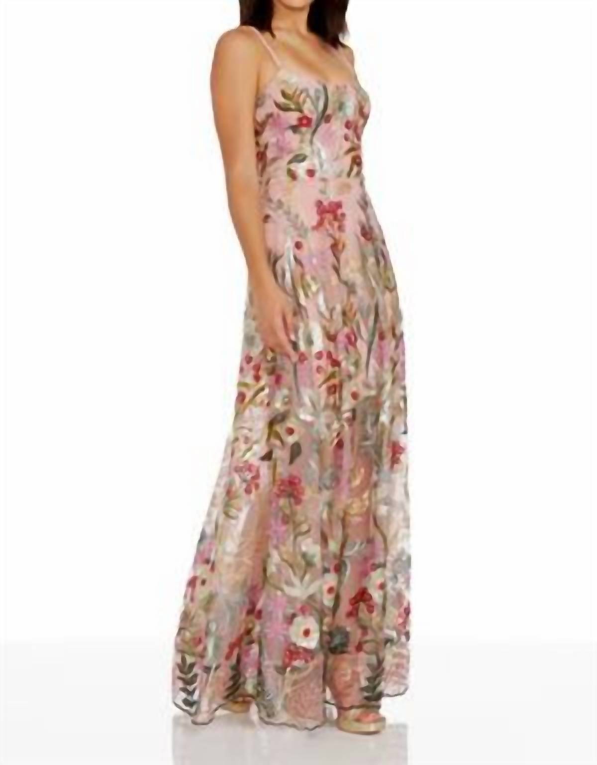 A maxi dress that is just as cute as it is comfortable. DETAILS Model is 5'8" B 36 W 25.5 H 36.5 wearing a size XS. Material Shell: 100% polyester Contrast: 100% nylon Lining: 95% polyester, 5% spandex Care Hand wash cold inside out, lay flat to dry, low iron inside out if needed. Can be dry cleaned. Do not bleach.