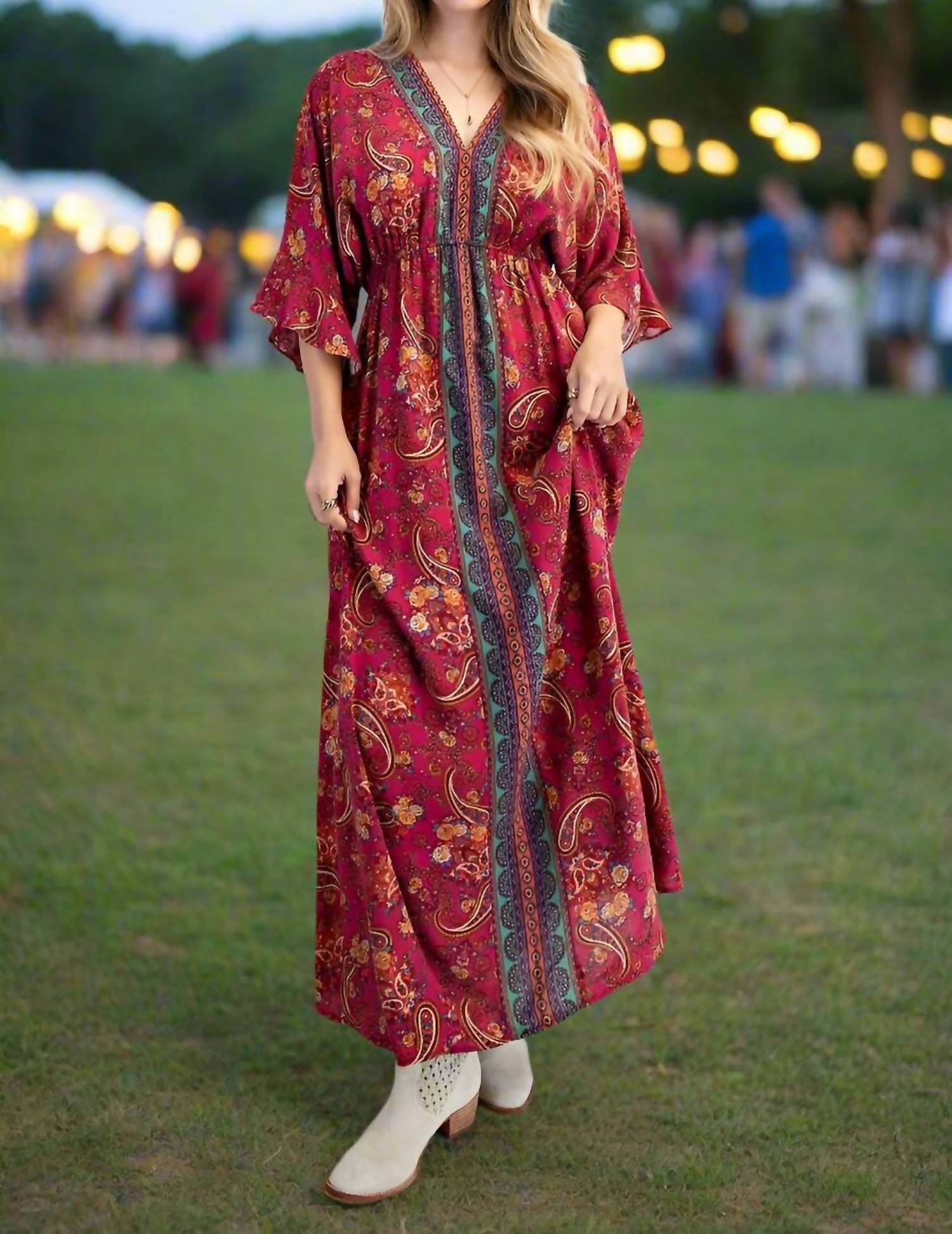 Style this maxi with your favorite statement necklace and sandals for the perfect look. Unearth bohemian elegance with the Easel Border Print Challis Maxi Dress. Featuring long wing-style flutter sleeves, this maxi is crafted from 100% rayon, offering both comfort and style for warm days. This pull-on dress with hidden side seam pockets showcases a vibrant geometric print in red, while the v-neckline and smocked waistline accentuate an A-line silhouette. Care: Machine wash. Perfect for spring vacations and boho-inspired outings, this dress measures 54" in length and 42.5" in sweep for a relaxed, flattering fit.