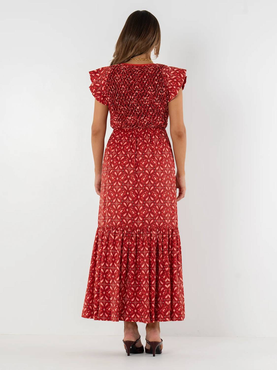 Style this maxi with your favorite statement necklace and sandals for the perfect look. The Grace Maxi in Bandana blends western charm with feminine detail. Designed with honeycomb smocking across the bodice, this style offers both structure and comfort. The pleated ruffle sleeves frame the shoulders with playful movement, while the elastic waistband flatters the figure. Flowing into a tiered maxi hem, the silhouette creates graceful ease with every step. The bandana print adds a bold nod to western heritage, reimagined with a chic and elevated twist. Details: V-neckline Ruffle sleeve detail Honeycomb smocked bodice Fitted silhouette 100% Polyester Lining: 100% Polyester Hand wash with gentle liquid or powder detergent. Cold water will help preserve color & shape. Hang dry.