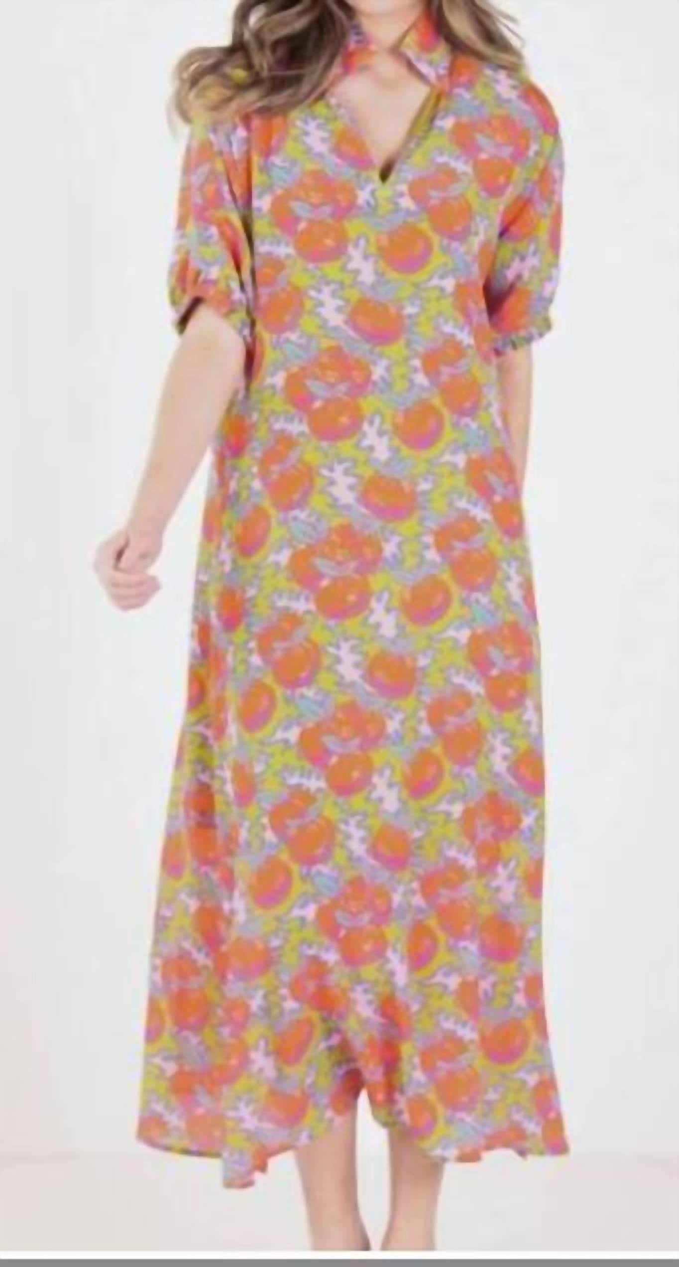 A maxi dress that is just as cute as it is comfortable. This 100% cotton dress features a seashell print, a stand collar, and a notched neckline. It is designed with a loose-fitting silhouette and relaxed dolman sleeves that have elastic cuffs. The garment is lined with 100% polyester and should be washed on a delicate cycle with cold water and hung to dry.