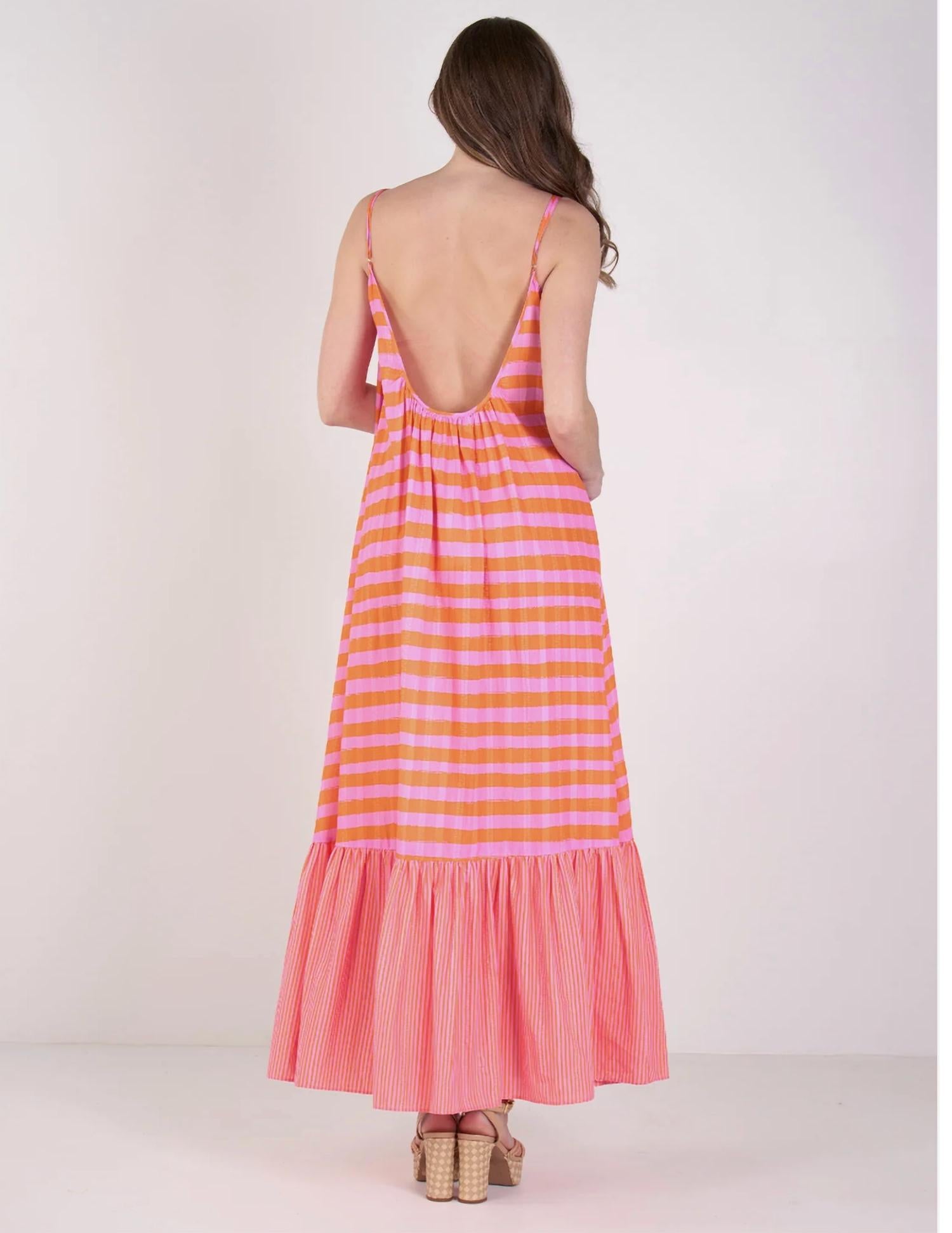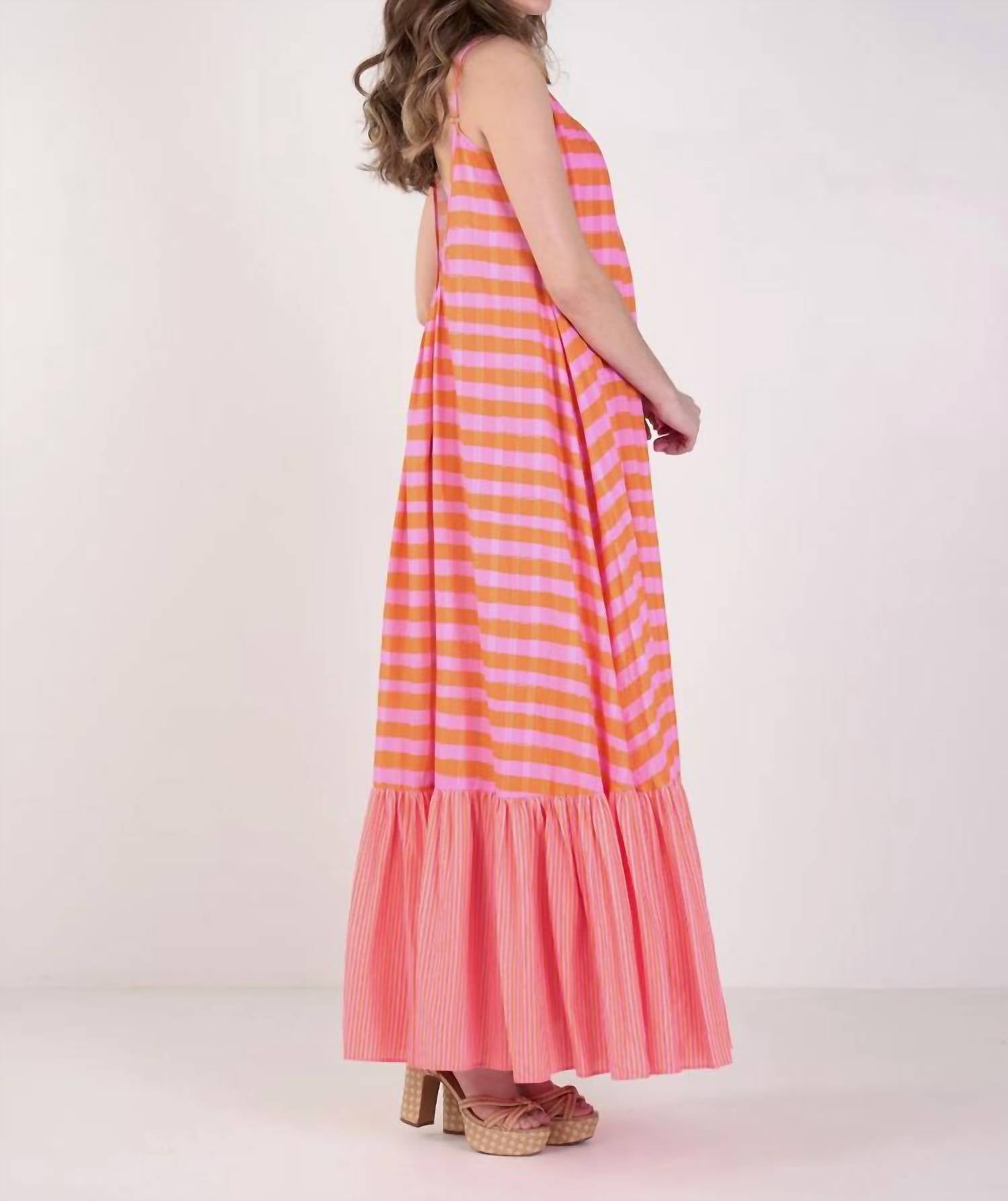 Who doesn't love a good maxi dress? This one you'll be reaching for season after season. Introducing the Susannah Maxi Dress by Emily McCarthy, a summer-ready piece in an eye-catching Coral Pink Stripe pattern. This spaghetti strap dress boasts a flattering kaftan silhouette and a chic scoopneck. Featuring a convenient pull-on closure and designed with pockets for added functionality. Perfect for evening events, this boho chic maxi dress effortlessly combines style and comfort.