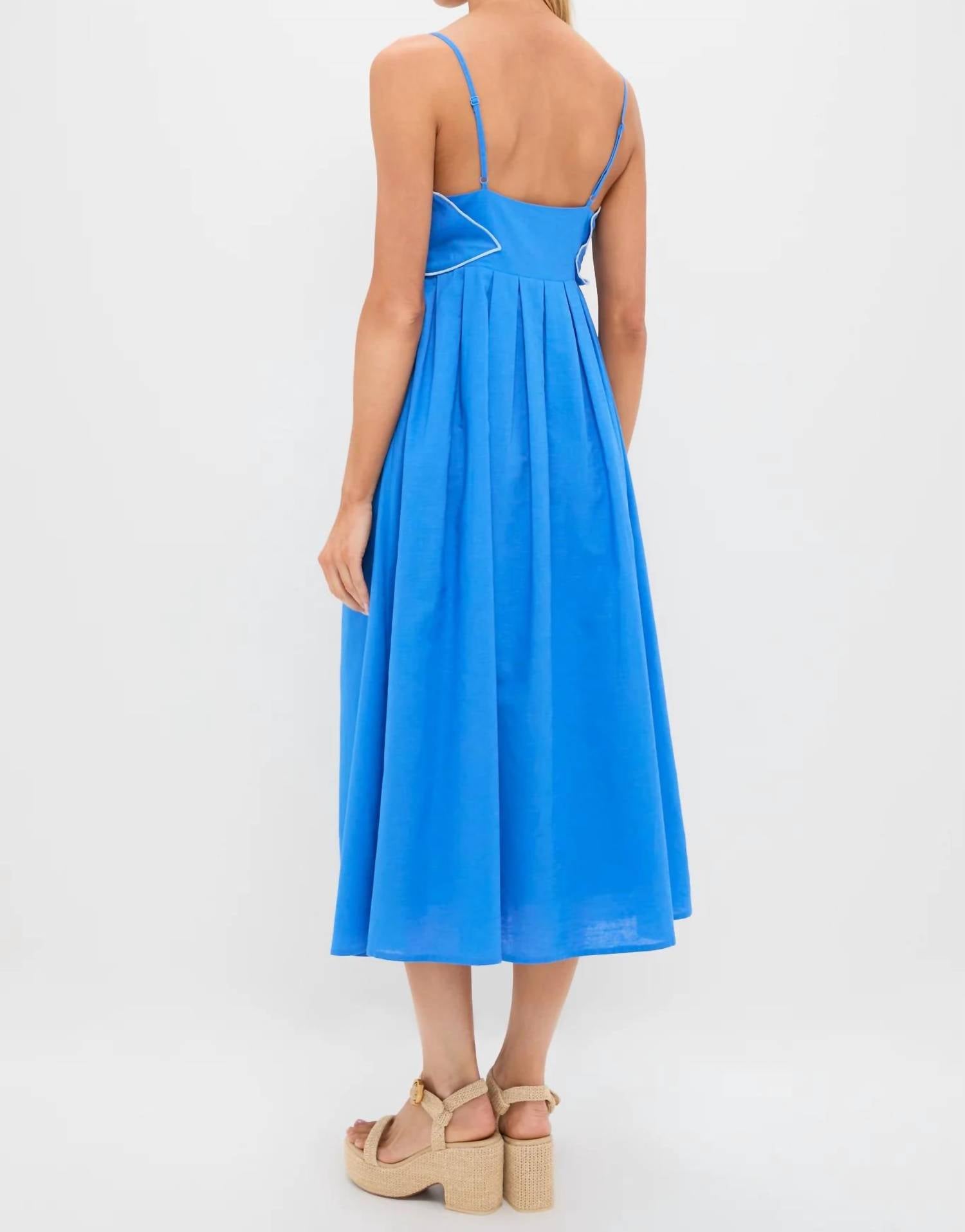 A maxi dress that is just as cute as it is comfortable. The Iris Flower Appliqué Maxi Dress by English Factory in Sea Blue is designed for a playful summer look and features adjustable spaghetti straps. Constructed from a linen blend with a lining of 100% rayon, this empire waist dress falls to a flattering midi length. It includes a hidden back zipper for seamless wear. Care is easy with a simple hand wash and lay flat to dry to keep it looking exquisite for all your vacation outings.