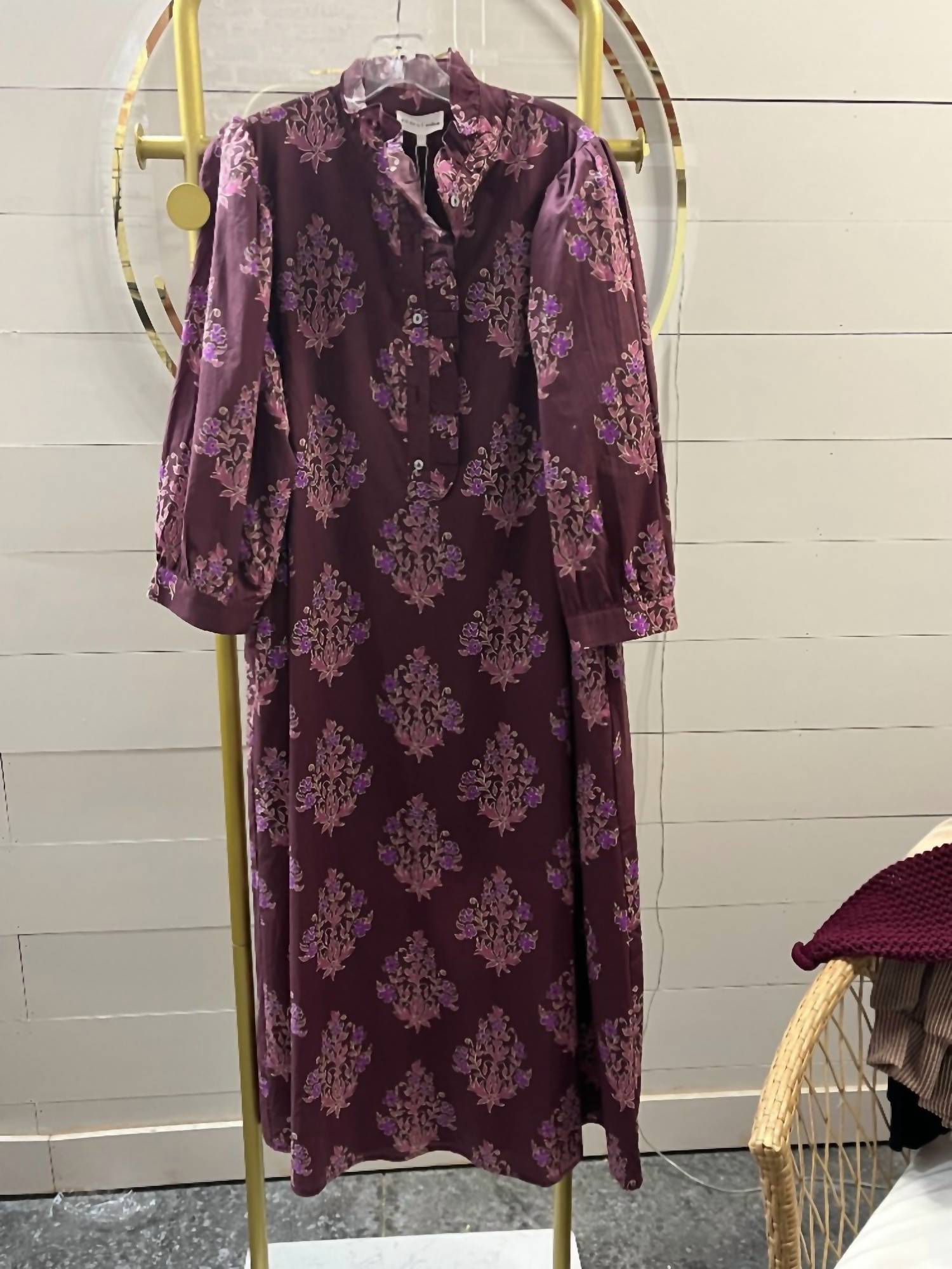 Who doesn't love a good maxi dress? This one you'll be reaching for season after season. Introducing the A-line Floral Maxi Dress by Entro, a must-have addition to any summer wardrobe. This dress boasts long sleeves and a charming button closure, perfect for a minimalist vacation style. Crafted with a blend of 100% cotton for the shell and 100% rayon for the lining, this dress features a plum/pink floral pattern and a V-neckline for effortless elegance. True to size with a relaxed fit, it offers partial lining for comfort and style versatility. Model is 5'2" wearing a size small with a bust size of 40 inches.