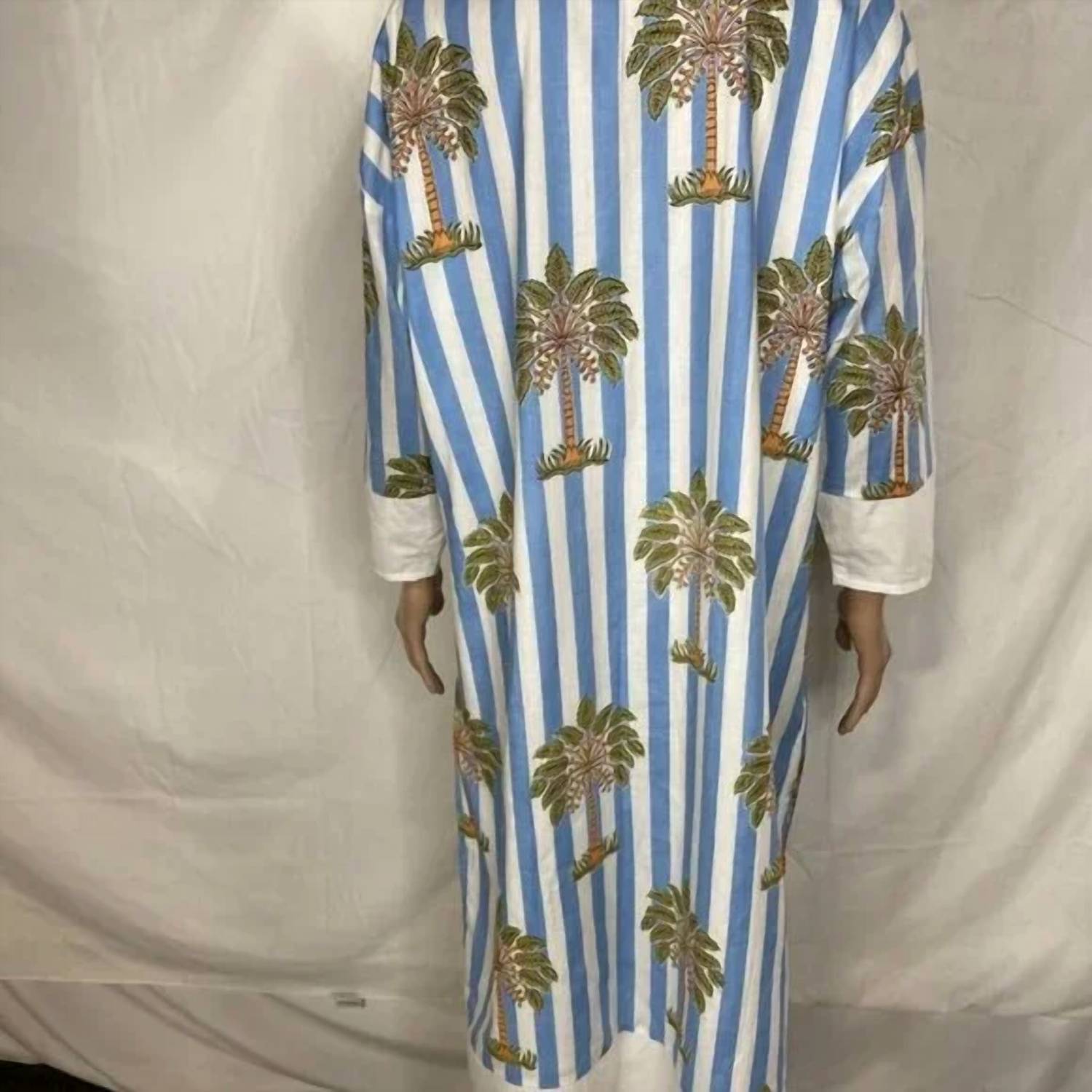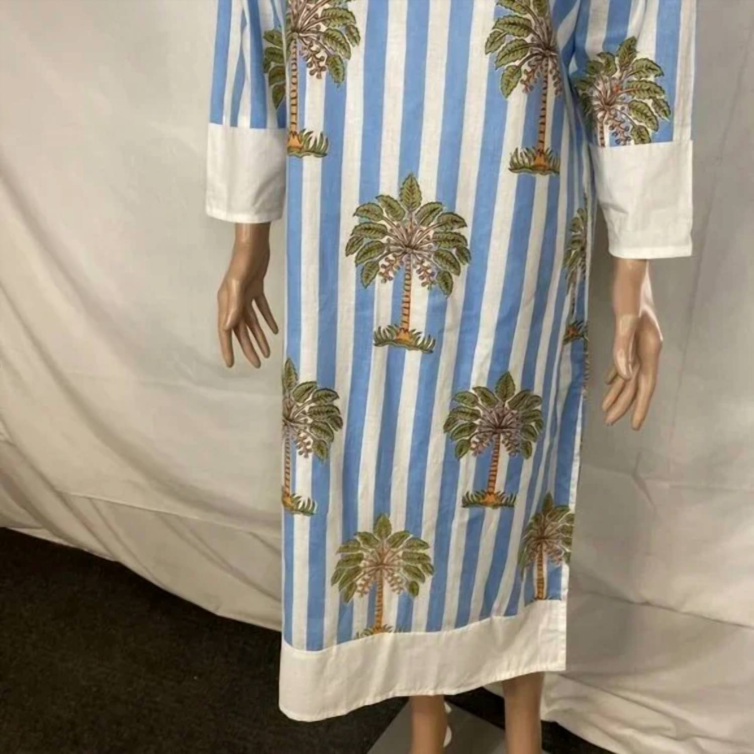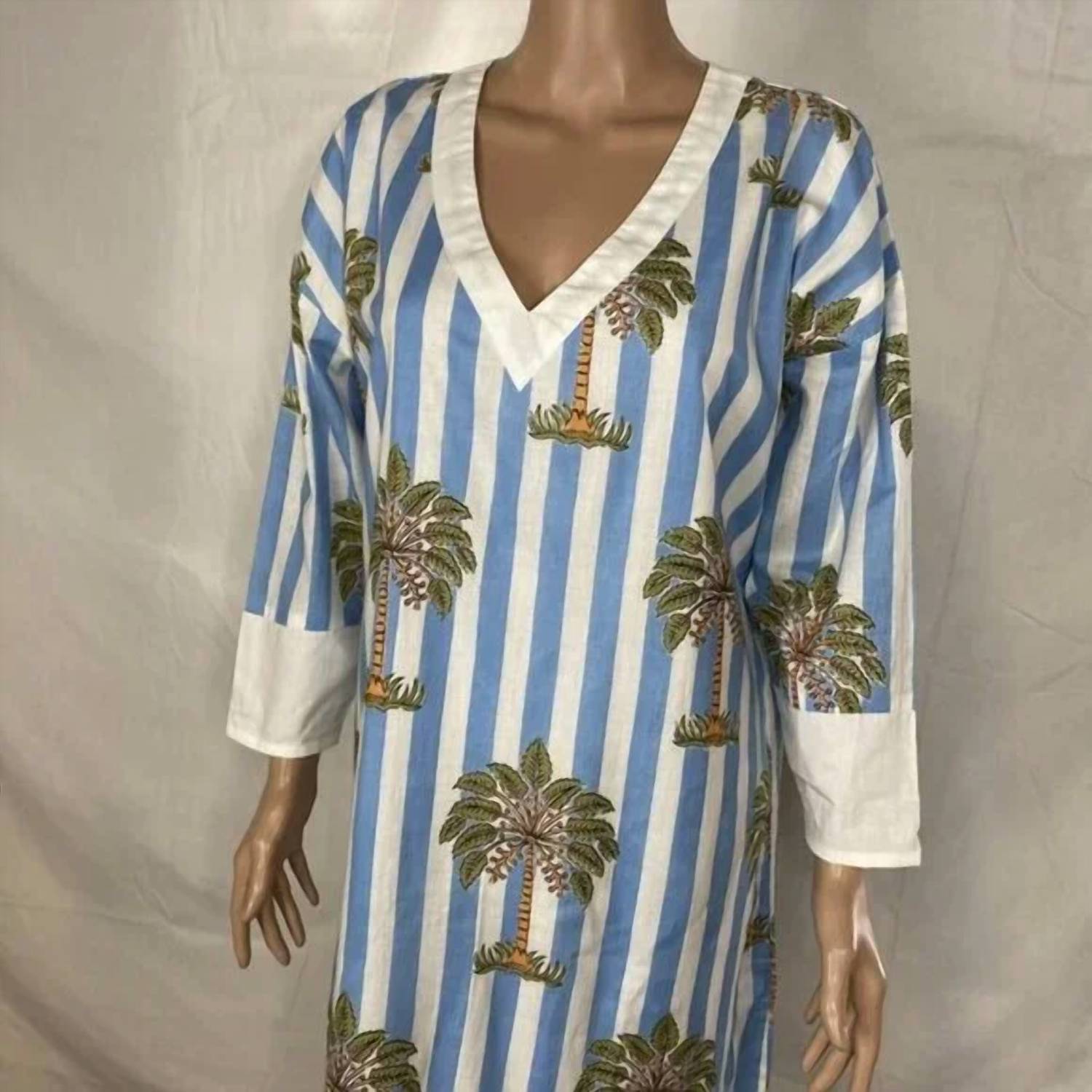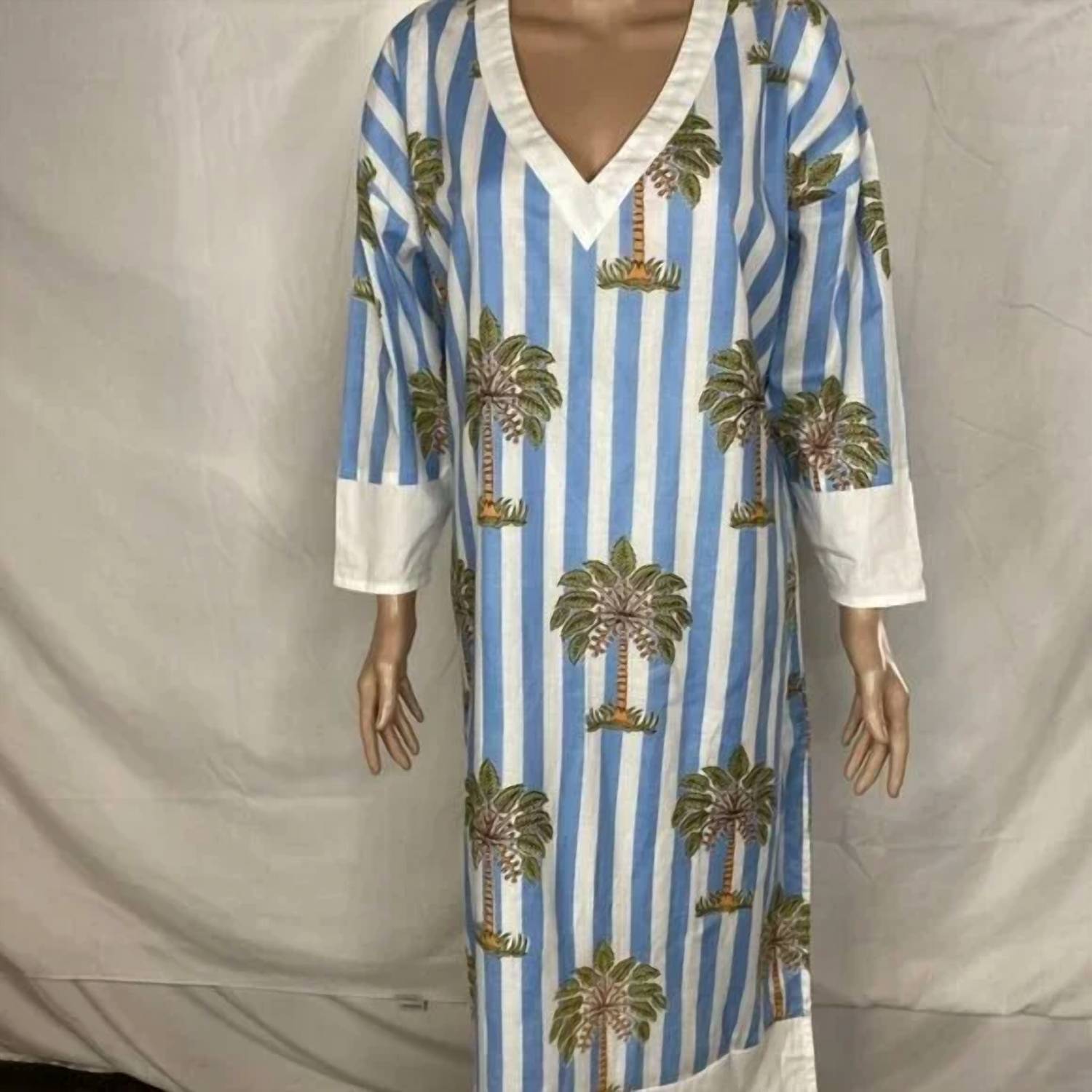 Who doesn't love a good maxi dress? This one you'll be reaching for season after season. Discover the Women's Cotton Poplin Palm Tree Summer Dress by Fancy, a delightful and breezy option for your beach day adventures. This dress boasts three-quarter sleeves and a V-neckline, crafted from 100% Cotton Poplin for comfort and style. Its midi length is accentuated by stripes and a playful palm tree print, with side slits for added movement. Closure type is a convenient pullover, and it's fully lined with lightweight fabric, making it easy to maintain with machine wash care.