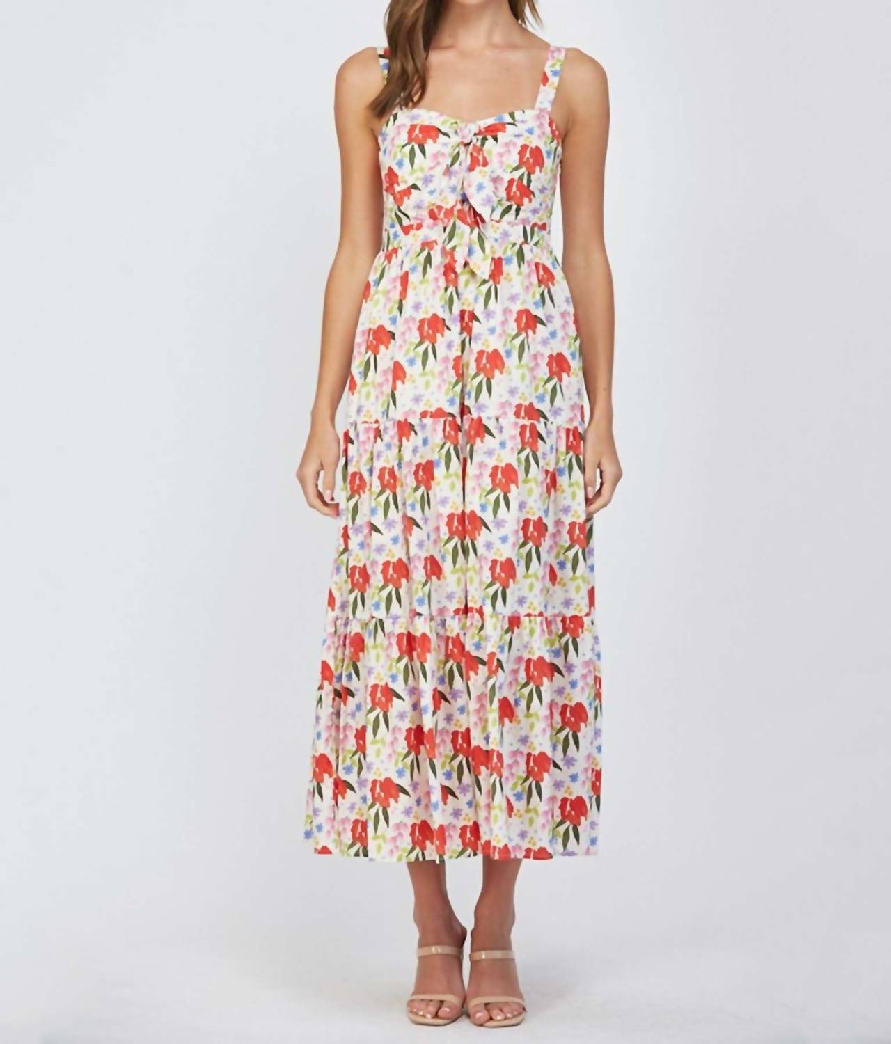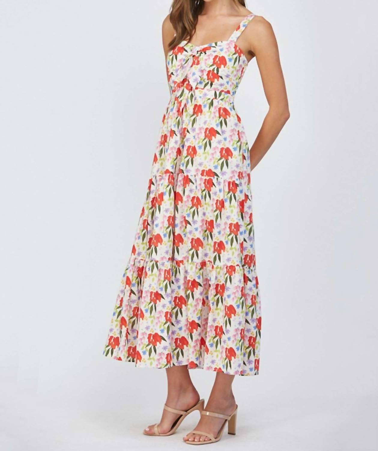 A maxi dress that is just as cute as it is comfortable. Elevate your summer wardrobe with the Fate Cut Out Tie Front Floral Maxi Dress, a breezy and romantic piece in a cream hue adorned with a vibrant floral pattern. Designed with spaghetti straps and a smocked back for a customizable fit, this sleeveless maxi dress is crafted from 70% Rayon and 30% Linen, with a 100% Rayon lining. The pull-on style showcases a flattering silhouette with a cut-out front and knotted bust detail, complemented by pockets for added convenience. Easy to care for, simply machine wash to maintain its boho chic appeal.