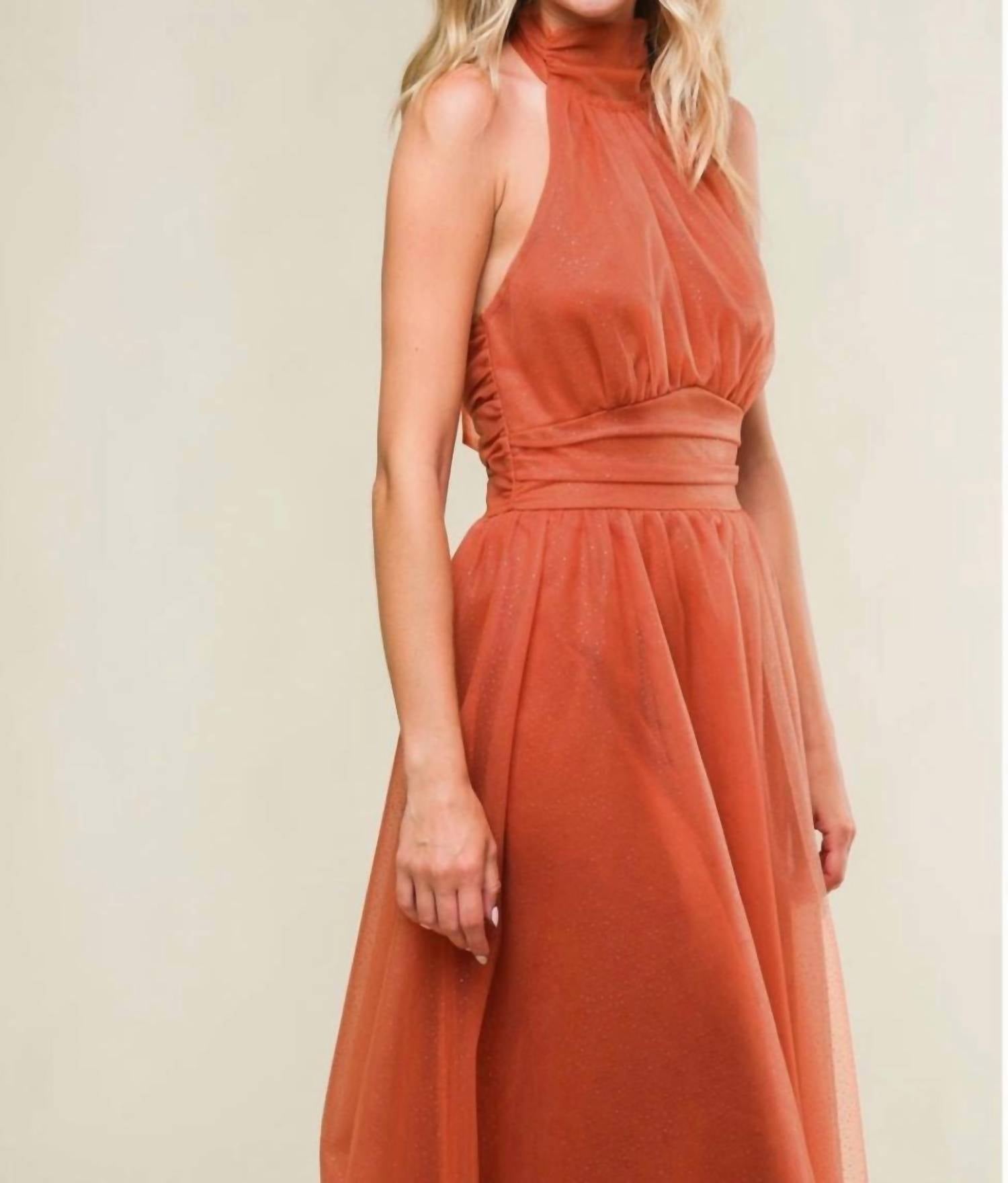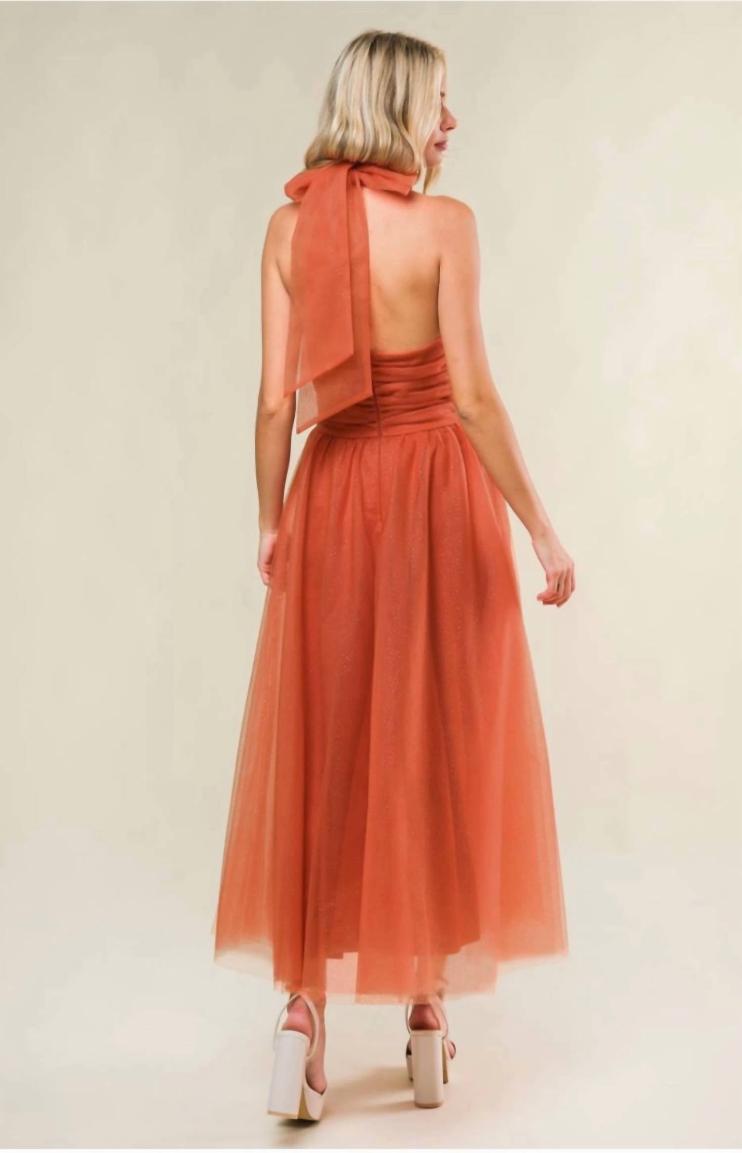 Who doesn't love a good maxi dress? This one you'll be reaching for season after season. Introducing the Amber Glow Bow-back Halter Dress by FLYING TOMATO, a statement piece that exudes elegance in a striking rust hue. This sleeveless maxi dress is crafted with a captivating empire waist silhouette and features a bold bow-back detail for a unique touch. Closure: Zip closure. Care: Dry clean only. Perfect for women embracing the quiet luxury trend this spring, it’s tailored for graceful sophistication at any special event.