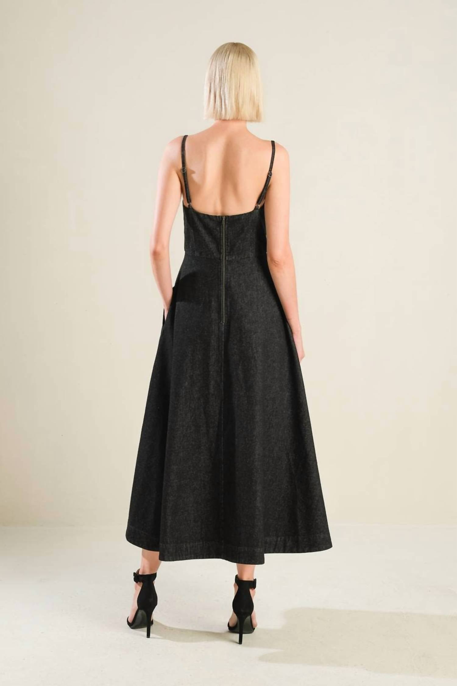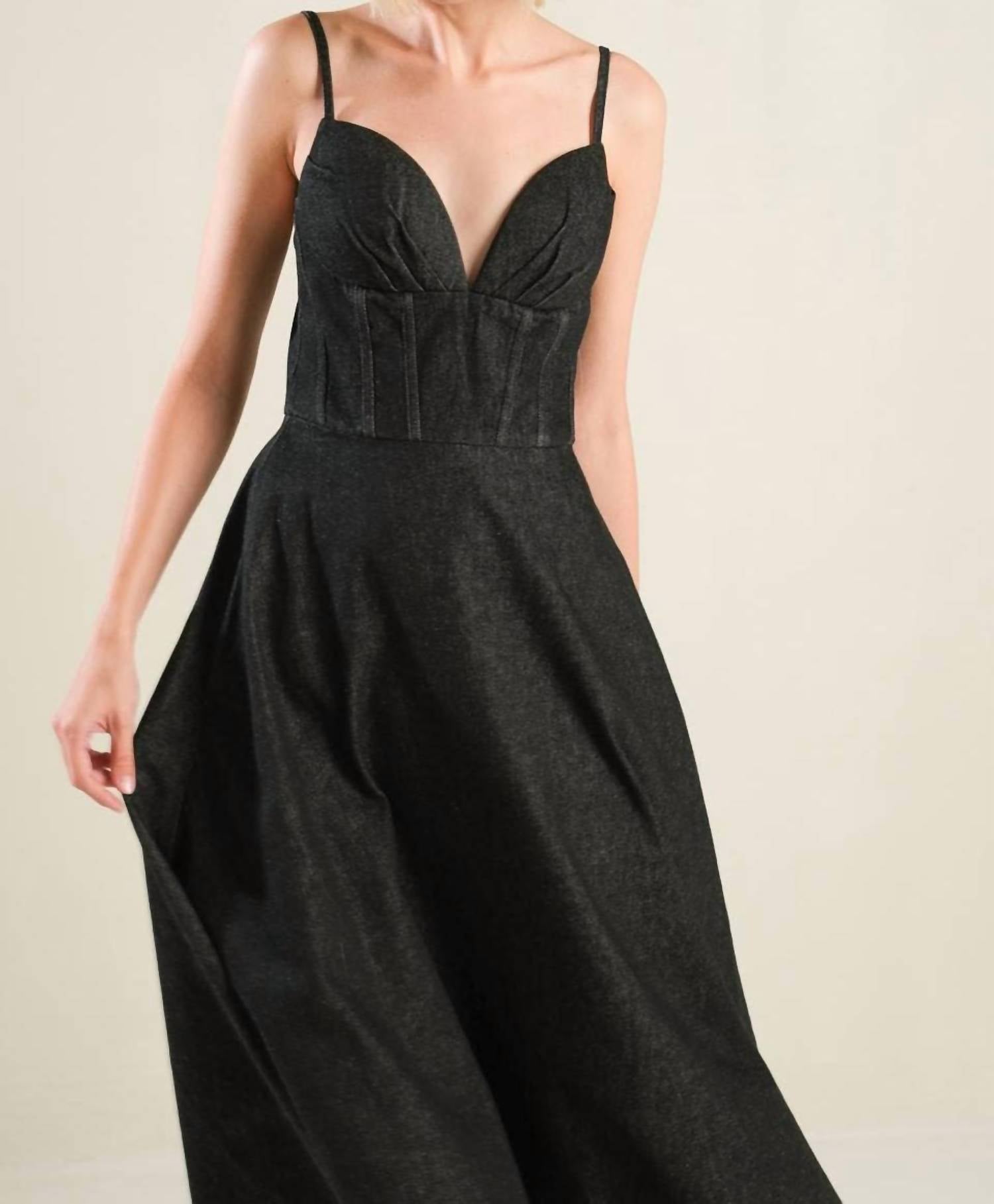 Style this maxi with your favorite statement necklace and sandals for the perfect look. Introducing the FLYING TOMATO You Are My Sunshine Denim Midi Dress, a stylish choice for any holiday party. This elegant piece features spaghetti straps and an A-line silhouette, combining a sweetheart neckline with a figure-accentuating waist yoke and a full skirt. Crafted from a cotton blend composition of 99% Cotton and 1% Spandex, with a 100% Polyester lining, it offers a total length of 49 inches. Closure: Back zip closure. Care instructions are not provided. Model is 5'8" and wearing a size small.