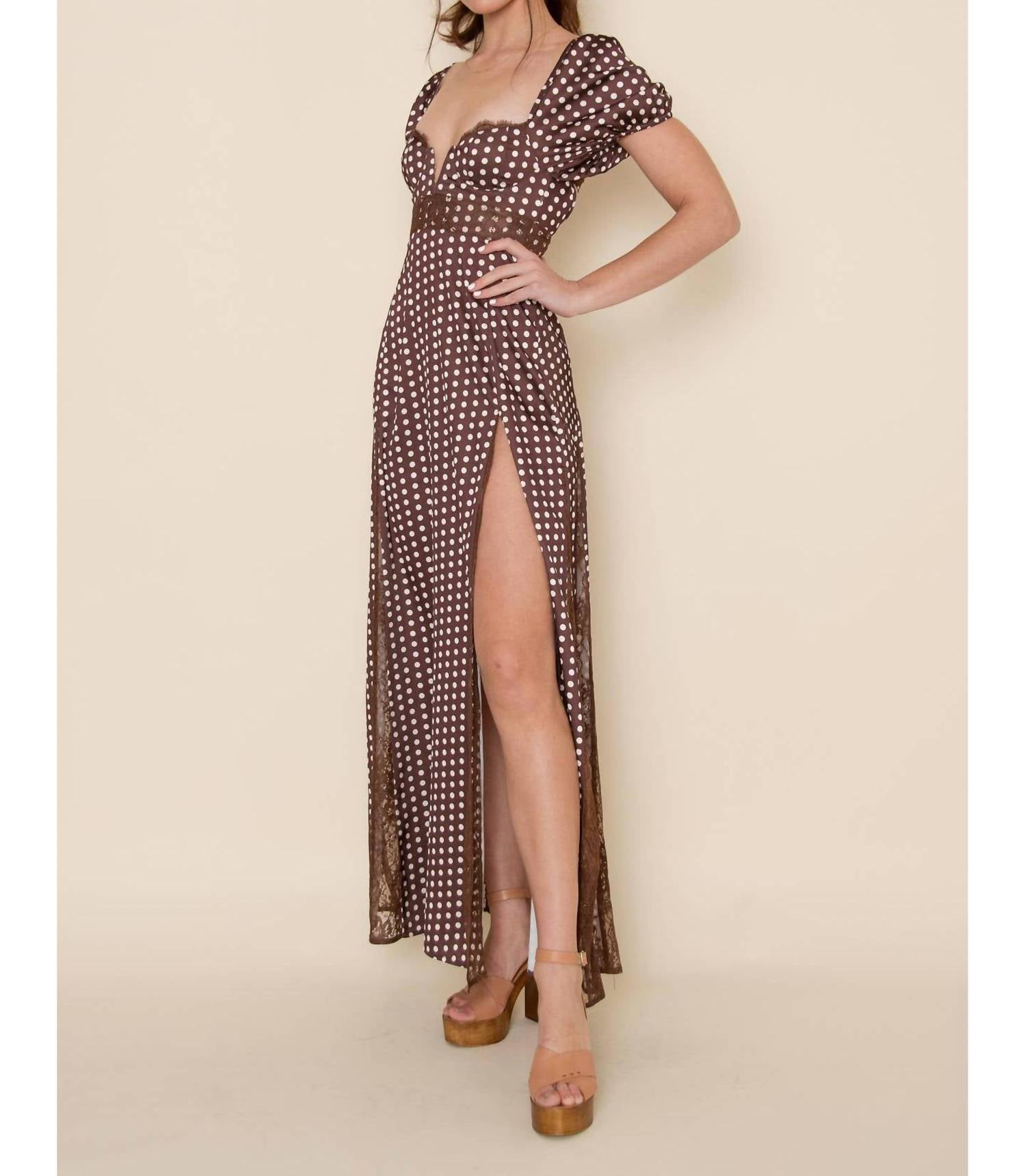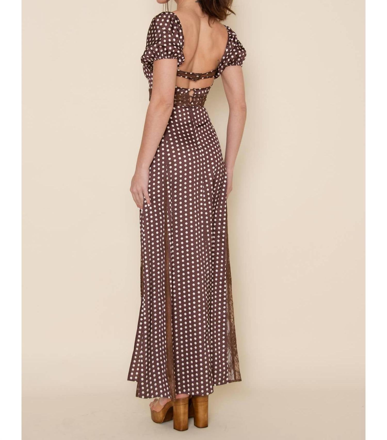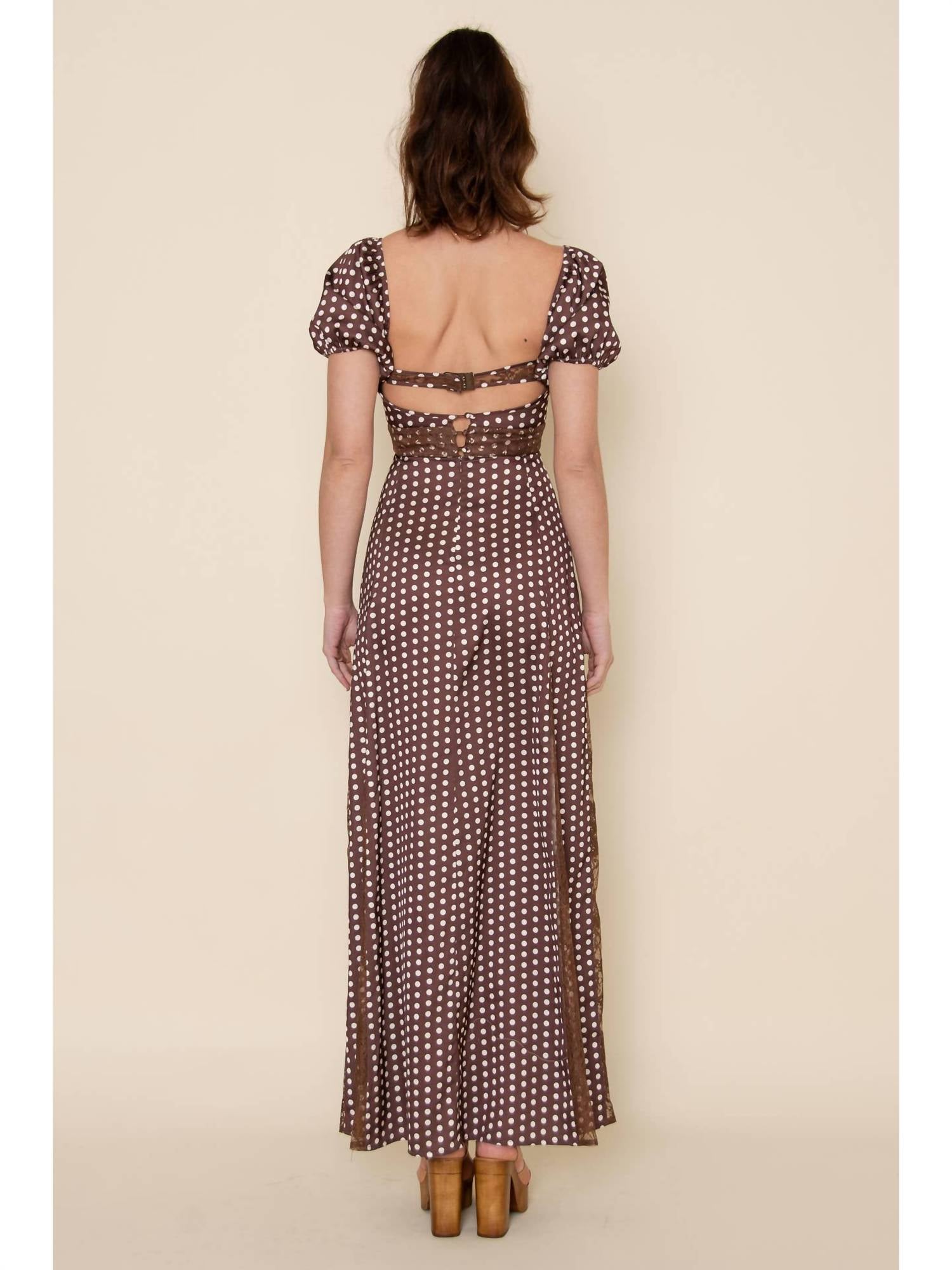 Style this maxi with your favorite statement necklace and sandals for the perfect look. Make a statement with the Polka Dot Maxi Dress by Fore Collection, featuring a playful brown and white polka dot pattern. Designed with short sleeves and a sweetheart neckline, this dress offers full underwire cups and a lace-paneled skirt for a flattering fit. Crafted from 100% polyester with an open back and hidden back center zip closure, it combines elegance and ease. For care, simply hand wash to maintain its timeless appeal.