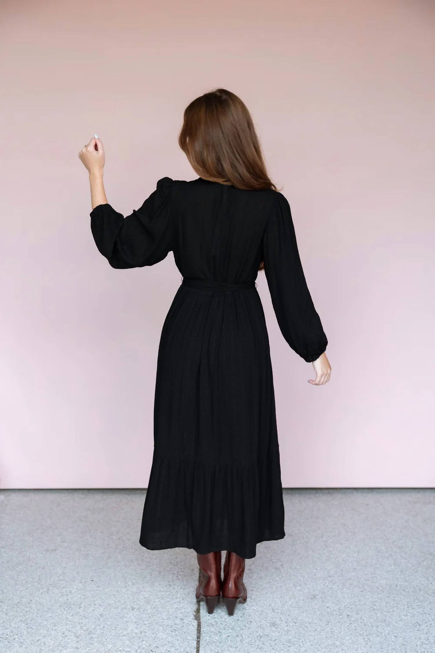 Who doesn't love a good maxi dress? This one you'll be reaching for season after season. Presenting the Monroe Dress by Gentle Fawn, a timeless piece exuding effortless elegance. This black midi dress is crafted from 100% Viscose and features long blouson sleeves with elastic cuffs, a flattering V-neckline, and a flowy tiered skirt for a beautifully moving silhouette. Its subtle embroidered stripe detailing enhances its sophisticated charm, making it perfect for both casual outings and dressed-up occasions. With its minimalist A-line silhouette, this versatile dress is an ideal choice for a dinner party or a special Mother’s Day celebration.
