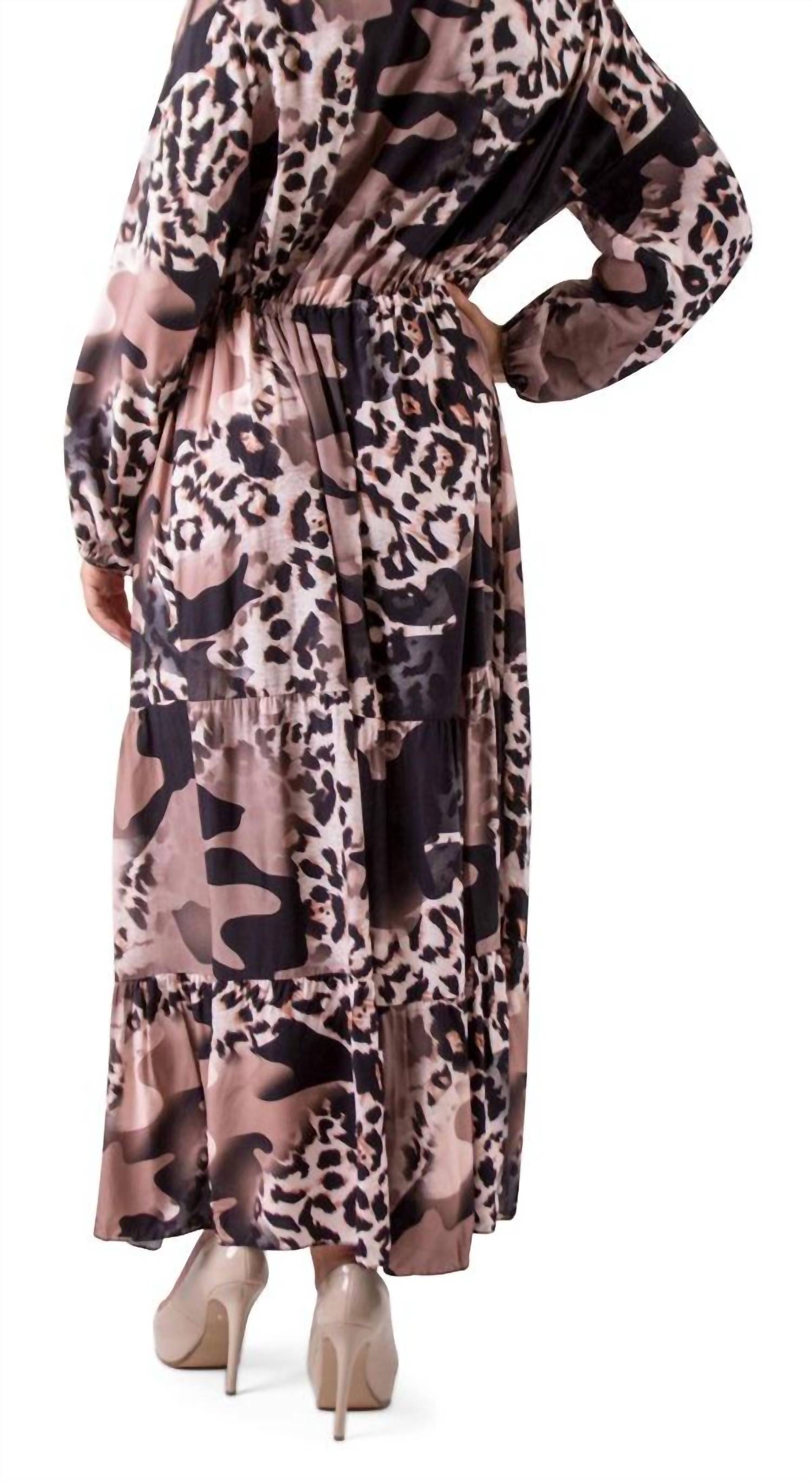 Who doesn't love a good maxi dress? This one you'll be reaching for season after season. Unveil your inner boho chic with the GIGI MODA Safari Print Maxi Dress in taupe, blending unique camo and leopard patterns for a striking summer look. This Italian-crafted dress, made from 100% viscose, features long balloon sleeves and a flattering overlapping V-neck. Its empire waist silhouette ties elegantly in front, draping down to a ruffled bottom for added flair. Closure: Pull on. Care: Hand wash, line dry. Designed to fit most, this dress is ideal for a stylish dinner party occasion or a festive 4th of July celebration.