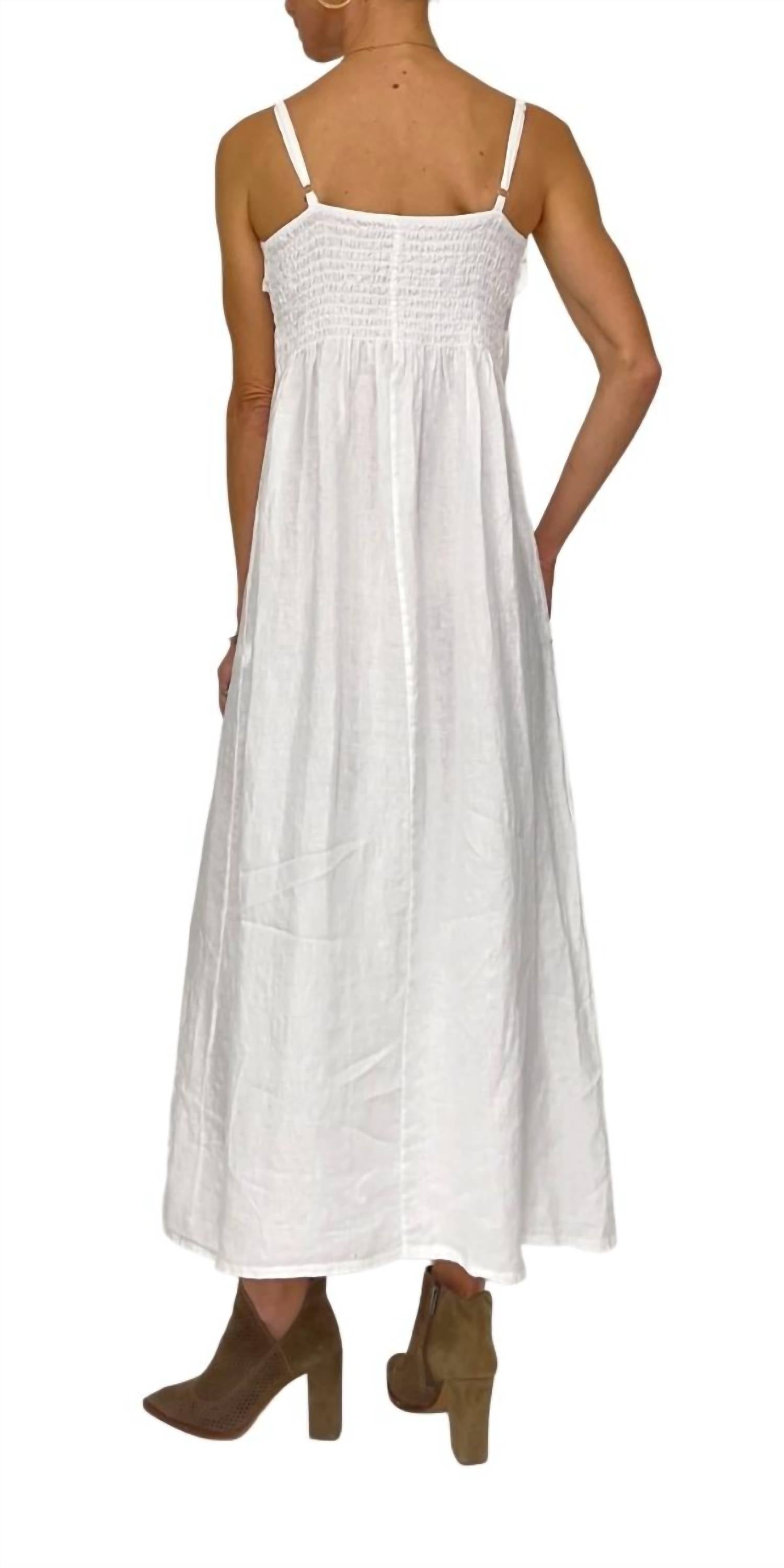 Who doesn't love a good maxi dress? This one you'll be reaching for season after season. Introducing the Zora Maxi Dress by GIGI MODA, crafted for the ultimate in quiet luxury style. This white linen dress features adjustable spaghetti straps and a ruched elastic back for a flattering empire waist silhouette. Made in Italy, the dress is maxi length with a pull-on closure for easy elegance. Care: Hand wash and line dry. Available in one size for an ideal fit.