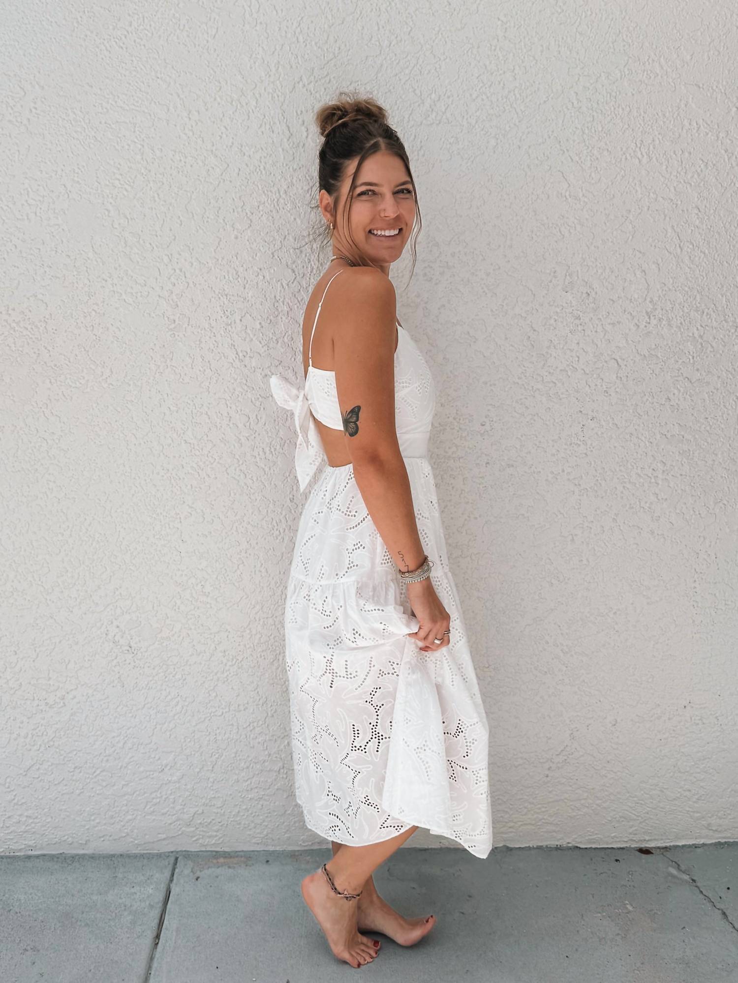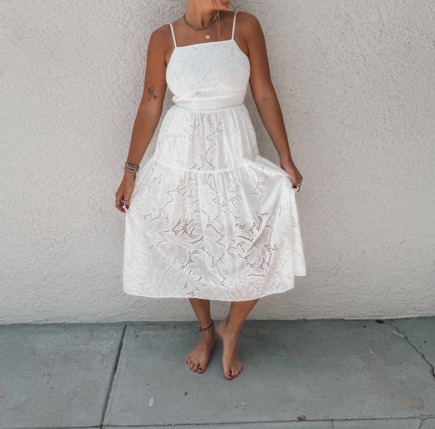 Style this maxi with your favorite statement necklace and sandals for the perfect look. Step into summer with the GILNER FARRAR Dree Dress, a sleeveless maxi dress that captures boho chic style effortlessly. This white lace dress features delicate spaghetti straps and a charming tie closure at the back, complete with a squareneck design for a flattering A-line silhouette. Crafted for vacation-ready looks, its playful eyelet pattern makes it perfect for sunny adventures. Embrace its easy and breezy elegance for any summer occasion.