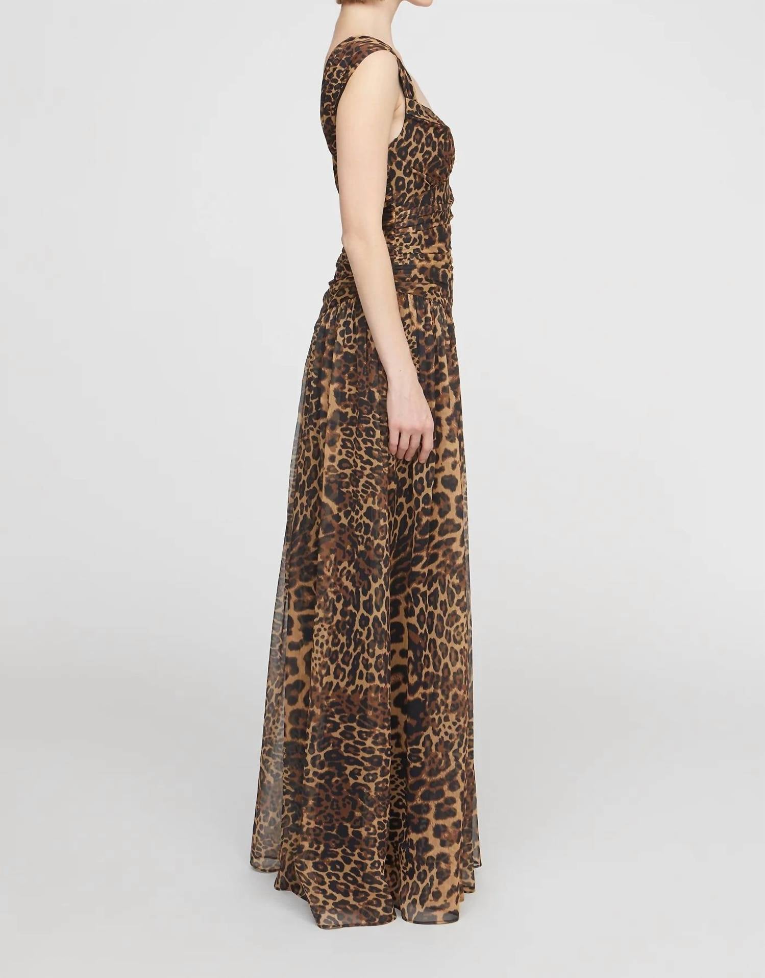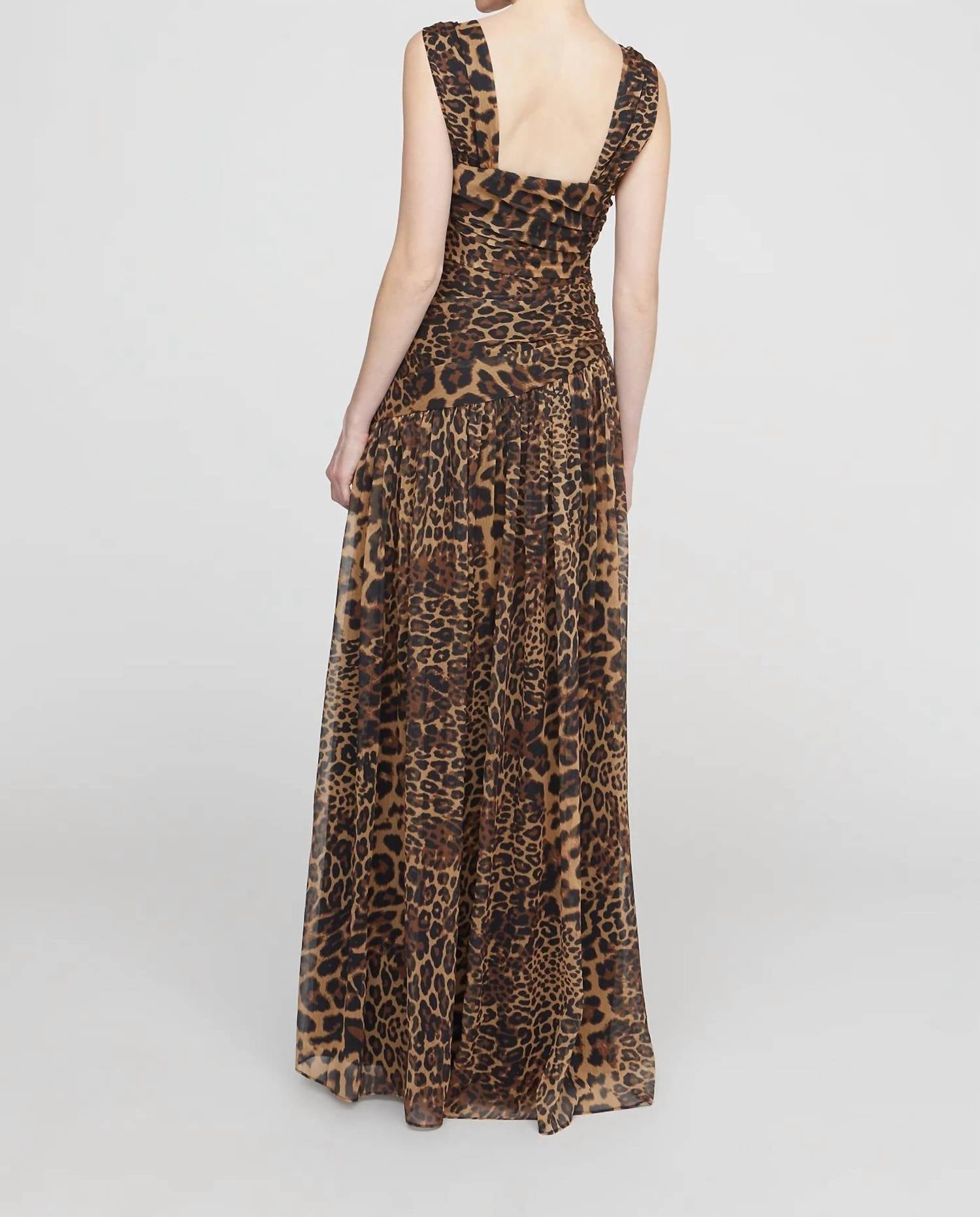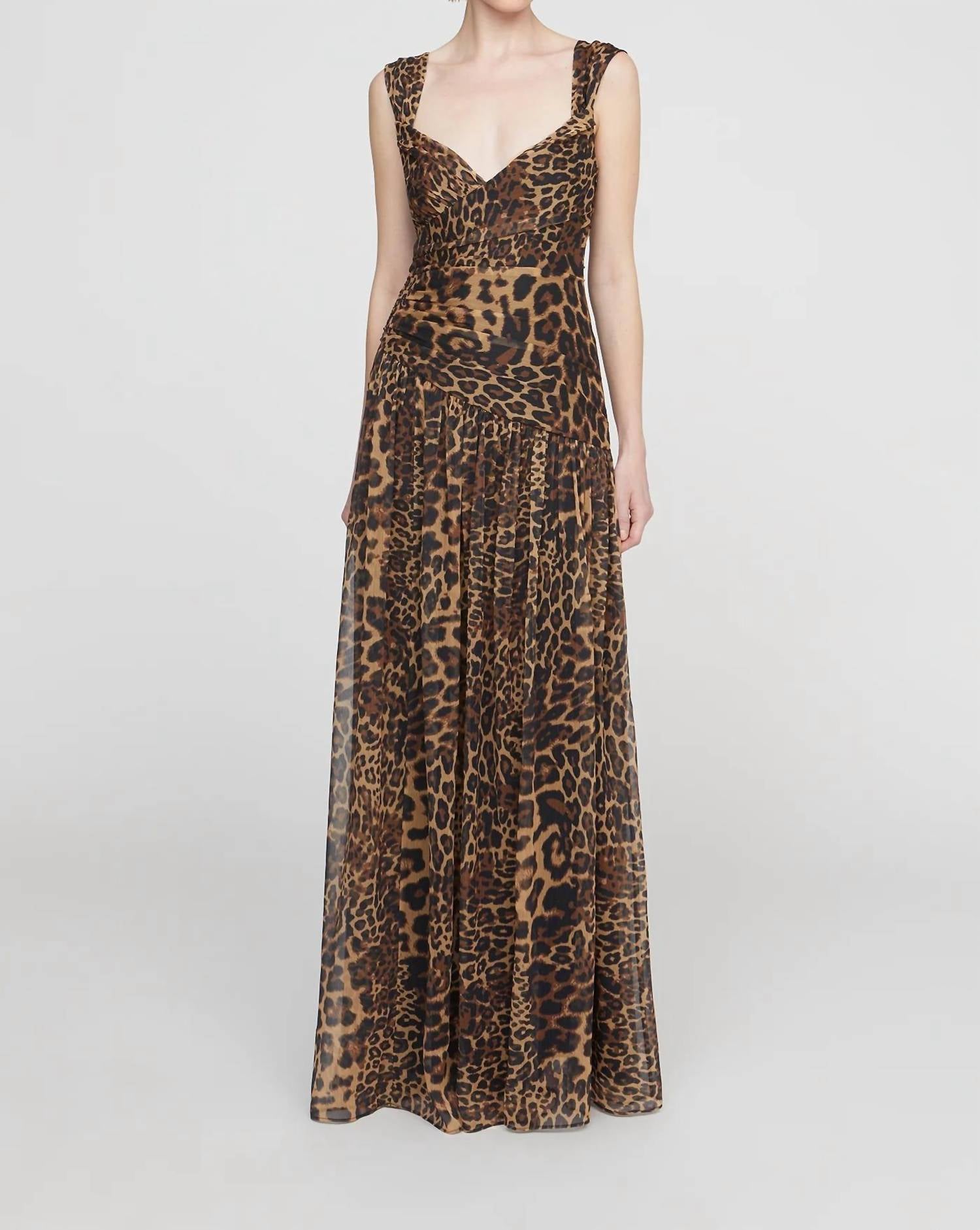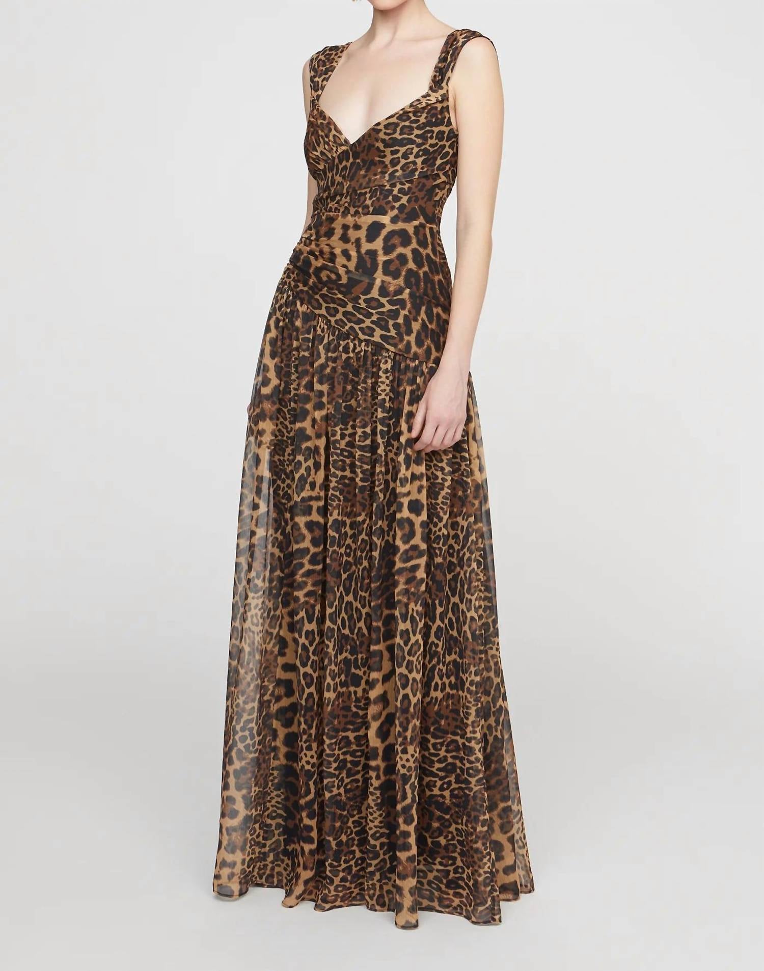 A maxi dress that is just as cute as it is comfortable. Make a bold statement with the Claudia Chiffon Maxi Dress by HALSTON HERITAGE, perfect for any special occasion. This sleeveless gown in a striking leopard print features a fit and flare silhouette and a sophisticated V-neckline. Made from 100% polyester, it boasts a floor-length design with a fully lined non-stretch finish for a refined look. Closure: Pull-on. Ideal for summer holiday parties, this piece is your go-to for events like Thanksgiving. Available in size 6, with the model wearing a size 2.