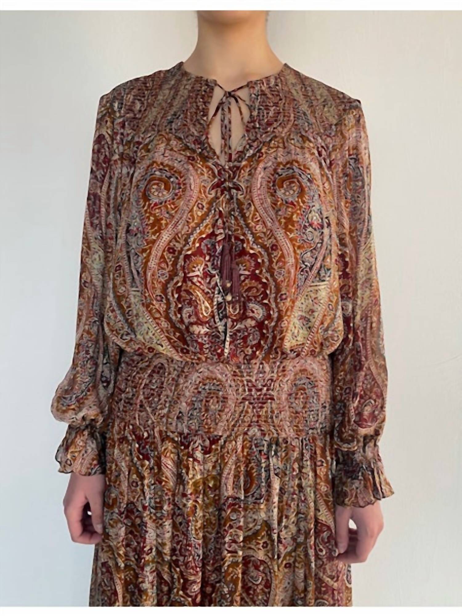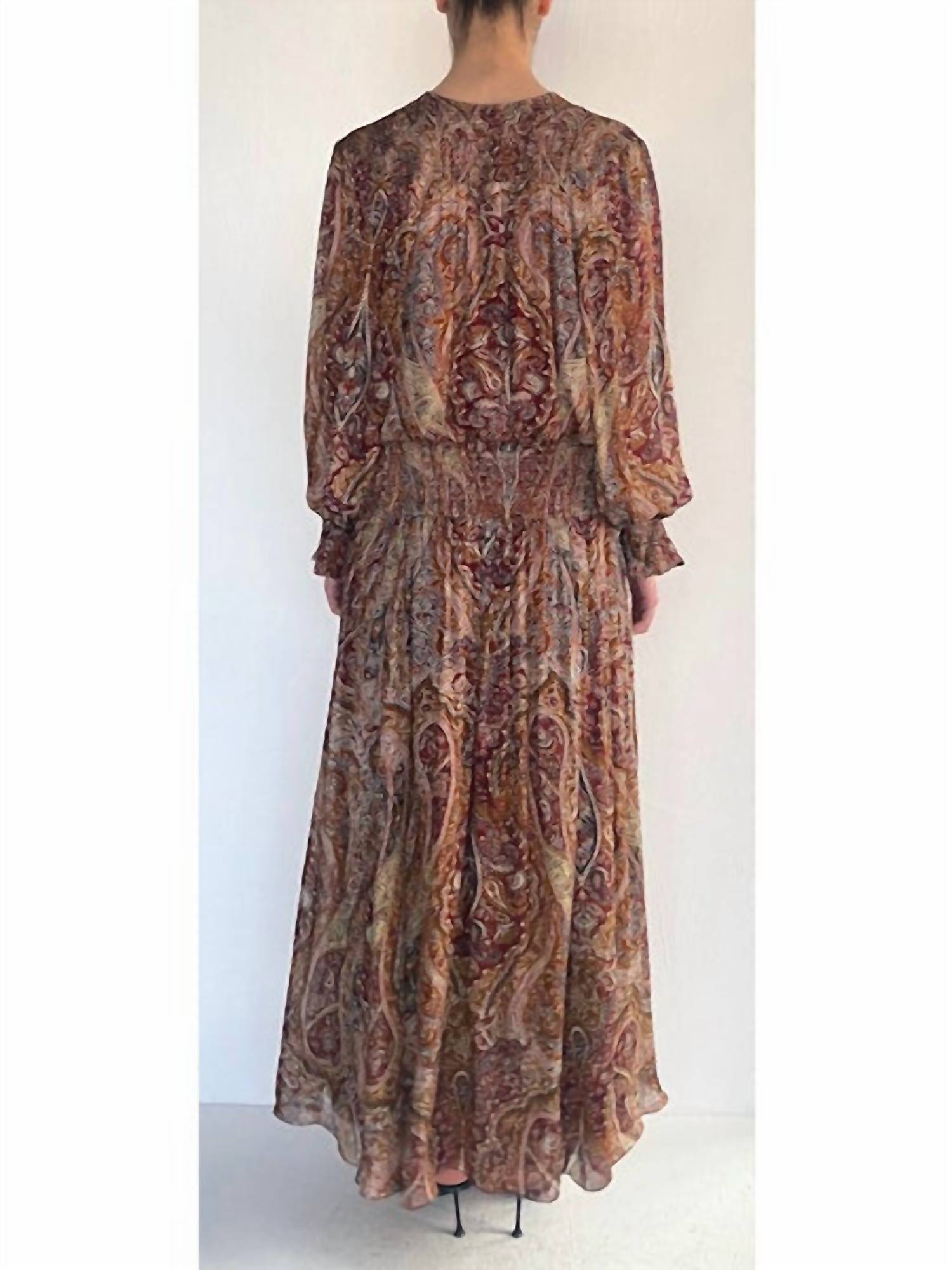 Style this maxi with your favorite statement necklace and sandals for the perfect look. Introducing the Smocked Detail Maxi Dress by Hemant & Nandita, an embodiment of boho-chic style in rich burgundy. This elegant A-line silhouette features long sleeves and a crewneck, crafted from lightweight viscose chiffon. Closure: Tie closure. Care: Hand wash for lasting quality. Perfect for engagements and special occasions, this dress seamlessly blends comfort and grace, making it ideal for spring and the 4th of July.