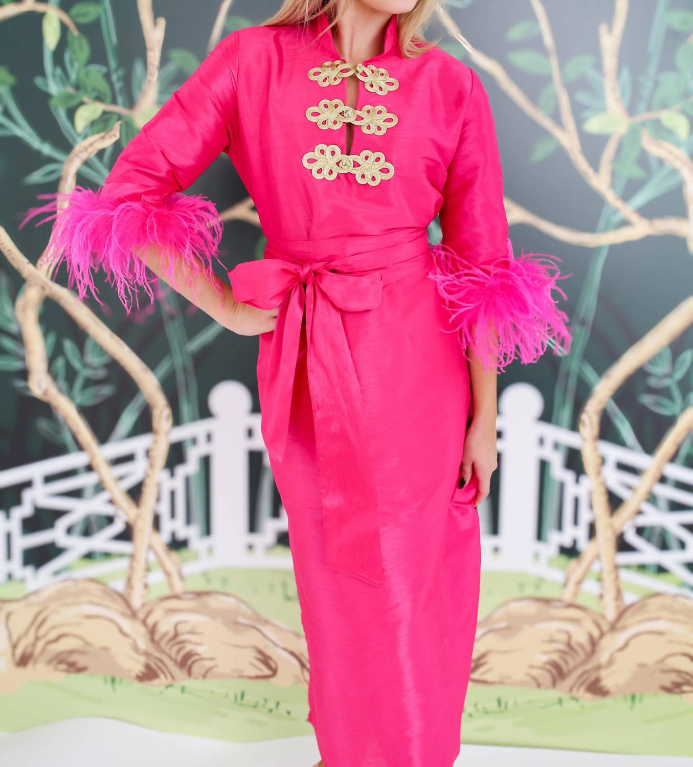 Style this maxi with your favorite statement necklace and sandals for the perfect look. Unveil your inner diva with the Bette Bouvier Long Dress by House of MBR, a masterpiece in hot pink embodying Hollywood Regency flair. This kaftan silhouette features three-quarter sleeves, vintage gold button closures, and side slits, all nestled in luxurious Dupioni style polyester. Crafted with care in Los Angeles, it is fully lined with pink poly satin for an opulent touch and convenient pockets for practicality. Maintenance is a breeze with dry clean care instructions, making it the perfect choice for spring holiday parties and Chinese New Year celebrations.