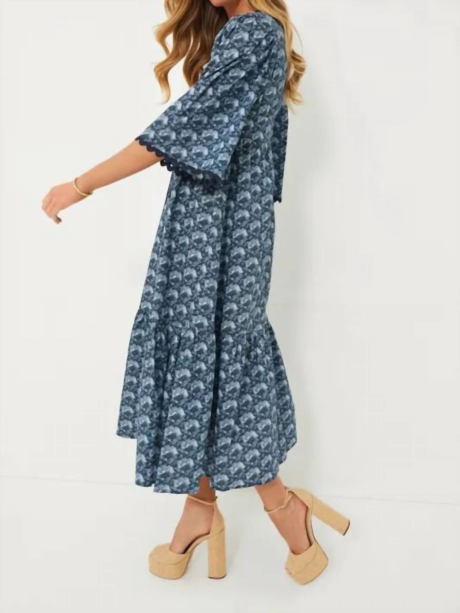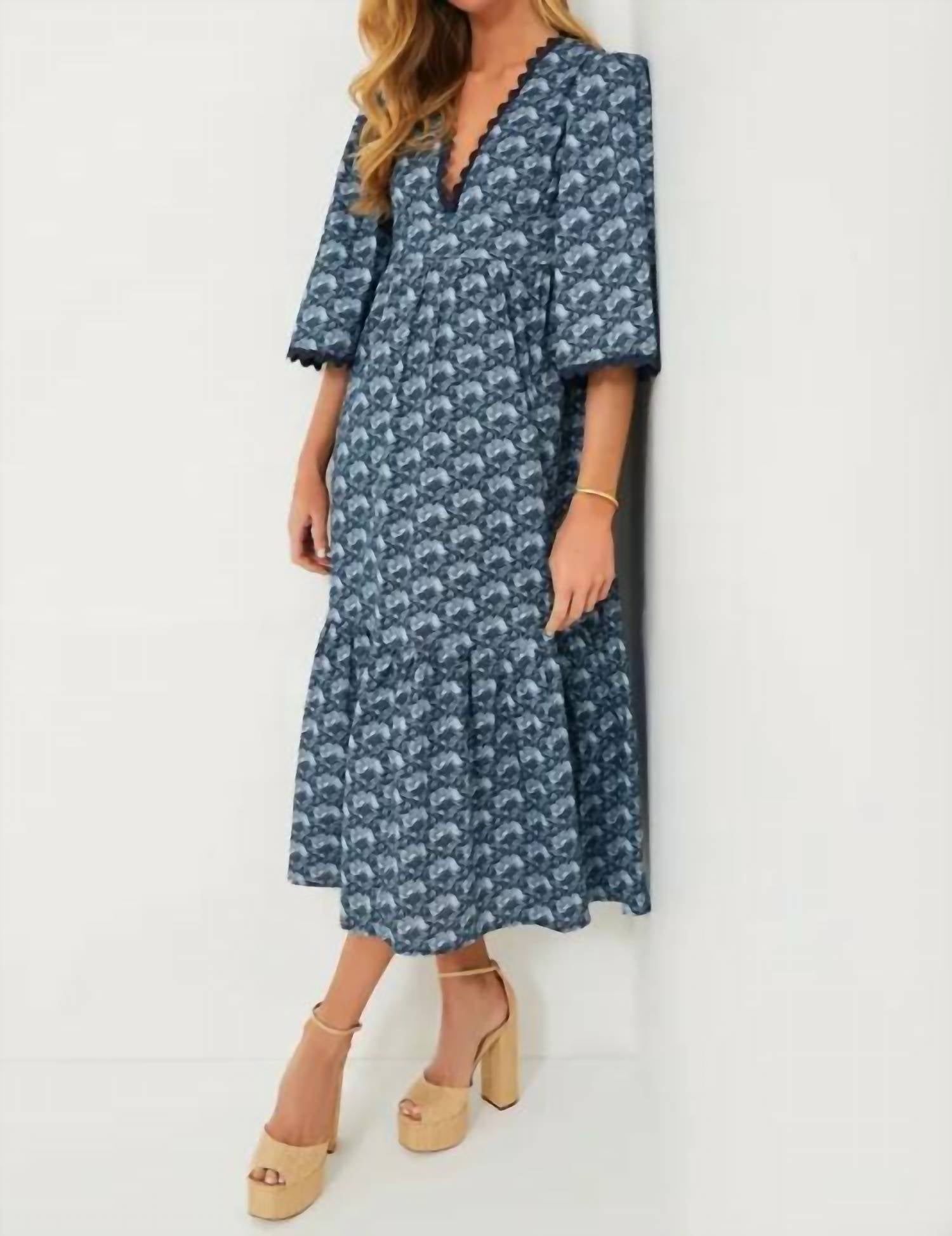 Who doesn't love a good maxi dress? This one you'll be reaching for season after season. Hyacinth House presents the Rhoda Ric-rac Maxi Dress, a chic staple in slate blue floral perfect for any season. This maxi dress features elbow-length bell sleeves with playful ric-rac trim and a flattering V-neck, complemented by a tiered skirt and an empire waist for a classic fit and flare silhouette. Made from 100% lightweight cotton with a full lining, it includes a convenient back zip closure. Care for this timeless piece by hand washing and laying it flat to dry.
