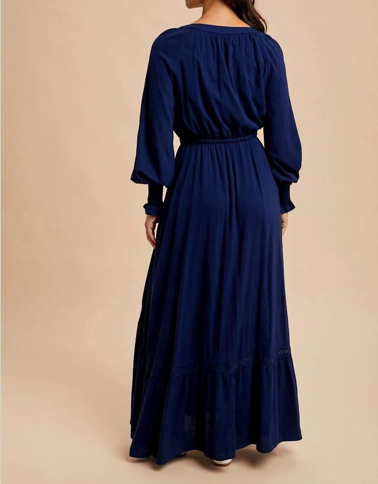 A maxi dress that is just as cute as it is comfortable. Elevate your evening attire with the Anne Maxi Dress by IN-LOOM, crafted in a luxurious indigo hue. This long-sleeve dress boasts a soft cotton blend with a beautiful lace inset design at the skirt panel. Featuring a tie closure and a tunneled drawstring elastic waistband for an adjustable fit, the A-line silhouette is perfect for a quiet luxury feel. Ensure easy maintenance with machine wash care.
