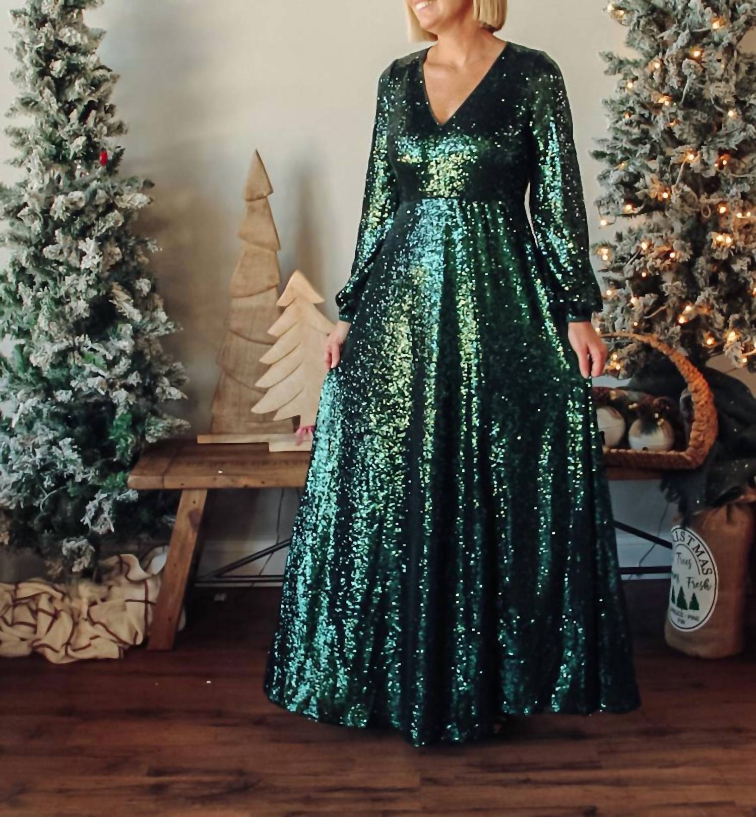 A maxi dress that is just as cute as it is comfortable. Dazzle in the Holiday Sequin Dress by IN-LOOM, an elegant choice for festive celebrations. This women’s maxi dress comes in a striking pine green, featuring long sleeves and a V-neckline that enhances the empire waist silhouette. Adorned with textured sequins, it creates a shimmering effect perfect for making a statement at holiday parties. Please note that specific care instructions are not provided; we recommend handling with care due to its intricate detailing.