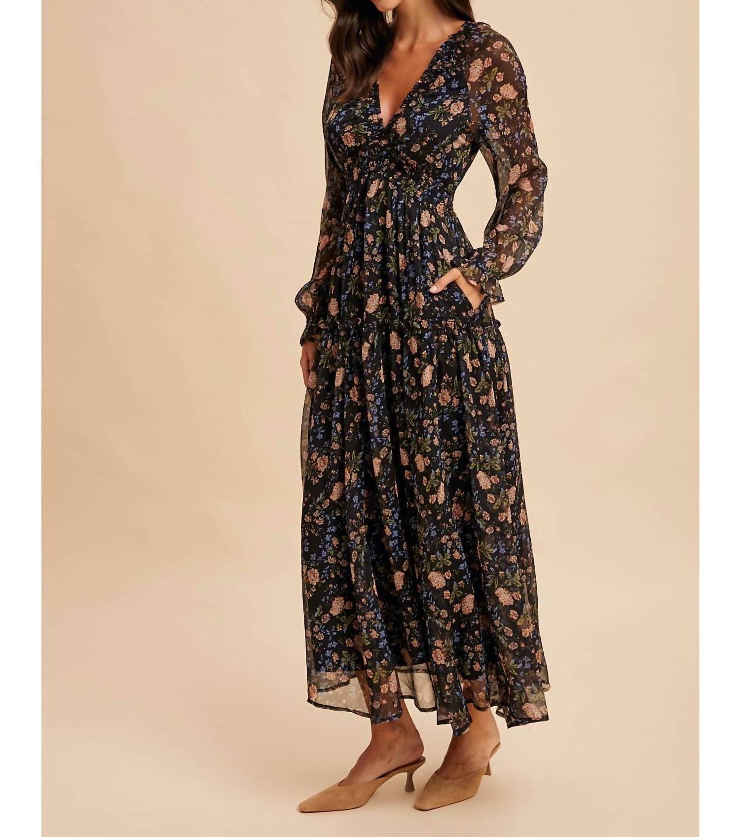Who doesn't love a good maxi dress? This one you'll be reaching for season after season. Elevate your holiday party wardrobe with the Long Sleeved Smocked Maxi Dress by IN-LOOM, featuring an enchanting Midnight Floral pattern. This A-line dress with long sleeves is crafted from a 100% Polyester outer and a 100% Rayon inner for a luxurious feel. Closure comes with a charming tie-back design, making it both practical and romantic. Care for this piece with dry clean instructions to maintain its boho chic allure.