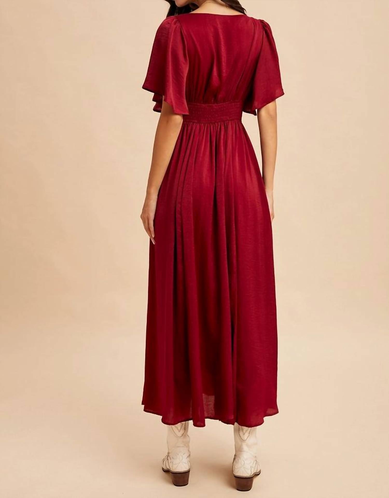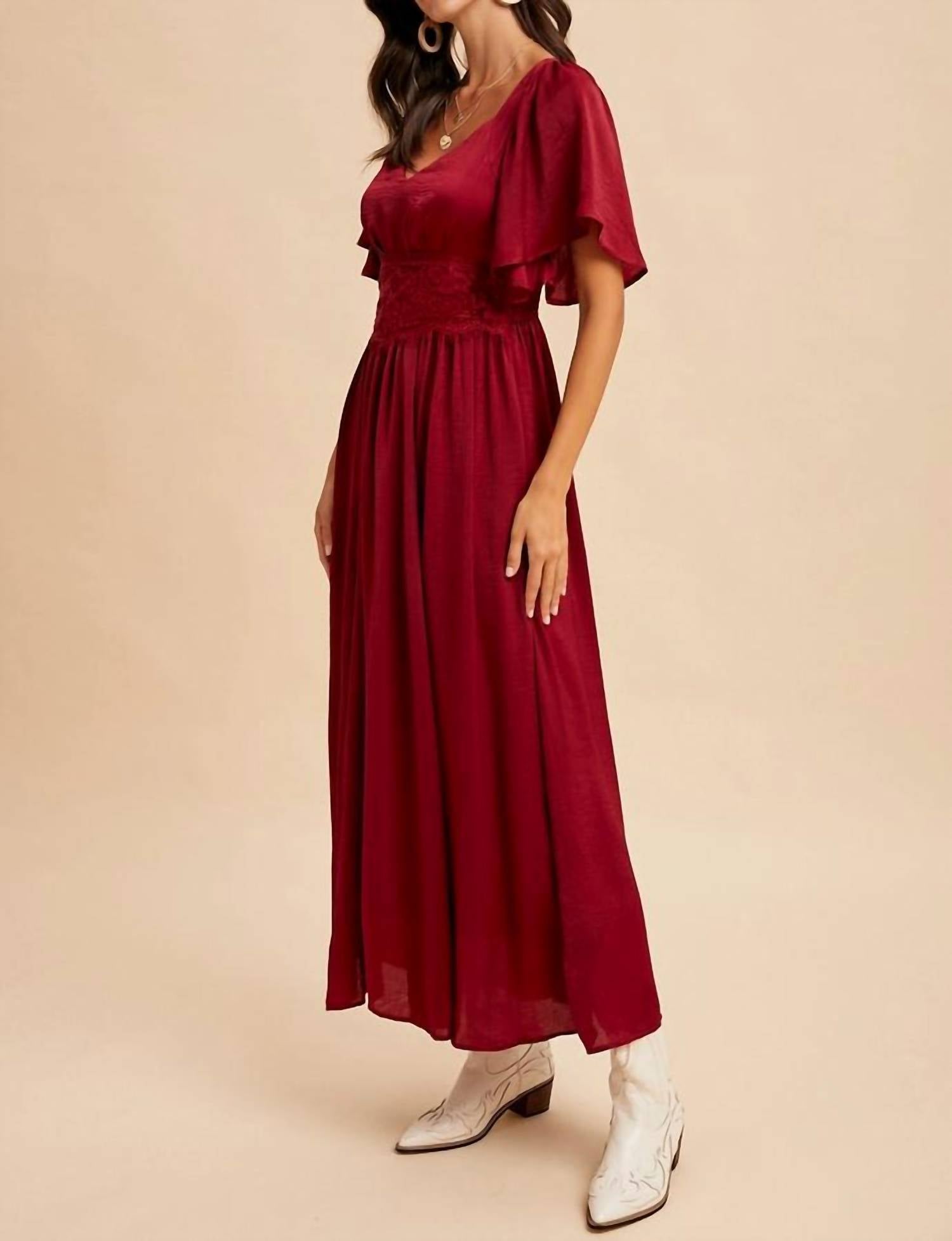 Who doesn't love a good maxi dress? This one you'll be reaching for season after season. Discover the Satin Lace Maxi Dress by IN-LOOM, a stunning choice for evening events in a rich Cranberry hue. This sheath silhouette features short flutter sleeves and a flattering V-neckline, accentuated by a lace-detailed waist. The satin material offers a luxurious feel and is fully lined for comfort, with a discreet side zipper closure. Care is simple with machine wash instructions, making it as practical as it is elegant—perfect for showcasing quiet luxury this fall.