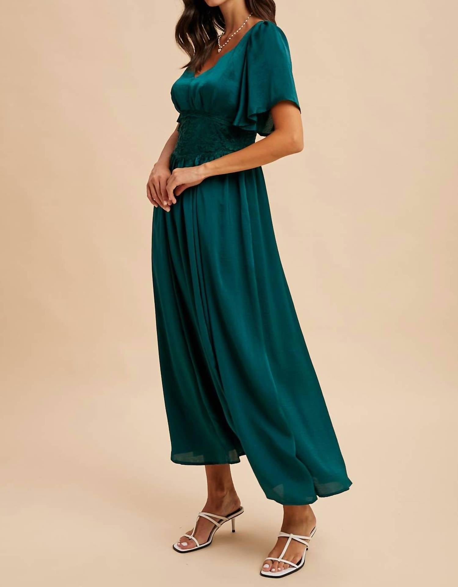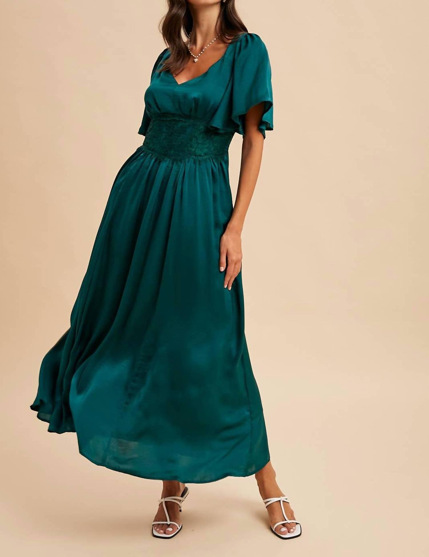 Style this maxi with your favorite statement necklace and sandals for the perfect look. Make a statement at your next evening event with the elegant Washed Satin Maxi Dress by IN-LOOM. This dress features short flutter sleeves and a flattering V-neckline, enhanced by a lace-detailed waist. Crafted from 100% polyester, it includes a side zipper closure and is fully lined for added comfort. Ideal for spring, this green A-line silhouette is easy to care for—simply machine wash and tumble dry.