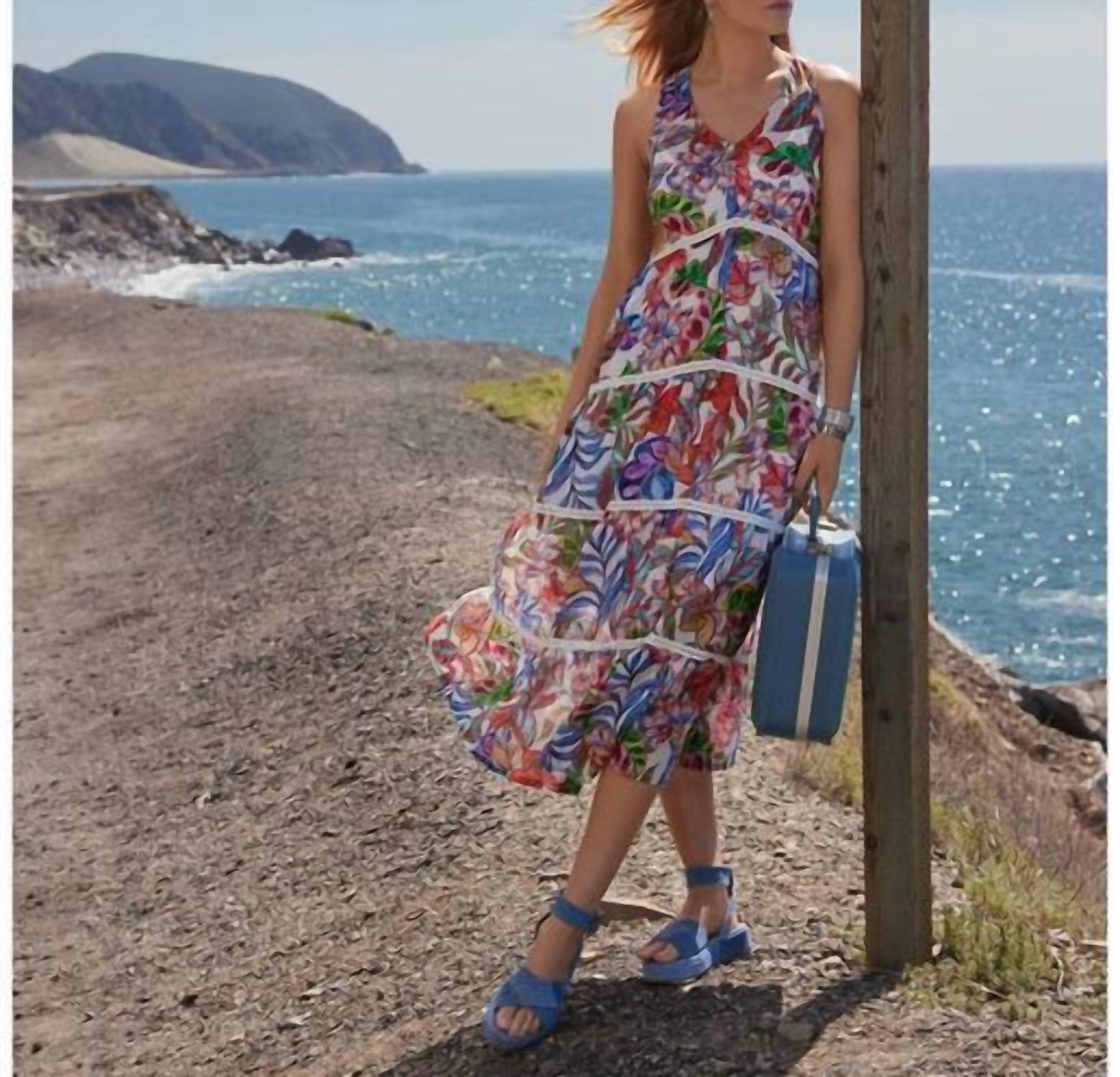 A maxi dress that is just as cute as it is comfortable. Made from 100% breathable cotton, the Chevron Tiered Tank Dress features a vibrant color and intricate pattern. This sleeveless dress has a V-neckline and an empire waist, showcasing beautifully seamed chevron tiers that flow into a full-length maxi skirt. Pair it with delicate jewelry and a raffia bag for a stylish, vacation-ready outfit. The model is 5'8 1/2" and wearing a size Small. Measurements for size Medium: Bust - 41 1/2" Front Length - 52 1/2" Machine Wash