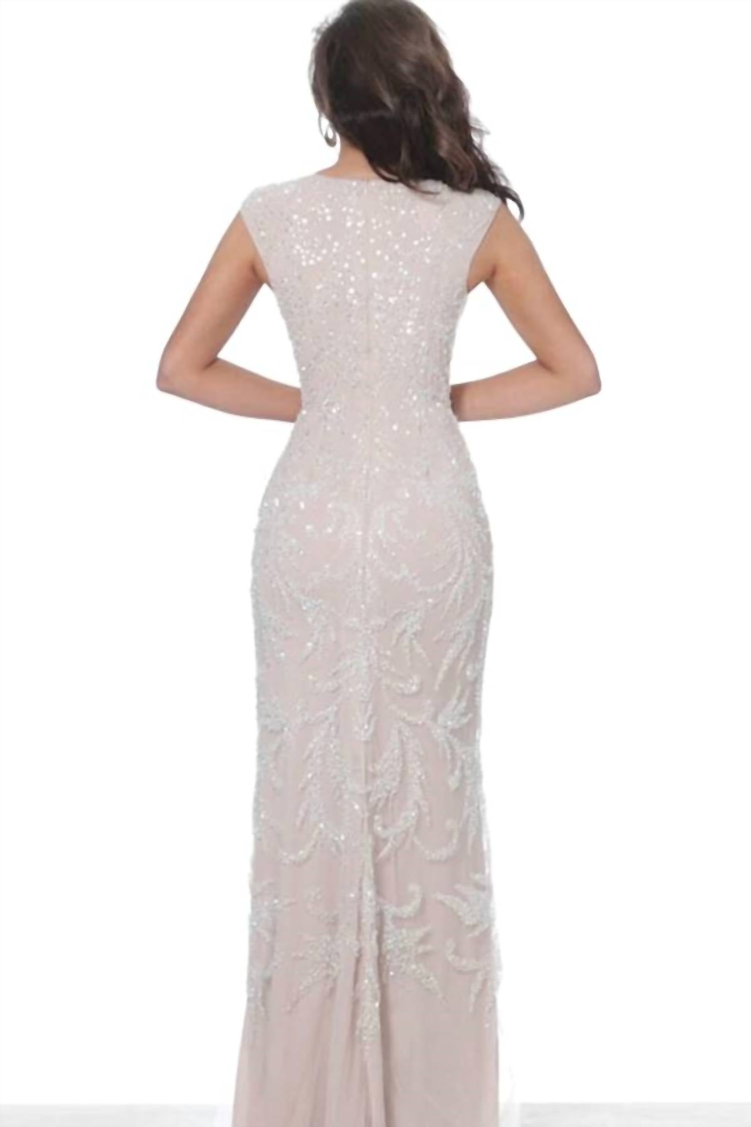 A maxi dress that is just as cute as it is comfortable. Turn heads in this showstopping Jovani dress! Featuring a sparkling beaded plunging V-neckline, mini cap sleeves and a zipped-up back, this shimmering silver nude gown will have everyone watching you shimmer and shine across the dance floor. Make an unforgettable entrance—YOWZA! Beaded. Mini cap sleeve. Shimmer.