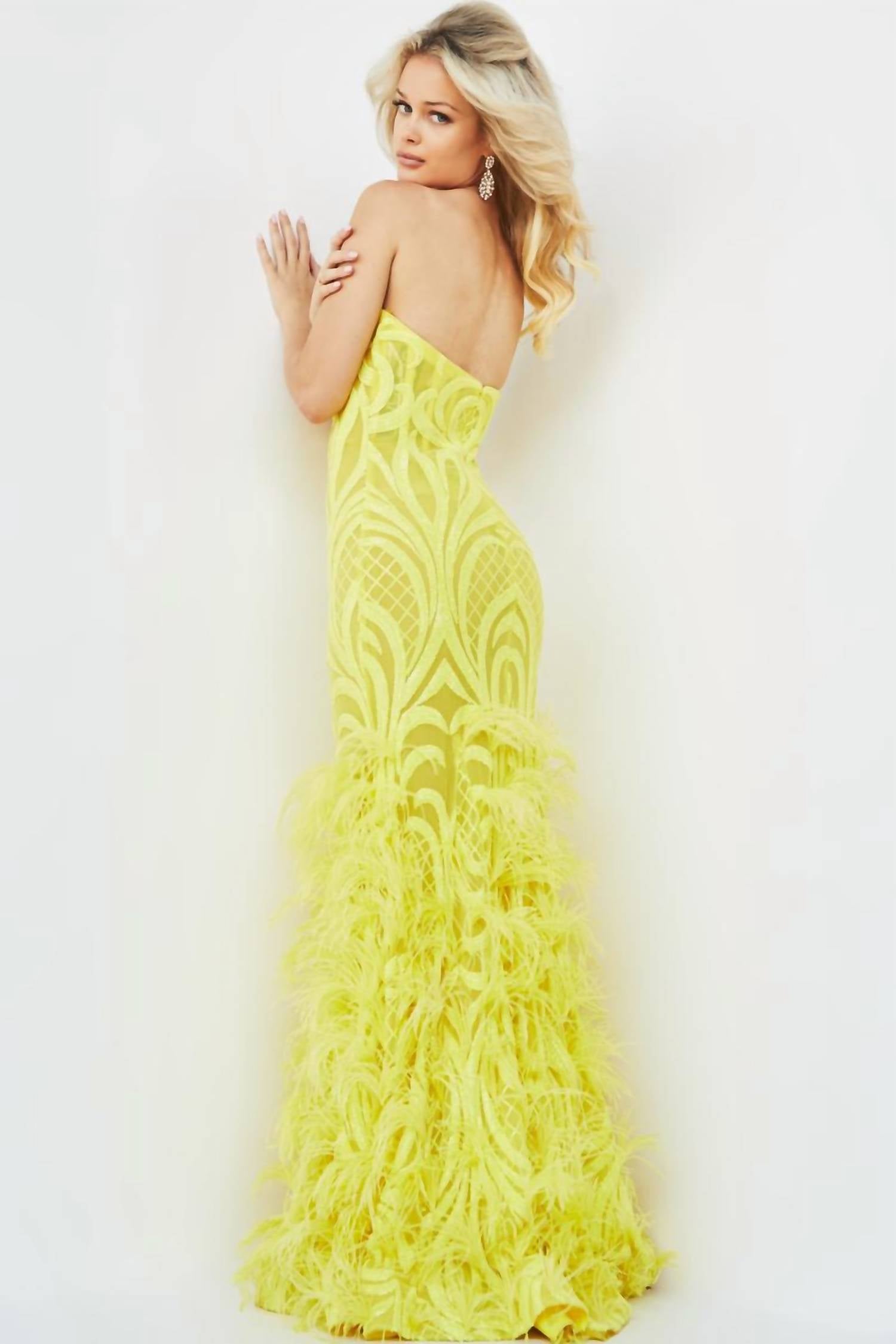 Style this maxi with your favorite statement necklace and sandals for the perfect look. Introducing the Sequin Embellished Sheath Prom Dress by JOVANI, a stunning choice for your next evening event. This strapless dress features a sheath silhouette adorned with sequins and a sweetheart neckline, exuding quiet luxury. The floor-length skirt is textured with a unique feather bottom, offering a dramatic yet elegant presence. Closure: Zip closure. Ideal for spring occasions, this yellow maxi dress is a perfect embodiment of timeless glamour.