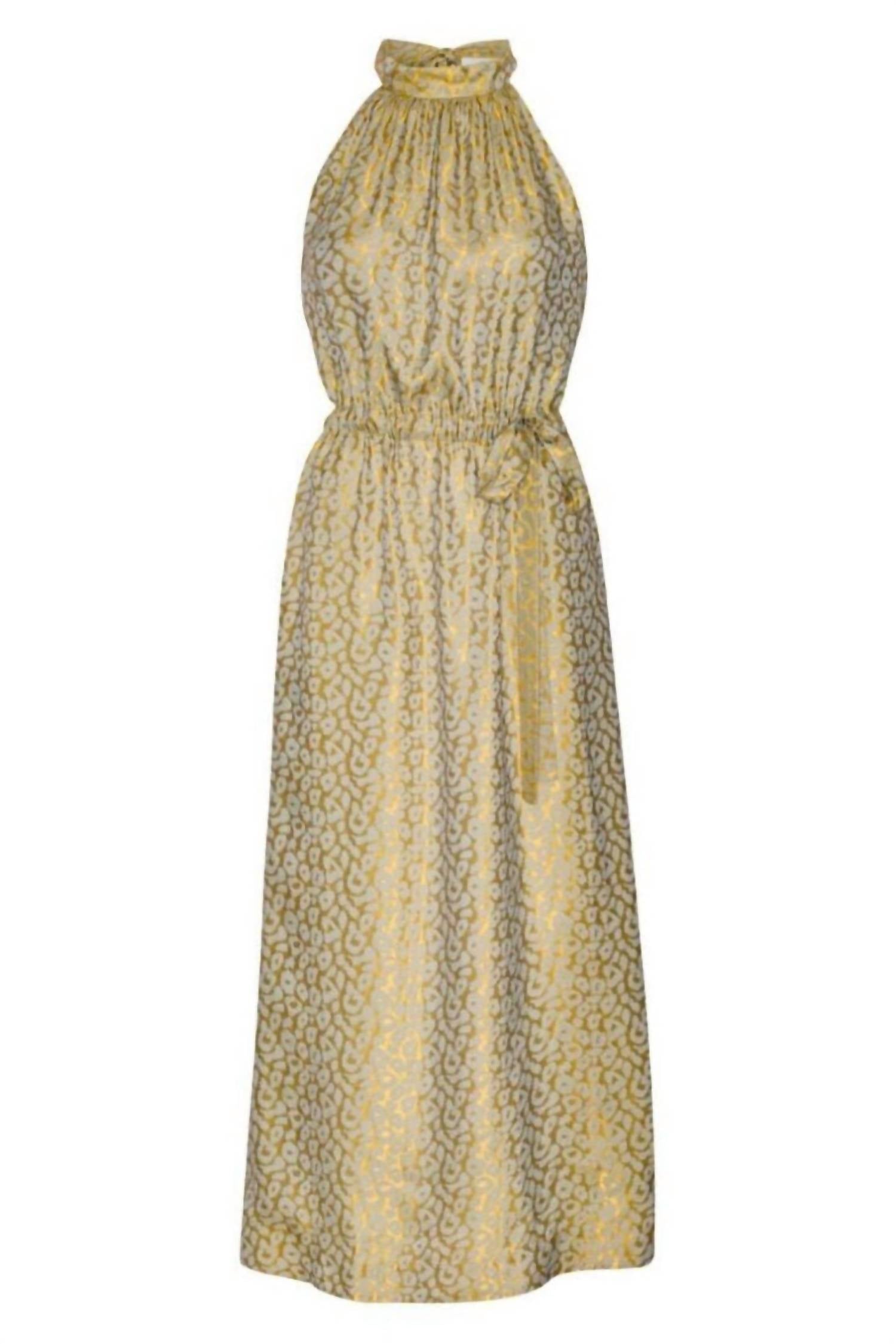 Style this maxi with your favorite statement necklace and sandals for the perfect look. Introducing the Women's Layla Dress by Karmamia, a striking choice for your dinner party wardrobe. This maxi dress in Gold Leo Silk features an A-line silhouette with a trendy animal pattern. Designed with a halter neckline and sleeveless cut, the dress is finished with a tie closure. Embrace maximalist style this spring with a piece that combines elegance and boldness.
