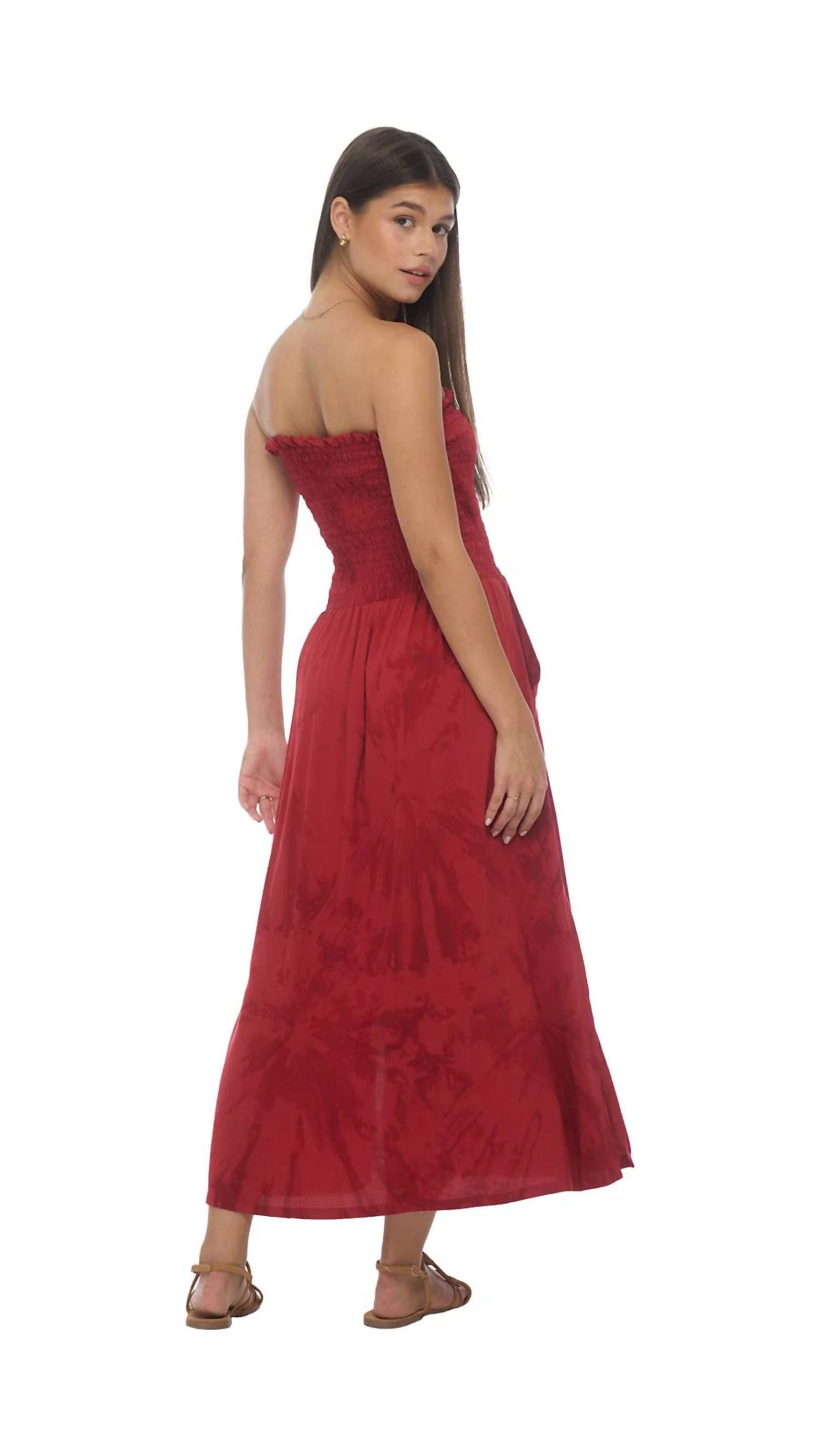 Who doesn't love a good maxi dress? This one you'll be reaching for season after season. Embrace understated elegance with the Portofino Midi Dress by Khush, designed in a striking TD Murky Scarlet hue. This strapless dress features a fitted smocked top that adjusts beautifully to your curves, complemented by a relaxed midi-length skirt with convenient side pockets. Crafted from 100% Rayon and made in Bali, this fit and flare silhouette is perfect for any holiday party or summer occasion. Closure: Pull on. Care: Hand wash cold, line dry.