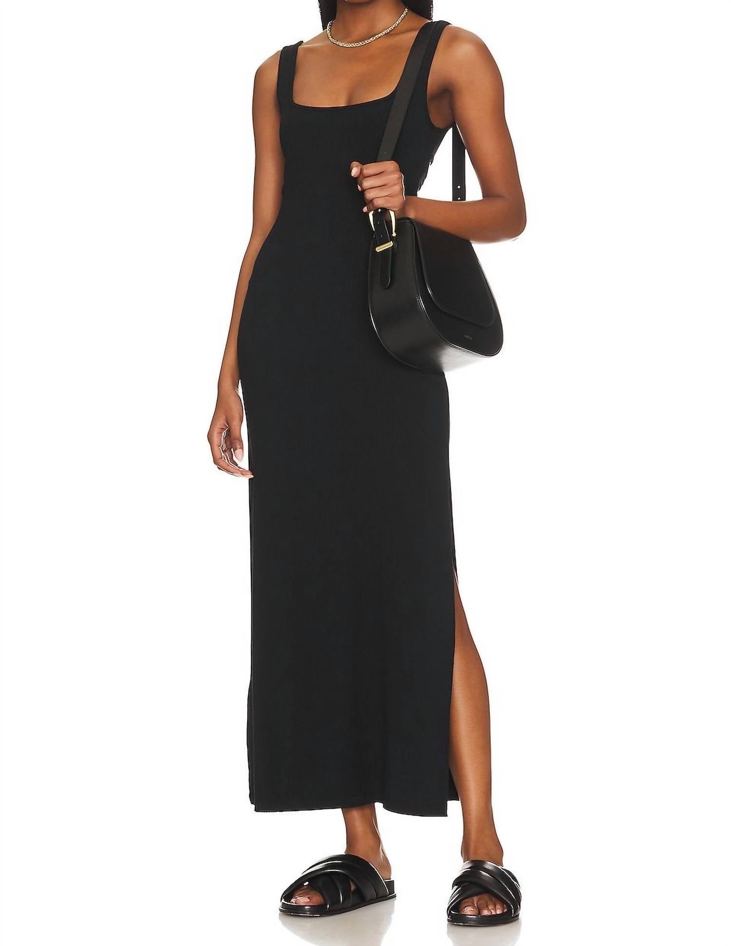 Style this maxi with your favorite statement necklace and sandals for the perfect look. Introducing the Mara Sleeveless Square-neck Dress by L*SPACE, a chic and elegant choice for any evening event. This maxi dress in classic black, crafted from 90% lyocell and 10% elastane, offers a flattering bodycon silhouette and ankle-grazing length of 53.50 inches. The seamless pull-on design is accentuated by a dramatic low back cutout with a twist detail, high side slits, and an interior shelf bra for comfort. Care for this stunning piece by hand washing in cold water to maintain its shape and color.