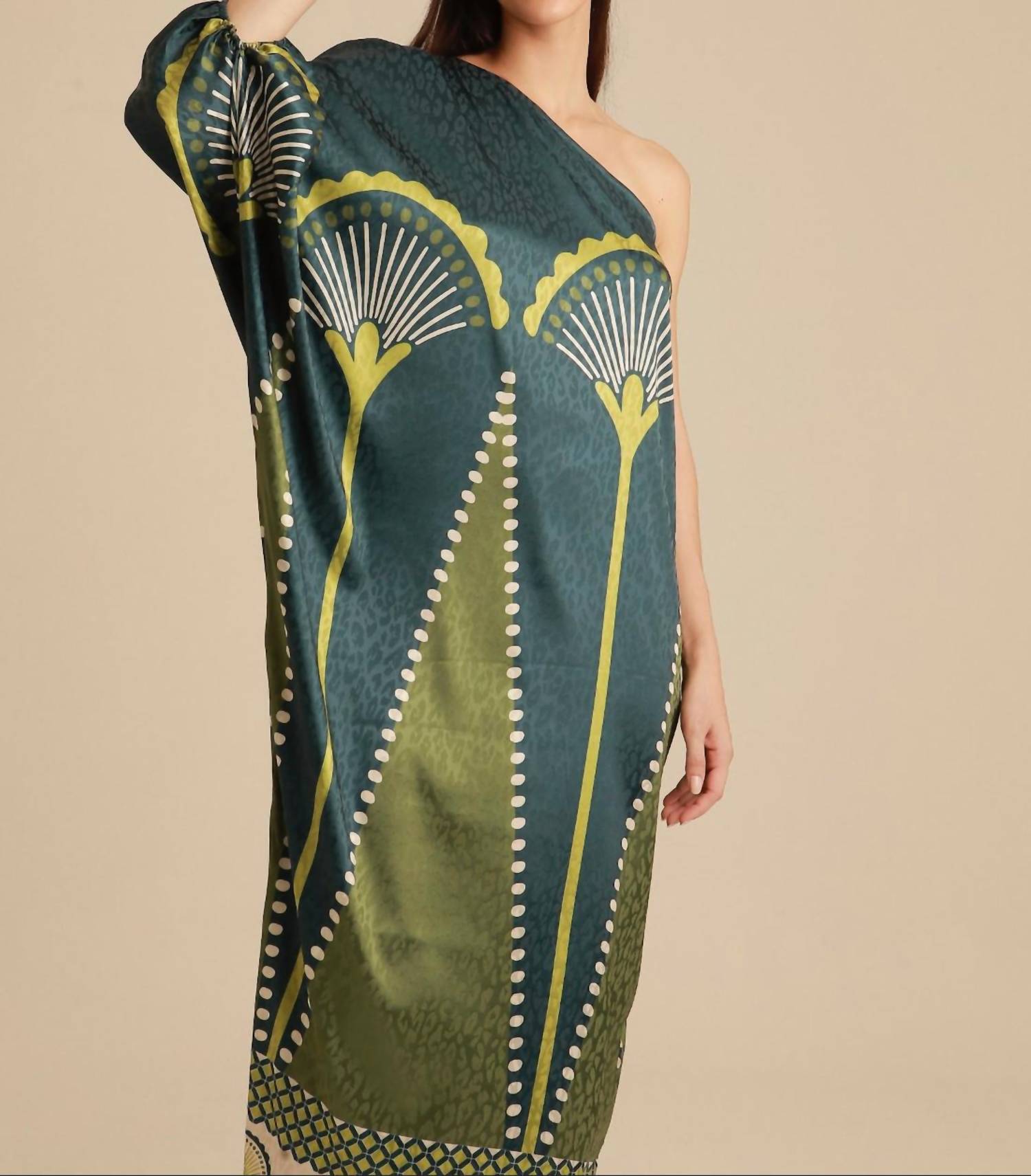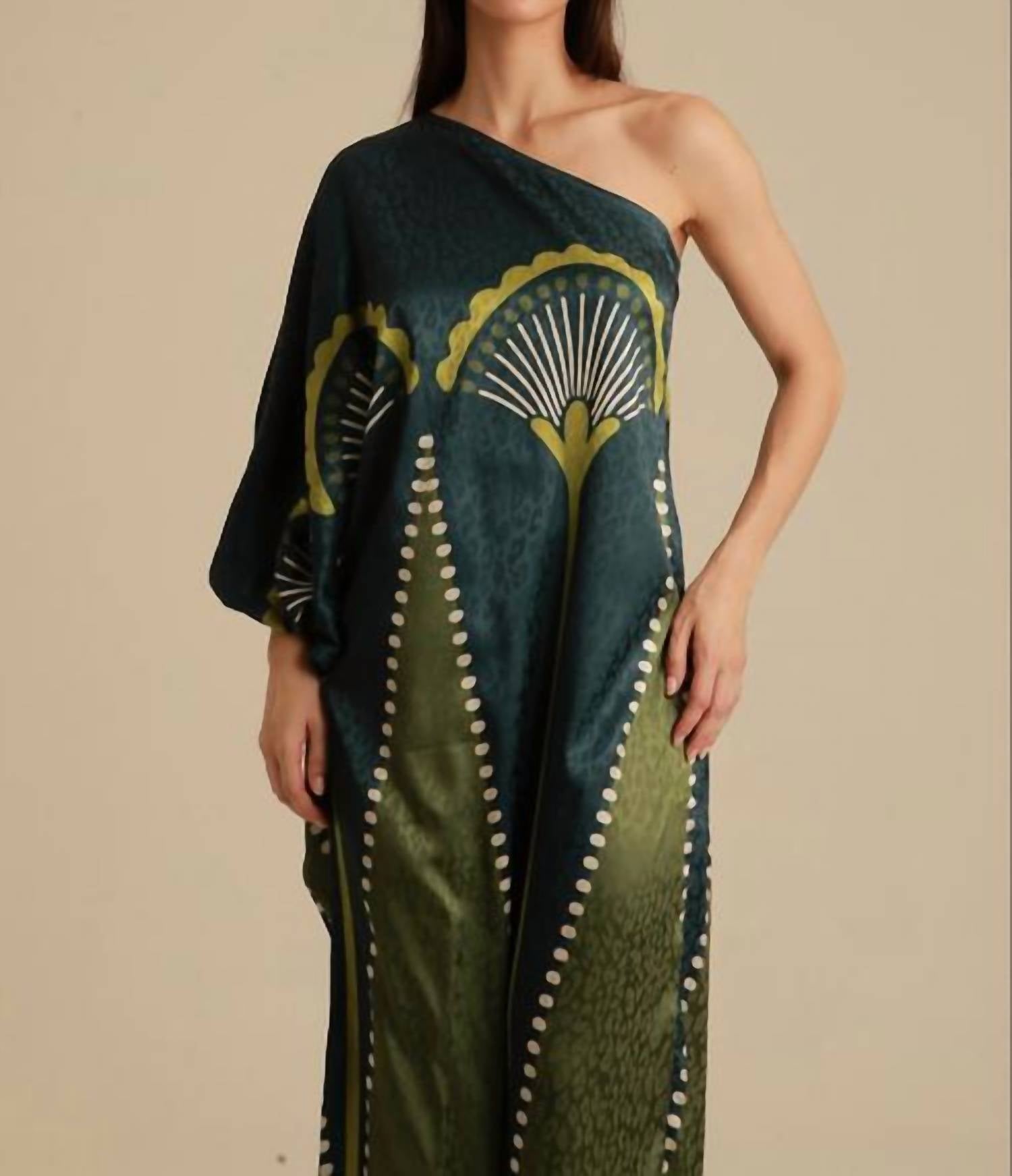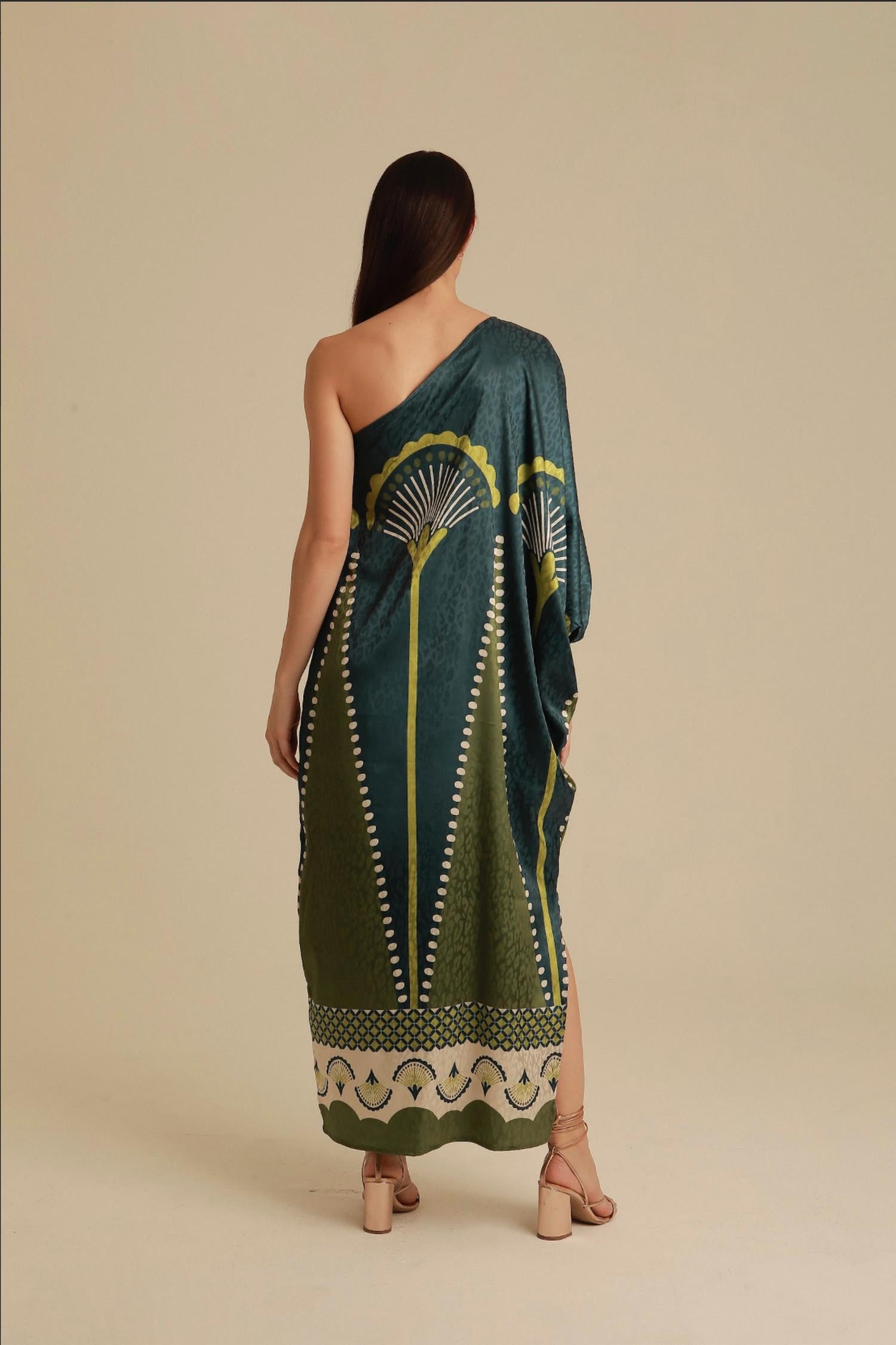 Who doesn't love a good maxi dress? This one you'll be reaching for season after season. Introducing the Nova Dress by Lavi, a stunning off-the-shoulder kaftan design in a vibrant green hue. This maxi dress boasts a sophisticated pattern and three-quarter sleeves, offering an elegant silhouette ideal for spring events. Care instructions: Dry clean recommended. Perfect for women seeking both modern style and timeless elegance.