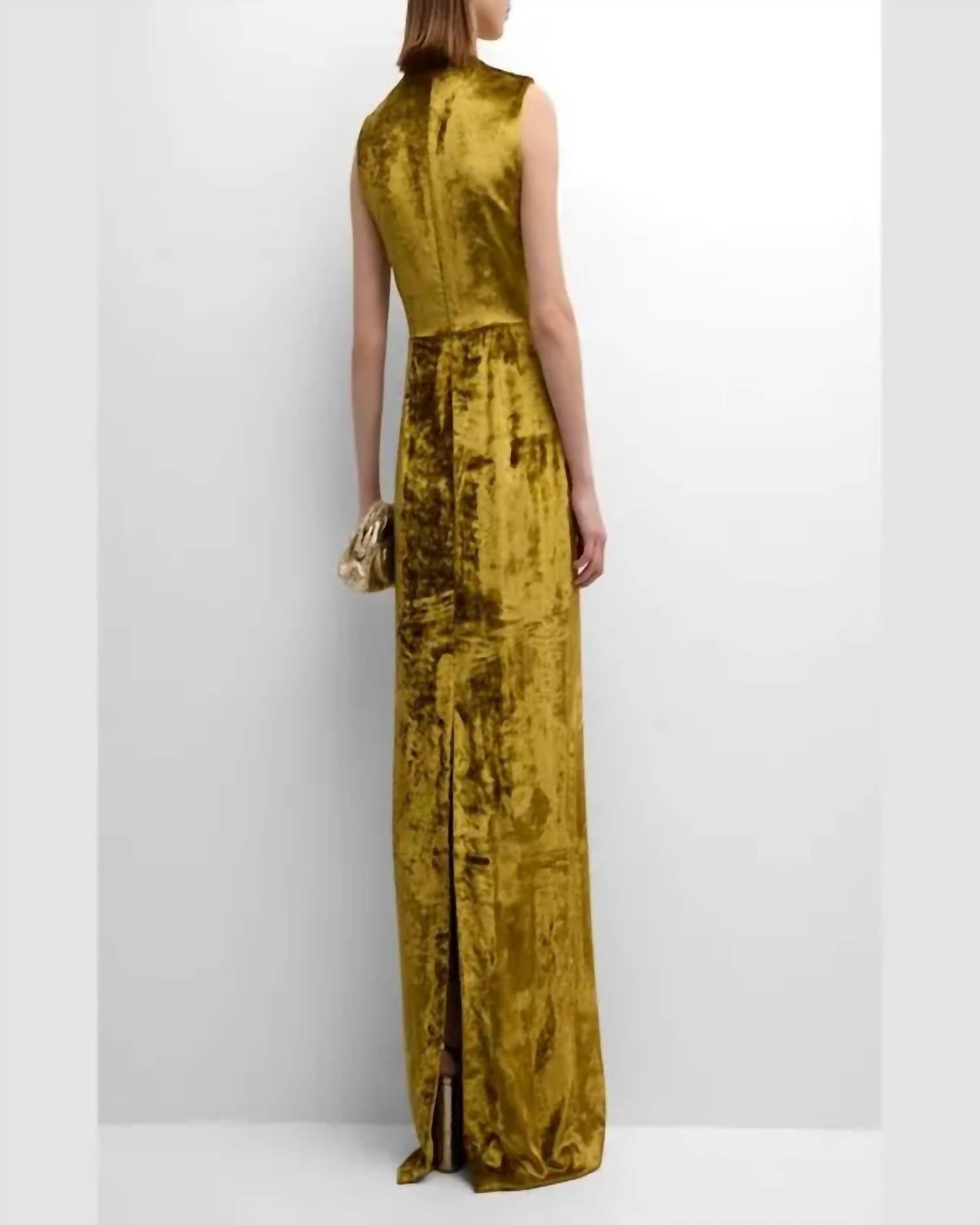 A maxi dress that is just as cute as it is comfortable. Introducing the Lela Rose Embroidered Sleeveless Crushed Velvet Gown, a goldenrod masterpiece designed for the discerning woman who values opulence and luxury. This sleeveless gown, made from a sumptuous blend of viscose and cotton, wraps you in a textured embrace with beaded embroidery adorning the chest. Featuring a sleek column silhouette and a high crew neckline, it elegantly flatters the form, while the back center slit ensures ease of movement. Closure: Zip closure. Care: Professional dry cleaning recommended to maintain the embroidery's integrity.