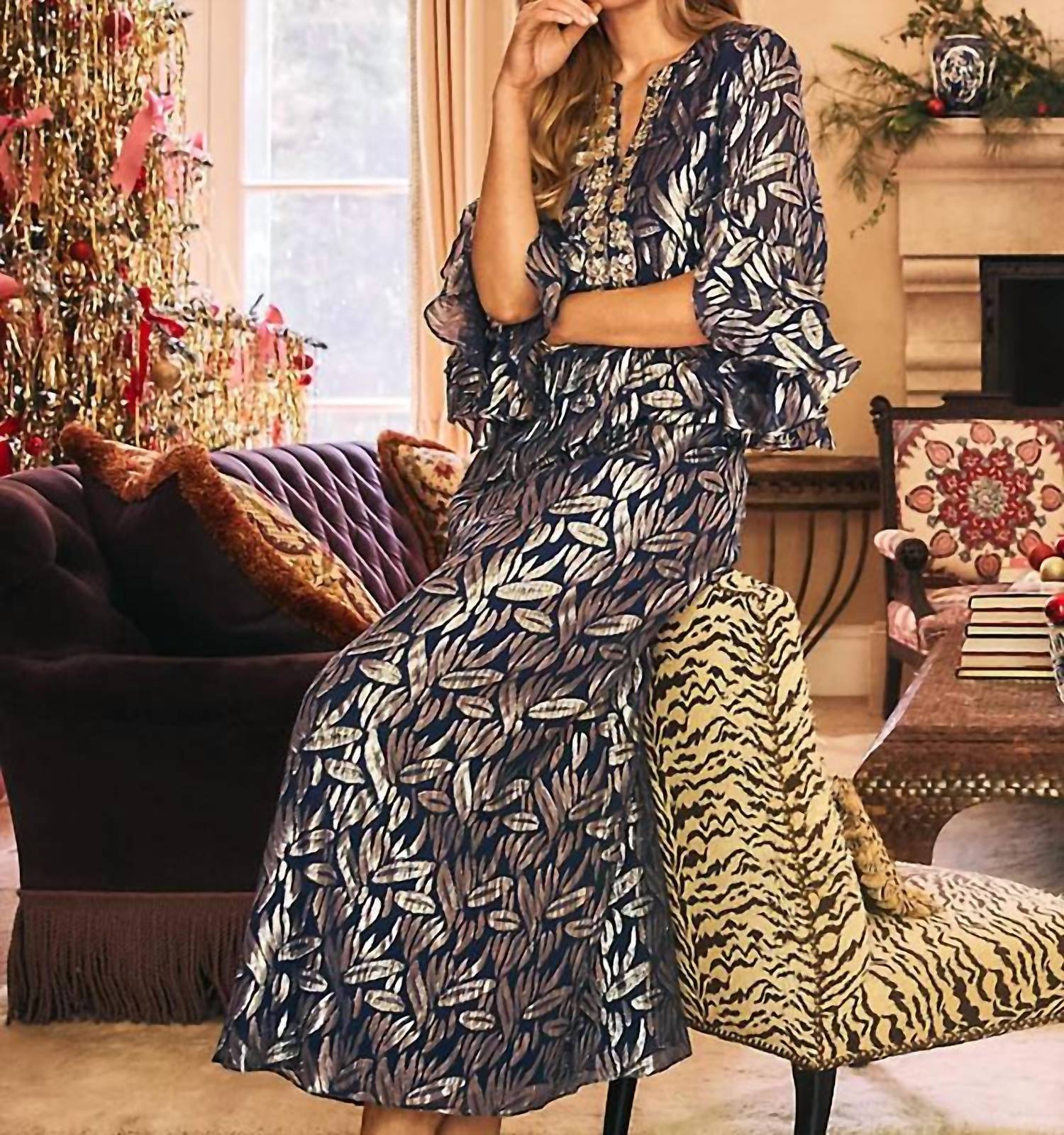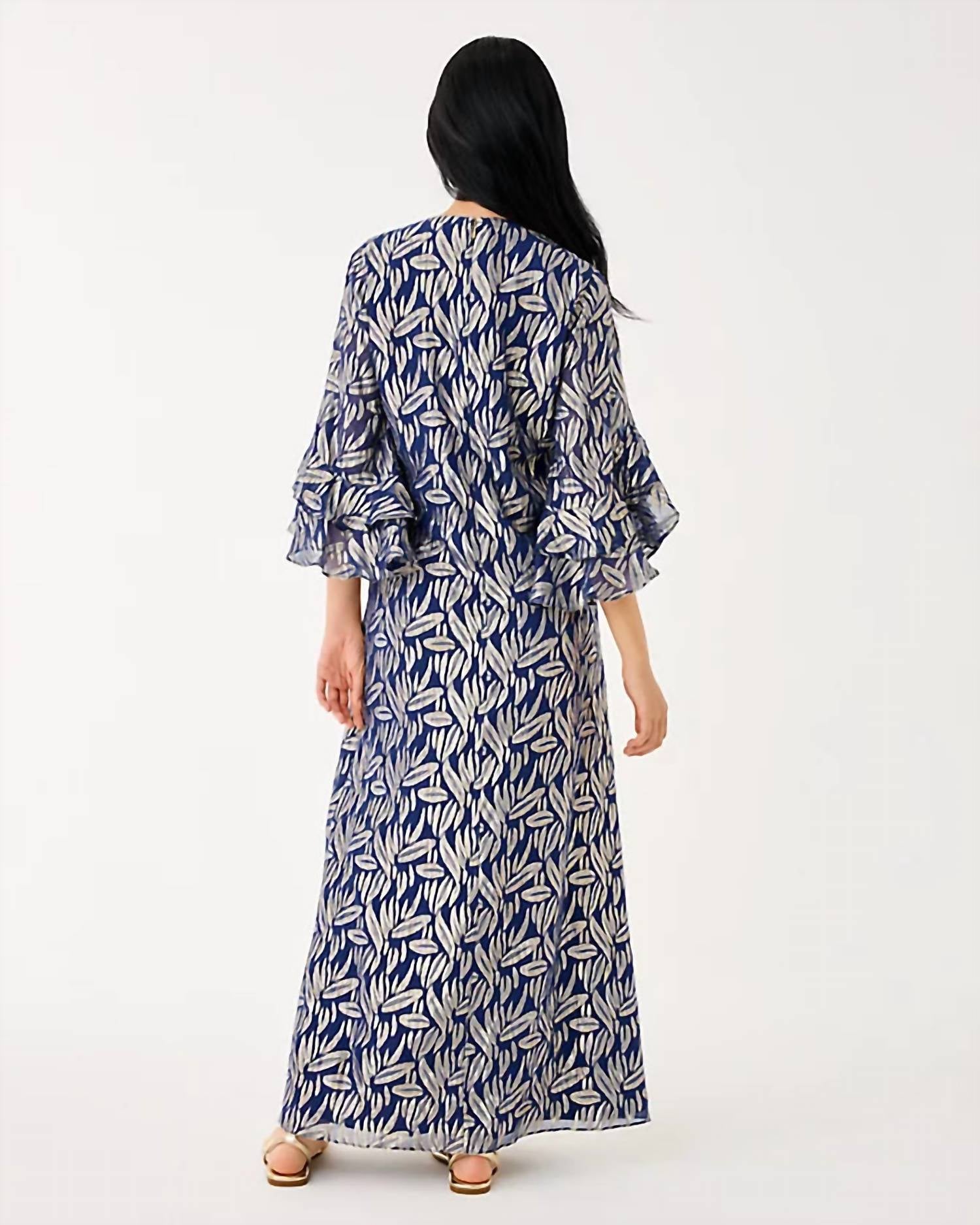 A maxi dress that is just as cute as it is comfortable. Embrace boho chic fashion with the Women's Bellina Silk Maxi Caftan by Lilly Pulitzer, an elegant vacation essential. This maxi dress features a straight fit and 3/4 length flounce sleeves, measuring 57” from the top of the shoulder to the hem in size small/4. Crafted from luxurious silk with a vibrant low tide navy floral pattern, this caftan offers a comfortable fit at the chest and hip while providing more room at the waist. Imported and designed with spaghetti straps for effortless style, it completes your look with a simple pull-on closure.