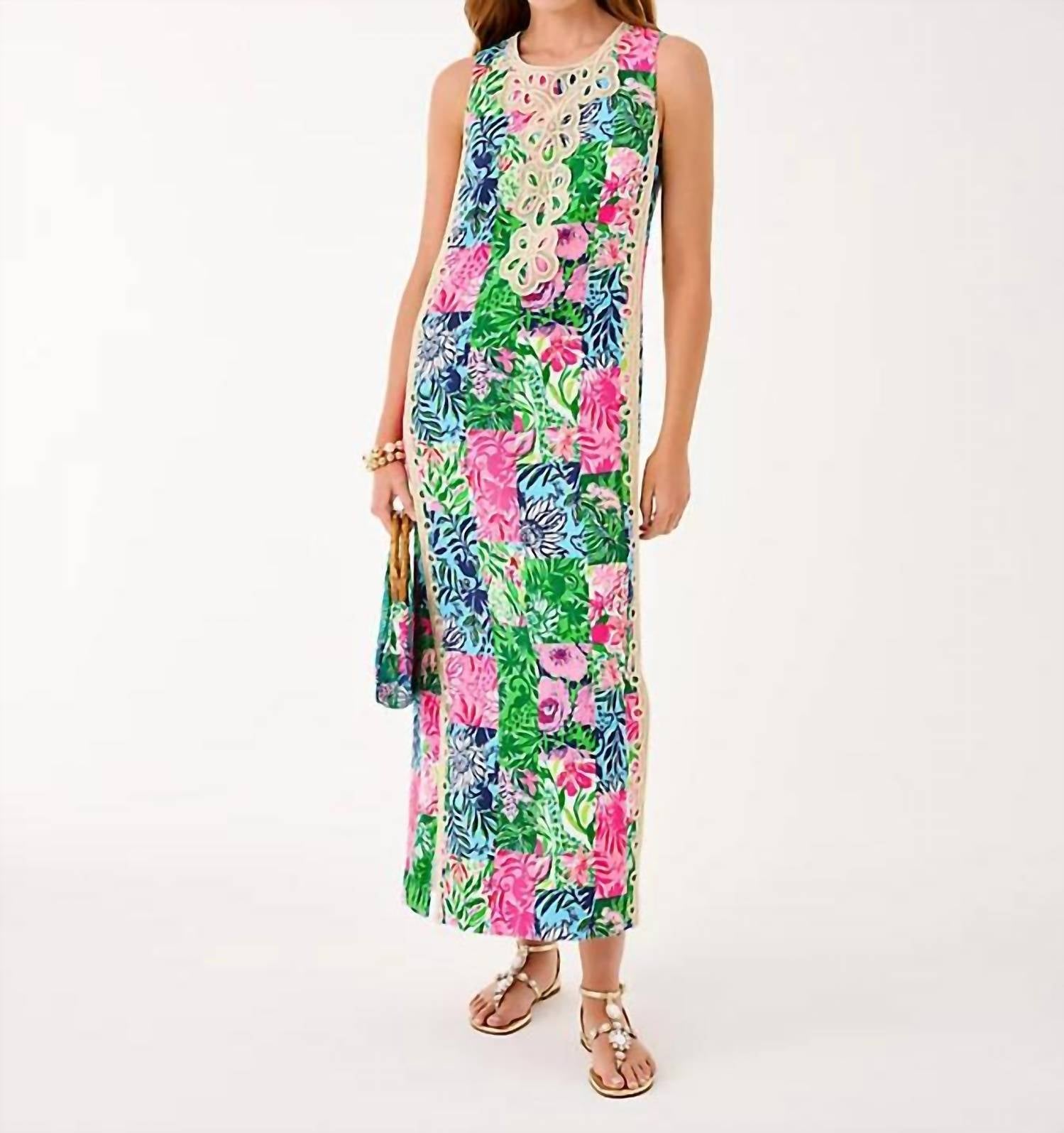 Style this maxi with your favorite statement necklace and sandals for the perfect look. Introducing the Women's Edita Maxi Shift Dress by Lilly Pulitzer, a striking piece to elevate your summer wardrobe. This sleeveless maxi dress boasts a straight fit and shift silhouette, featuring a crew neckline, side panel details with pockets, and eye-catching gold Lilly lace trim. Measuring 56" from the top of the shoulder to the hem, it fits snugly at the chest and hip while allowing more room at the waist, offering a bra-friendly wear. Crafted with a floral pattern, this boho chic dress is finished with a convenient zip closure, making it a perfect choice for your next vacation.