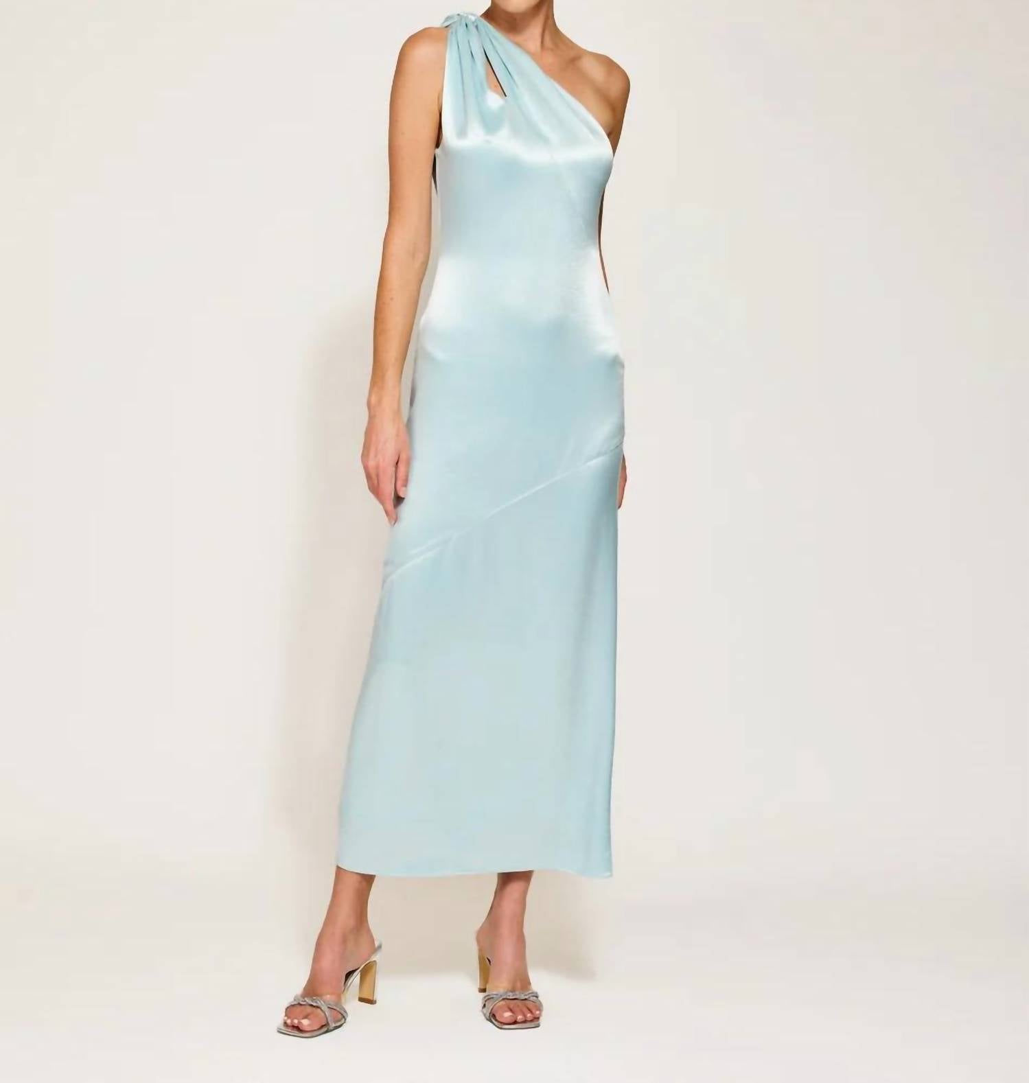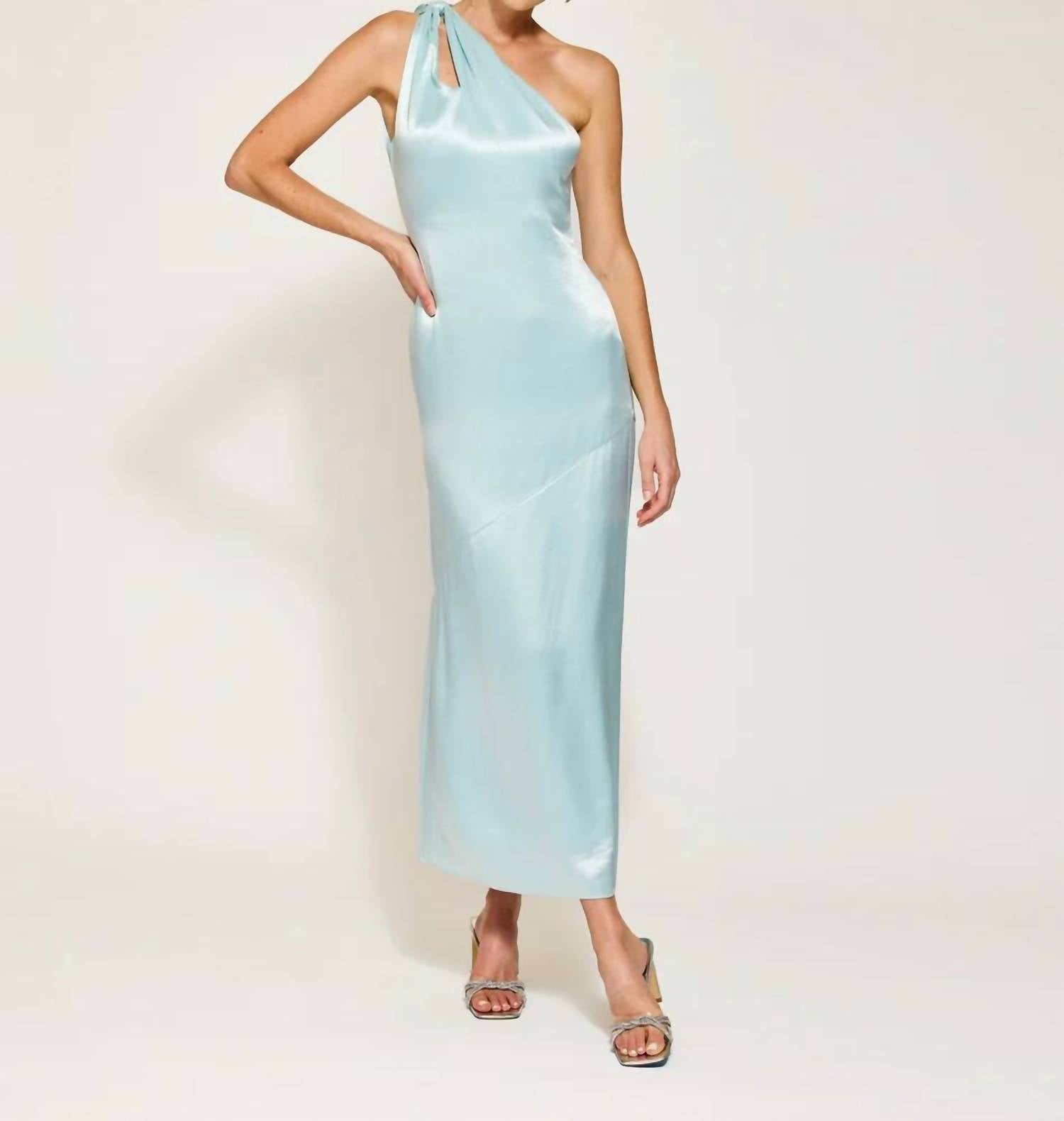 Style this maxi with your favorite statement necklace and sandals for the perfect look. Elevate your holiday party look with the Daniella Asymmetrical Dress by Line and Dot, a stunning mint maxi. This dress is crafted from luxurious satin fabric and features a chic one-shoulder design with a stylish cut-out detail. Closure: Side hook-and-eye and hidden zip. Care: Dry clean only. Perfect for standing out at any quiet luxury event.