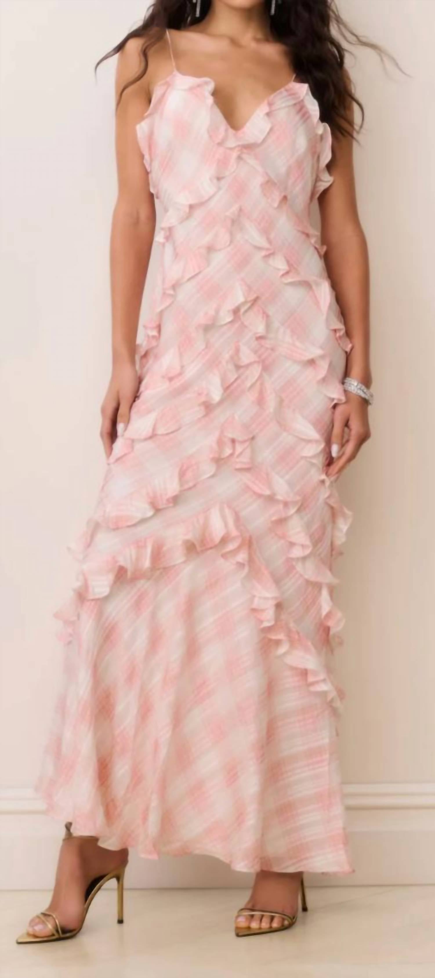Who doesn't love a good maxi dress? This one you'll be reaching for season after season. Embrace timeless charm with the Ellietta Tartan Ruffle Maxi Dress by LoveShackFancy, a stunning vacation-ready piece in a delightful pink Neapolitan plaid. The spaghetti straps highlight a V-neck and daring V-back, creating an elegant A-line silhouette accentuated by romantic ruffle trims. Composed of 60% Silk, 38% Viscose, and 2% Metallic, this fully lined maxi delights with its fluid movement and luxurious feel. With a convenient pull-on closure, remember this head-turner is best maintained with dry cleaning.