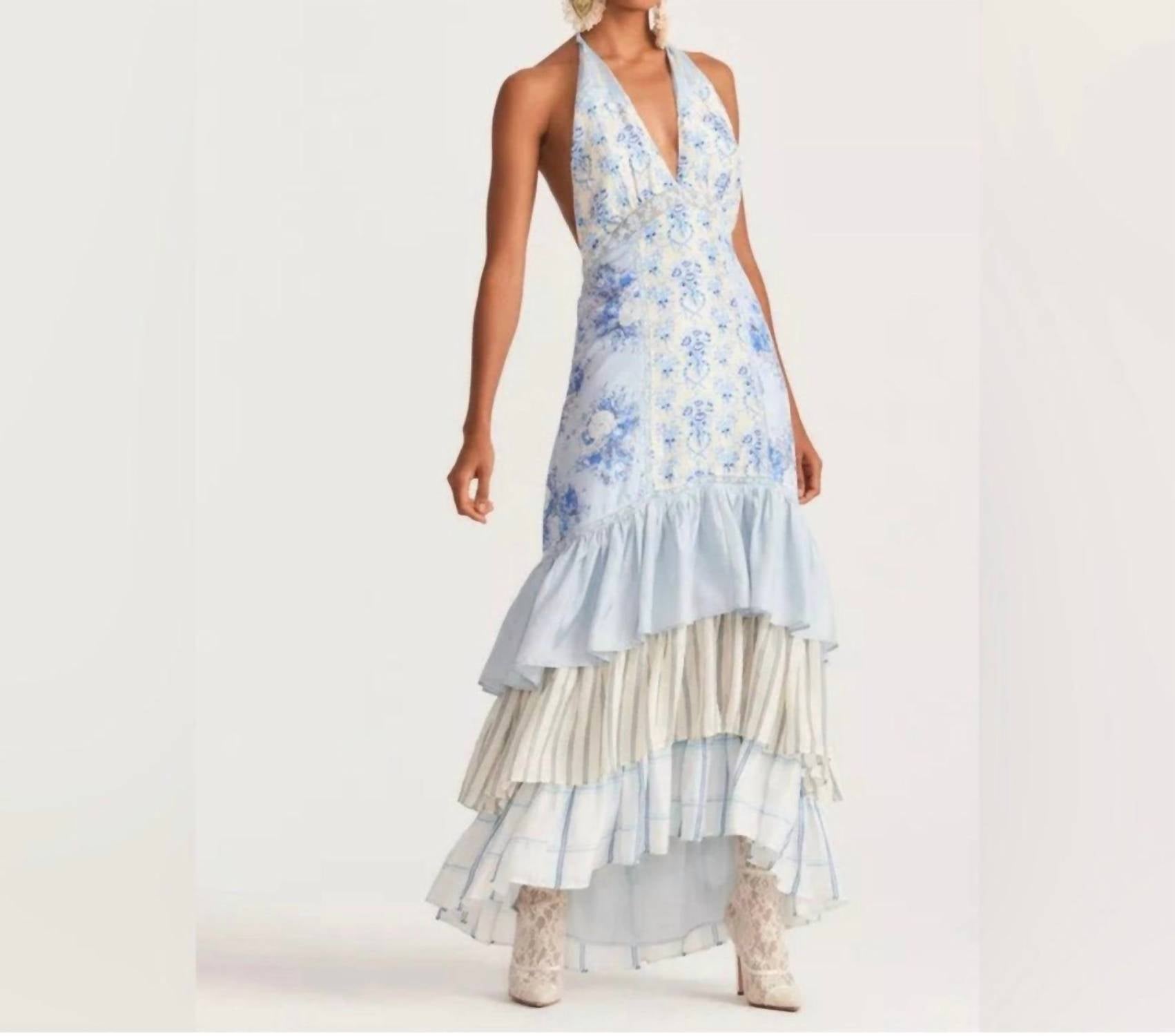 A maxi dress that is just as cute as it is comfortable. Introducing the Sicilia Silk Maxi Dress by LoveShackFancy, a stunning choice for your holiday party ensemble. This sleeveless maxi dress, crafted from 100% silk, showcases a graceful A-line silhouette in a floral Ocean Spray Mist pattern. Designed with a chic halter neckline, it embodies the quiet luxury trend, perfect for a spring or Easter occasion. Care: Dry clean only.