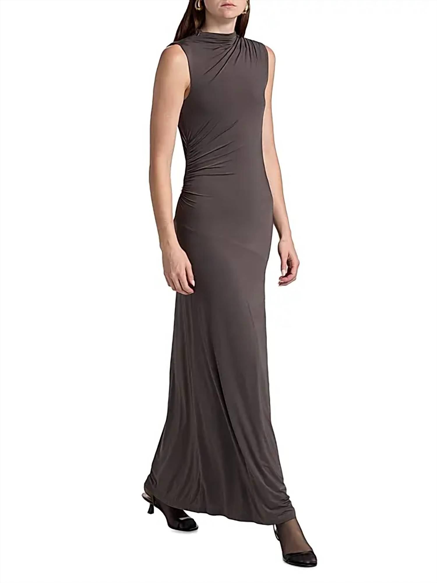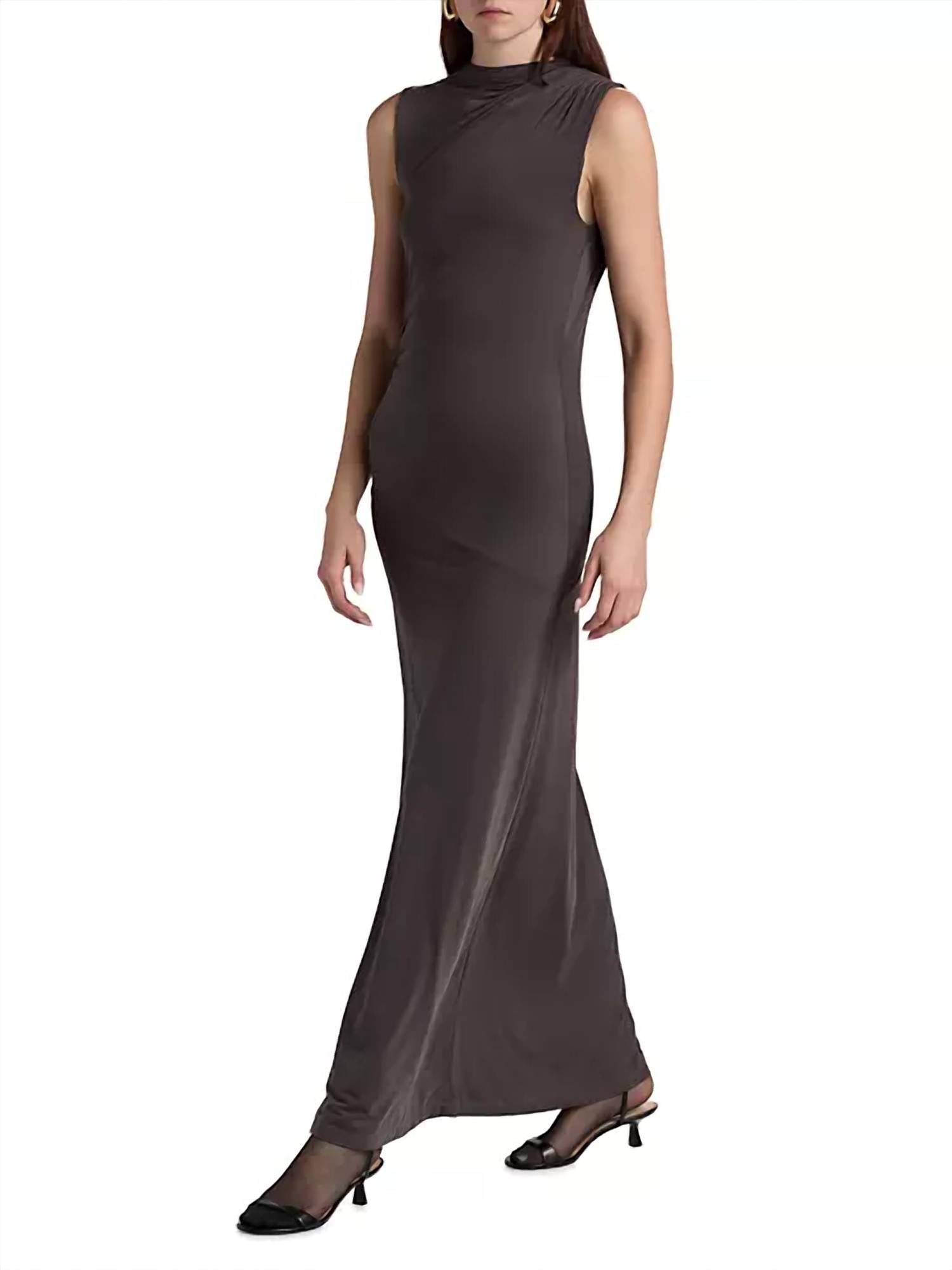 Style this maxi with your favorite statement necklace and sandals for the perfect look. The Mick Malu Long Dress by Maria Cher combines modern elegance with a touch of edgy style, perfect for any dinner party. This sleeveless, grey bodycon maxi dress is crafted from a smooth blend of 86% polyamide and 14% elastane, featuring a mockneck and asymmetric gathered detailing for added sophistication. Its diagonal-cut skirt adds graceful movement, while the pull-on closure ensures a seamless fit. Care for this stunning piece with dry cleaning to keep its refined texture and shape intact.