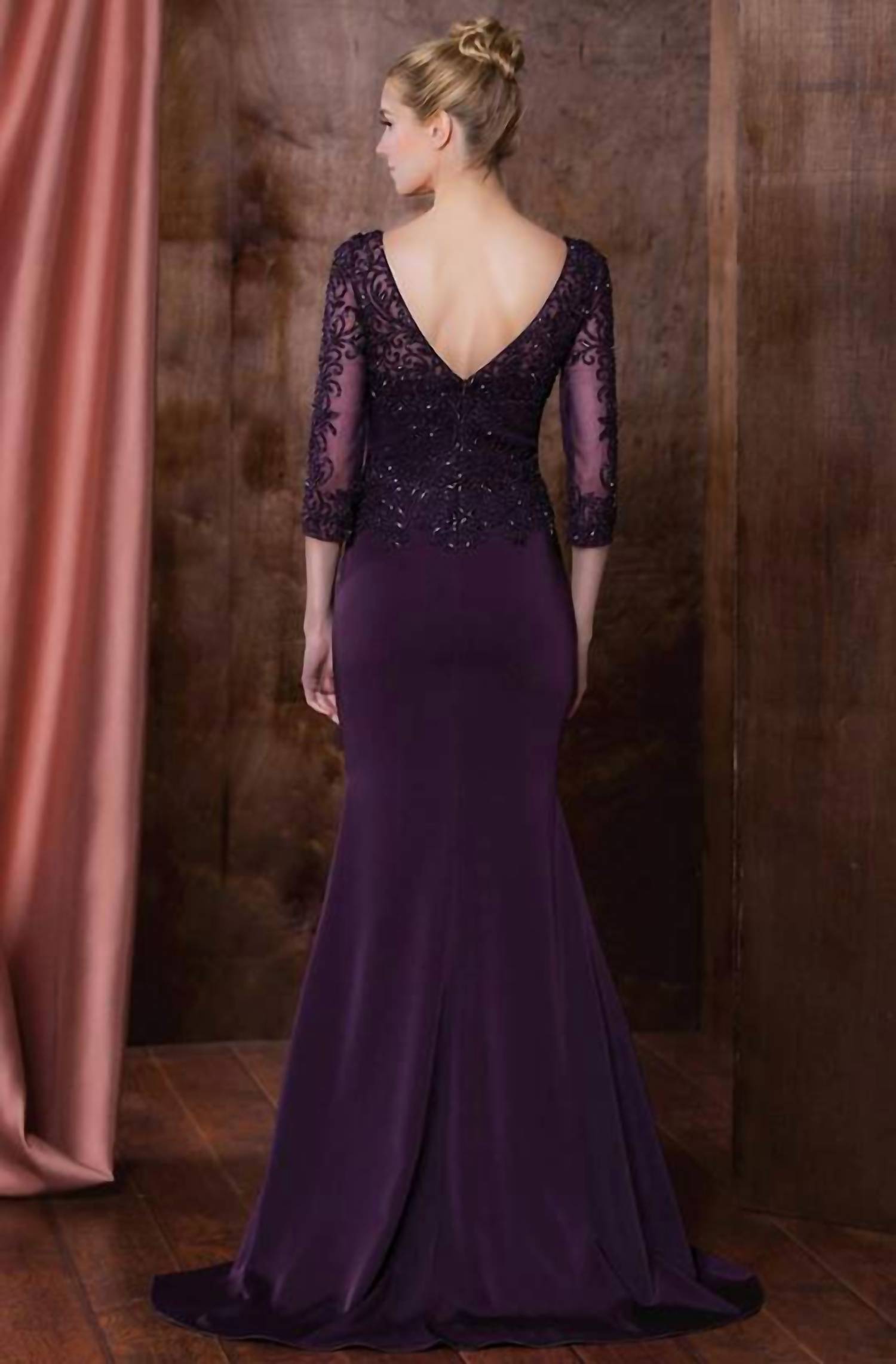Style this maxi with your favorite statement necklace and sandals for the perfect look. Introducing the Tracey Maxi Dress by Marsoni by Colors, a perfect blend of elegance and sophistication, ideal for wedding occasions. This plum mermaid silhouette gown features three-quarter sleeves and a unique boatneck design, accented with grandiose beading across the bodice and a sheer cutout below the clavicle. The textured fabric and low-cut back add a touch of refined allure, while the zip closure ensures a seamless fit. Embrace quiet luxury this spring with this stunning piece, a testament to modern elegance without compromising on understated style.
